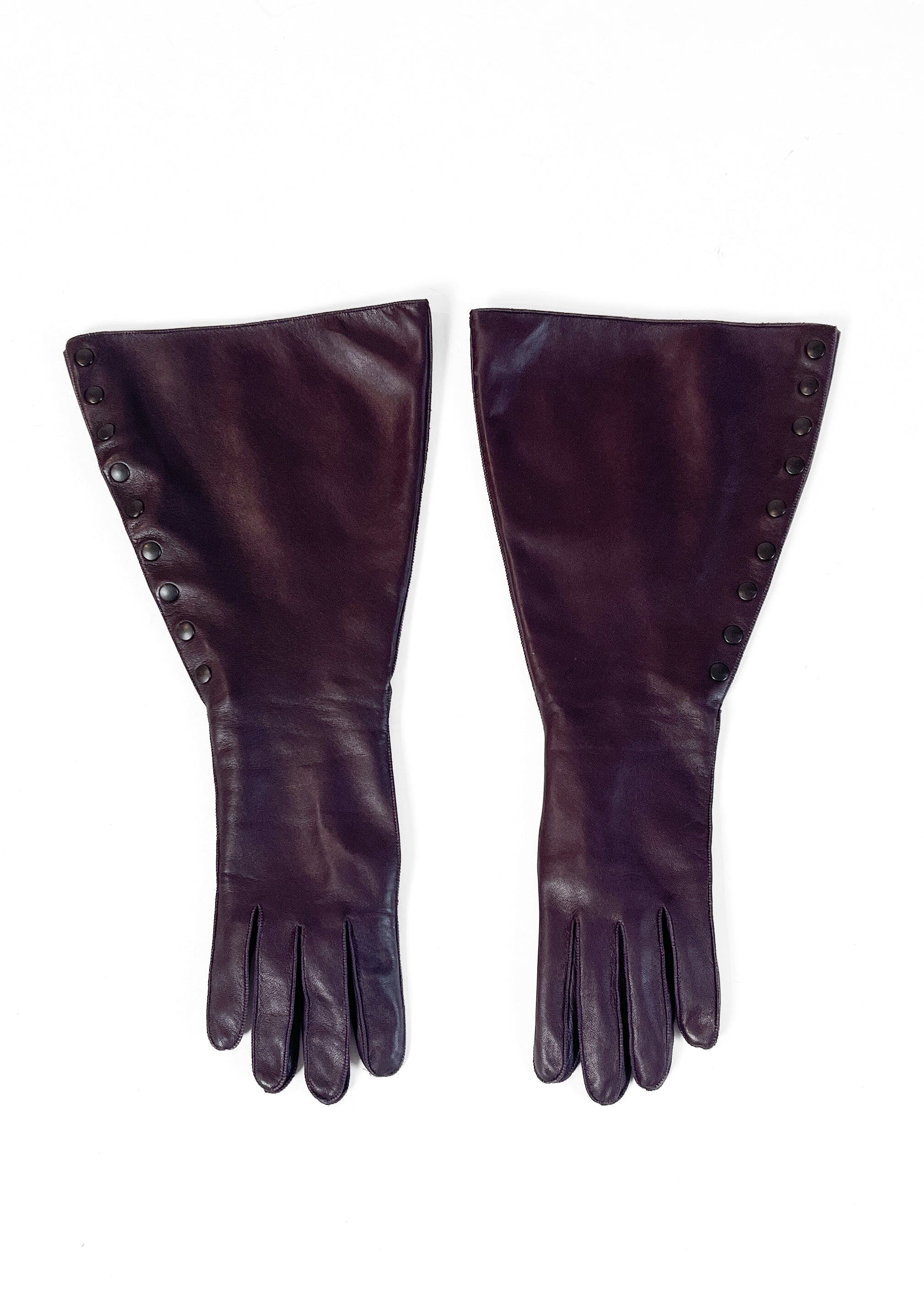 Made from extremely soft nappy leather in a beautiful shade of dark plum. Nine snap fasteners on the side of each glove. Made in France. Original retail price $1390.