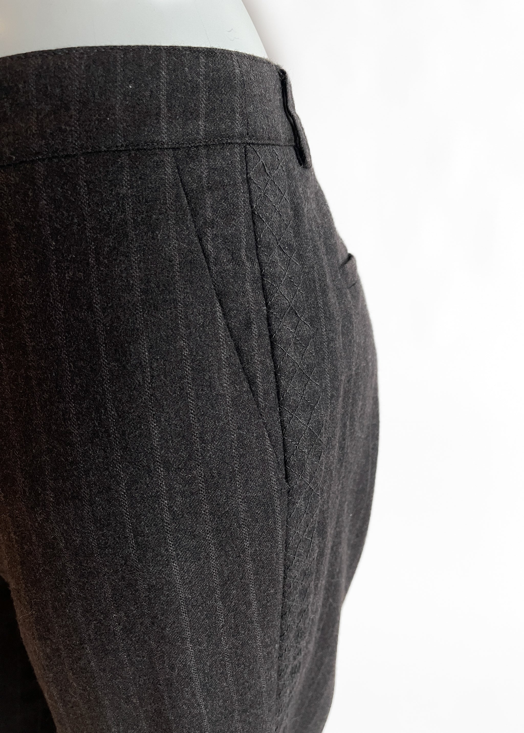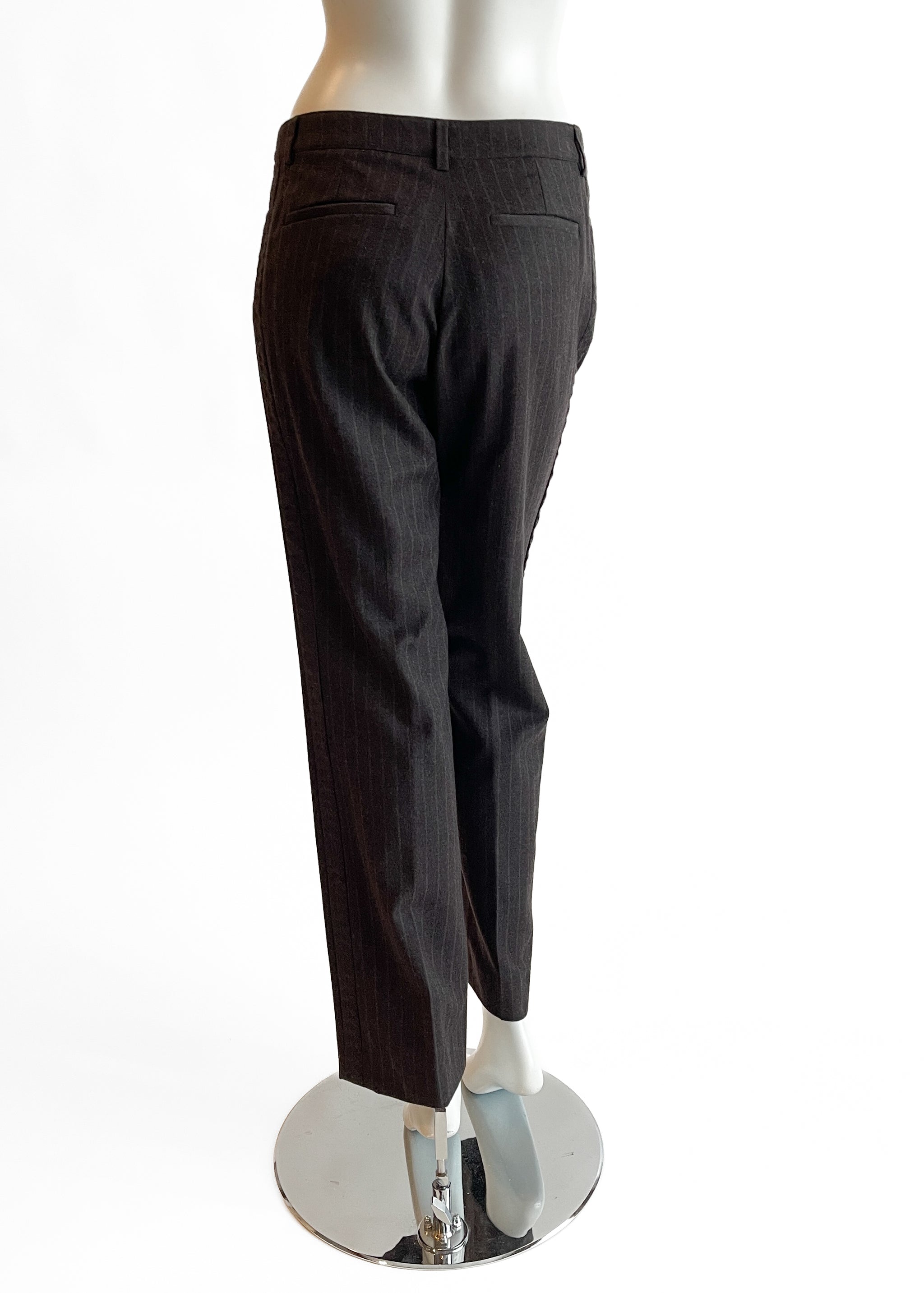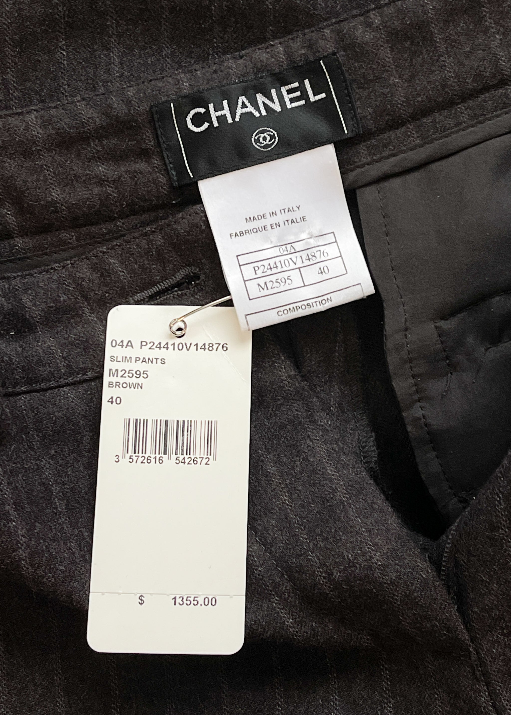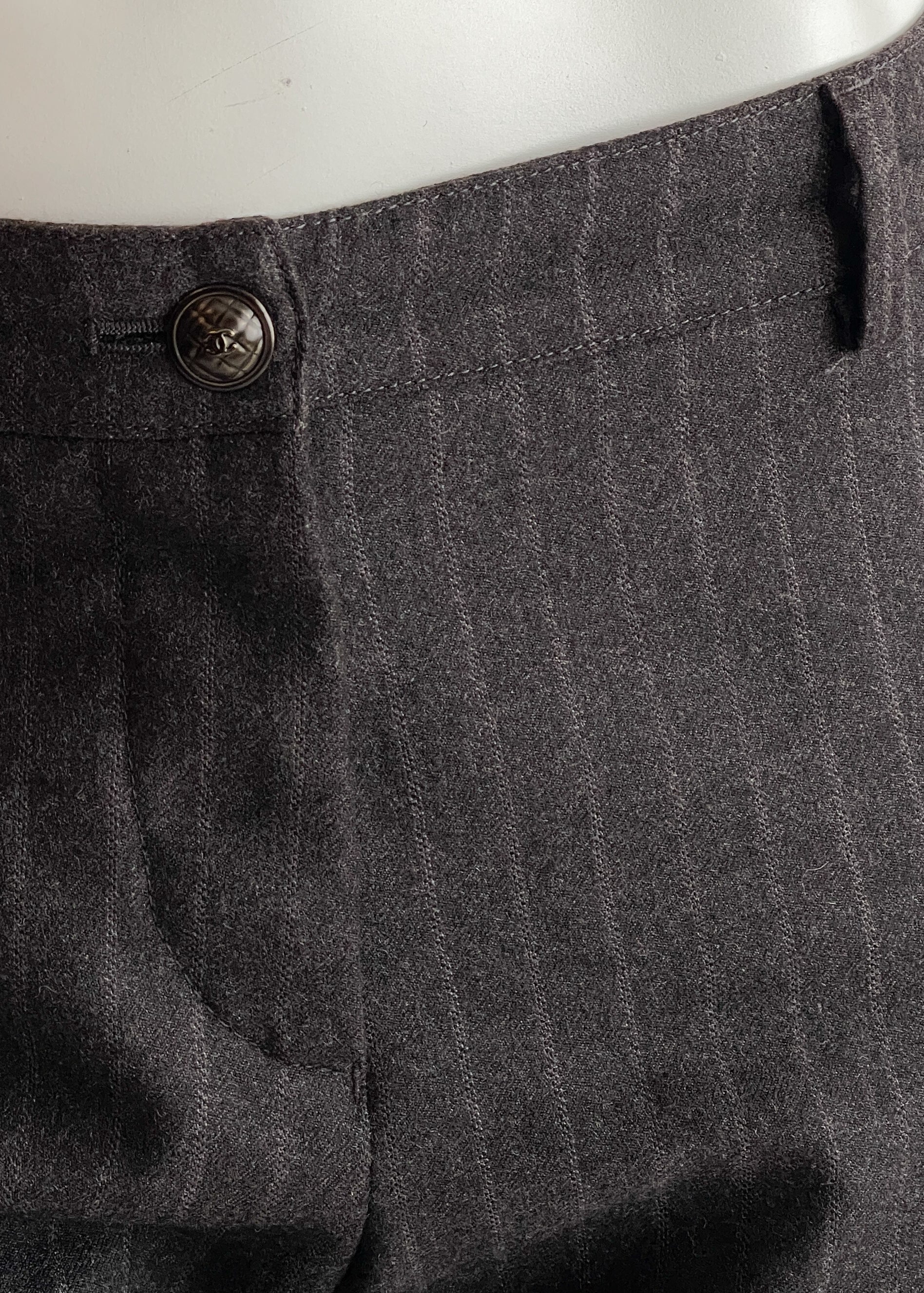 Lightweight brown-grey wool with white pinstripes. Straight leg. Unlined. Chanel logo button. Made in France. Designed by Karl Lagerfeld. Original price was $1355.