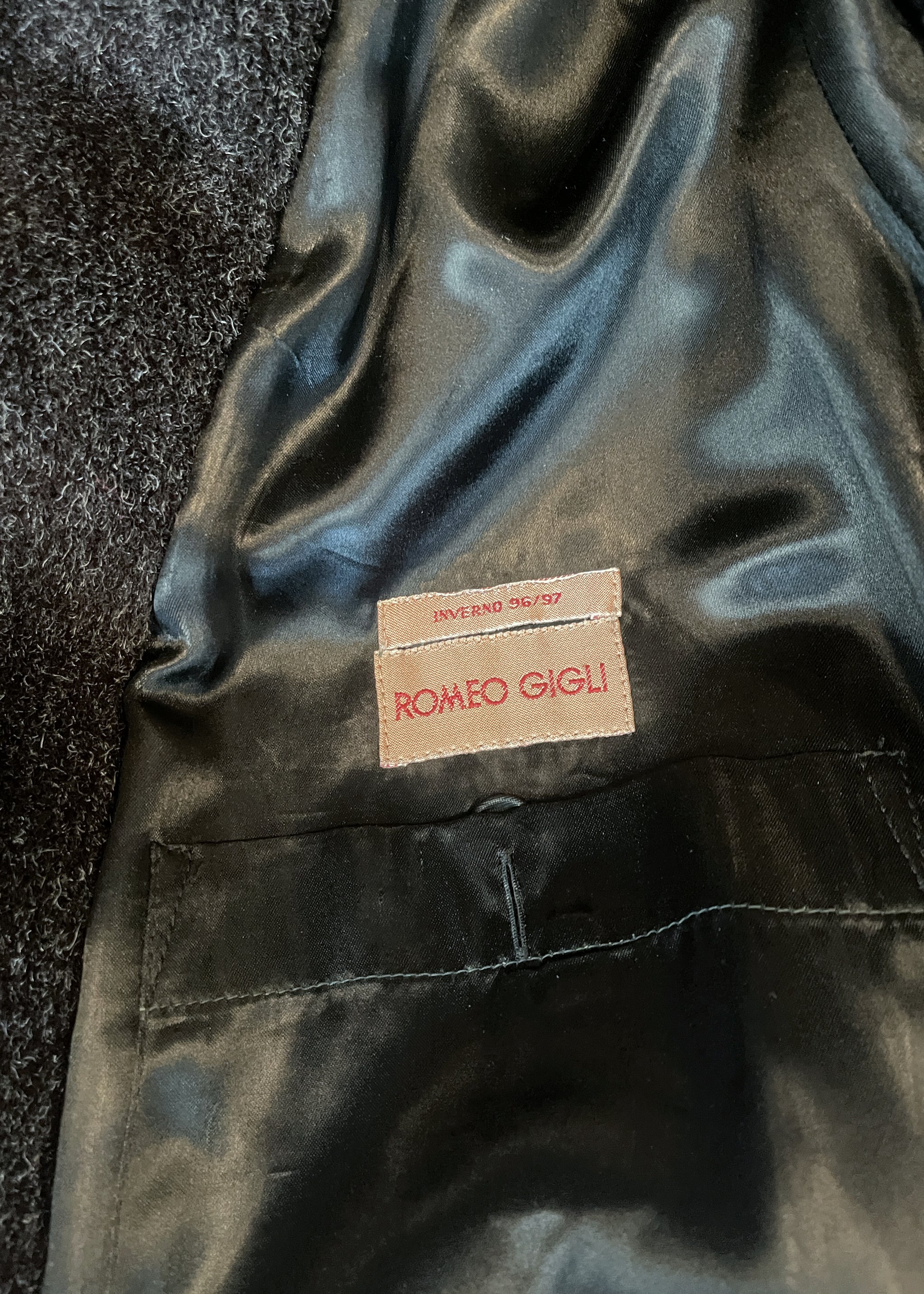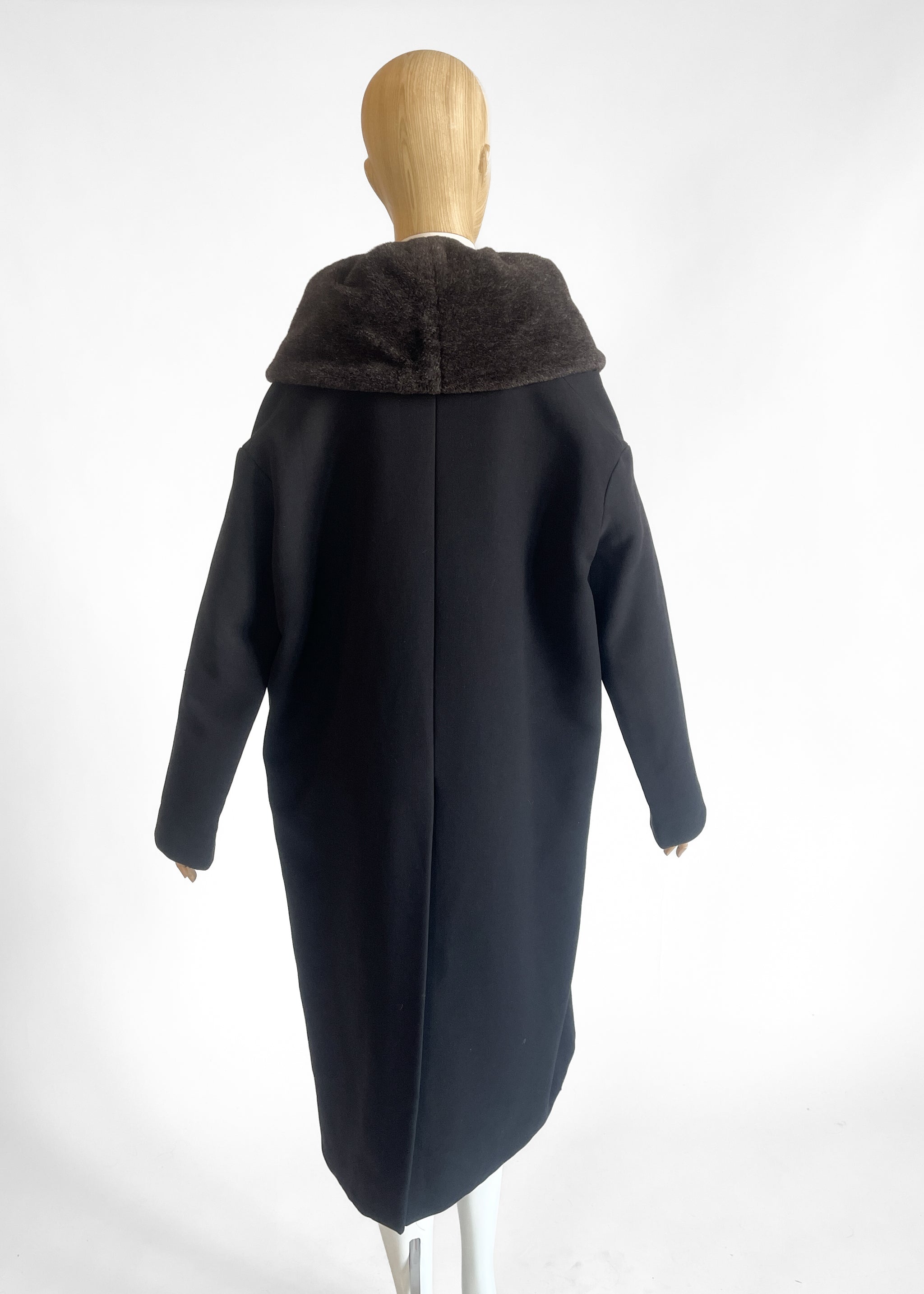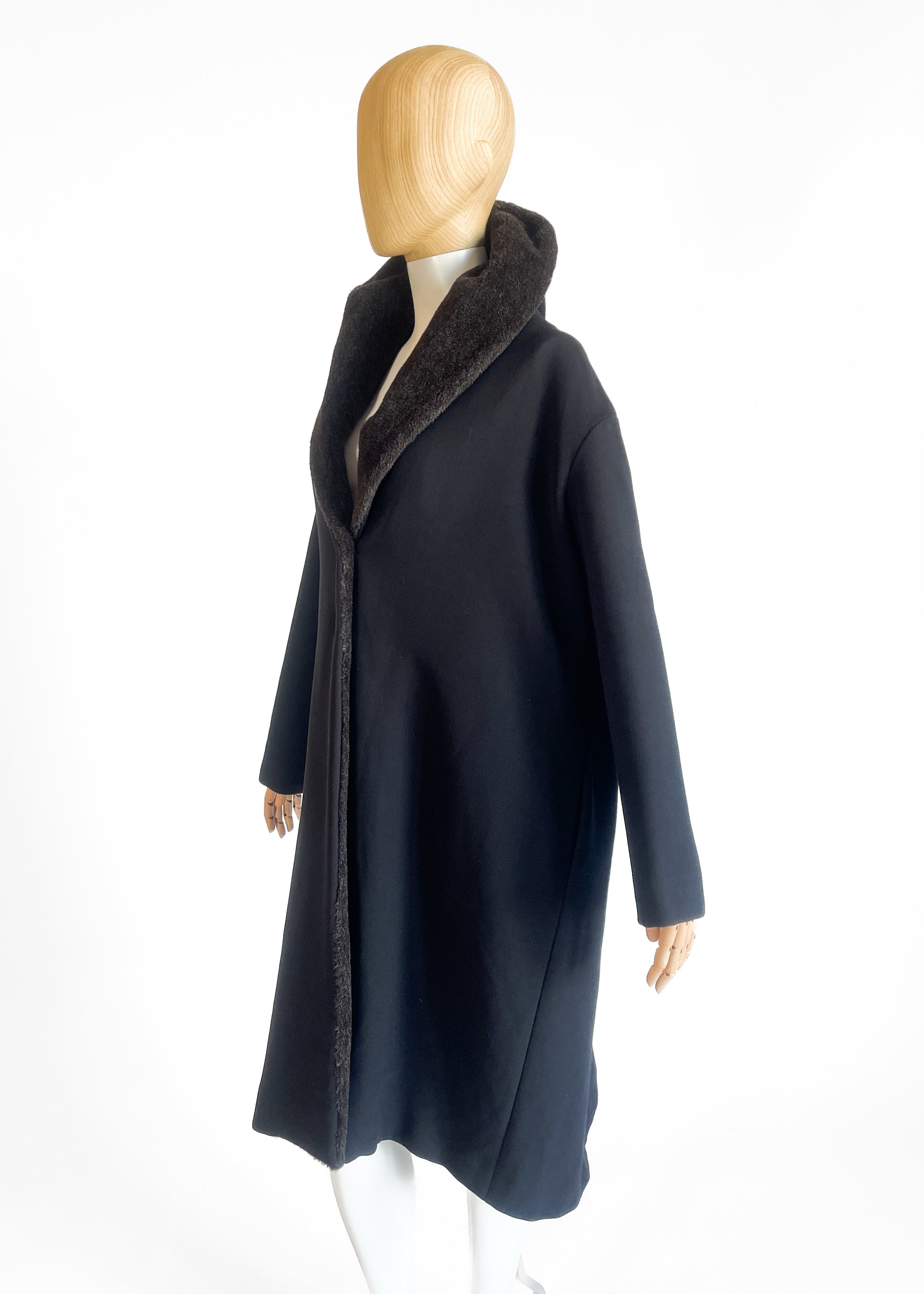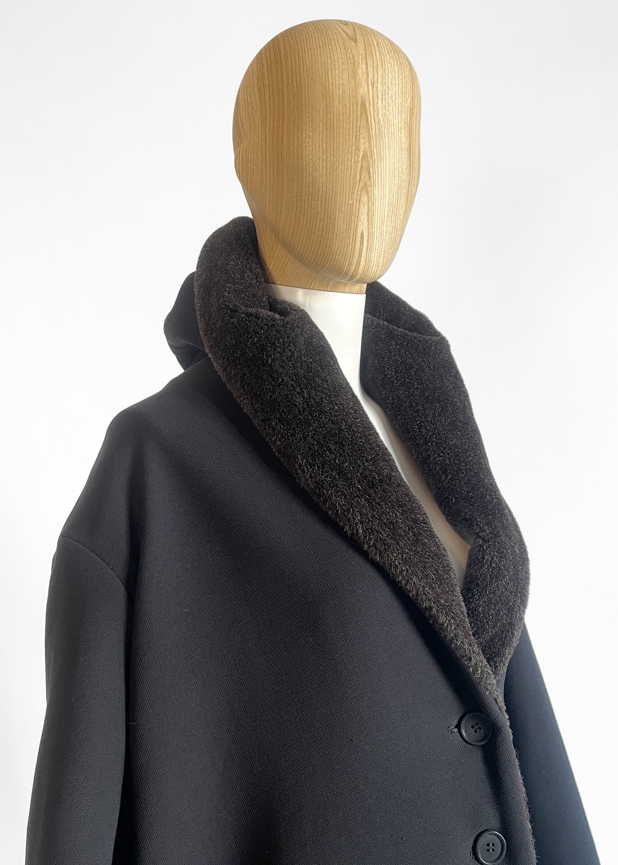 Black wool gabardine.  Oversized menswear-style silhouette.  Shawl collar with faux fur trim.  Two button closure.  Hidden seam pockets and two interior pockets.  Satin lining.  Made in Italy.