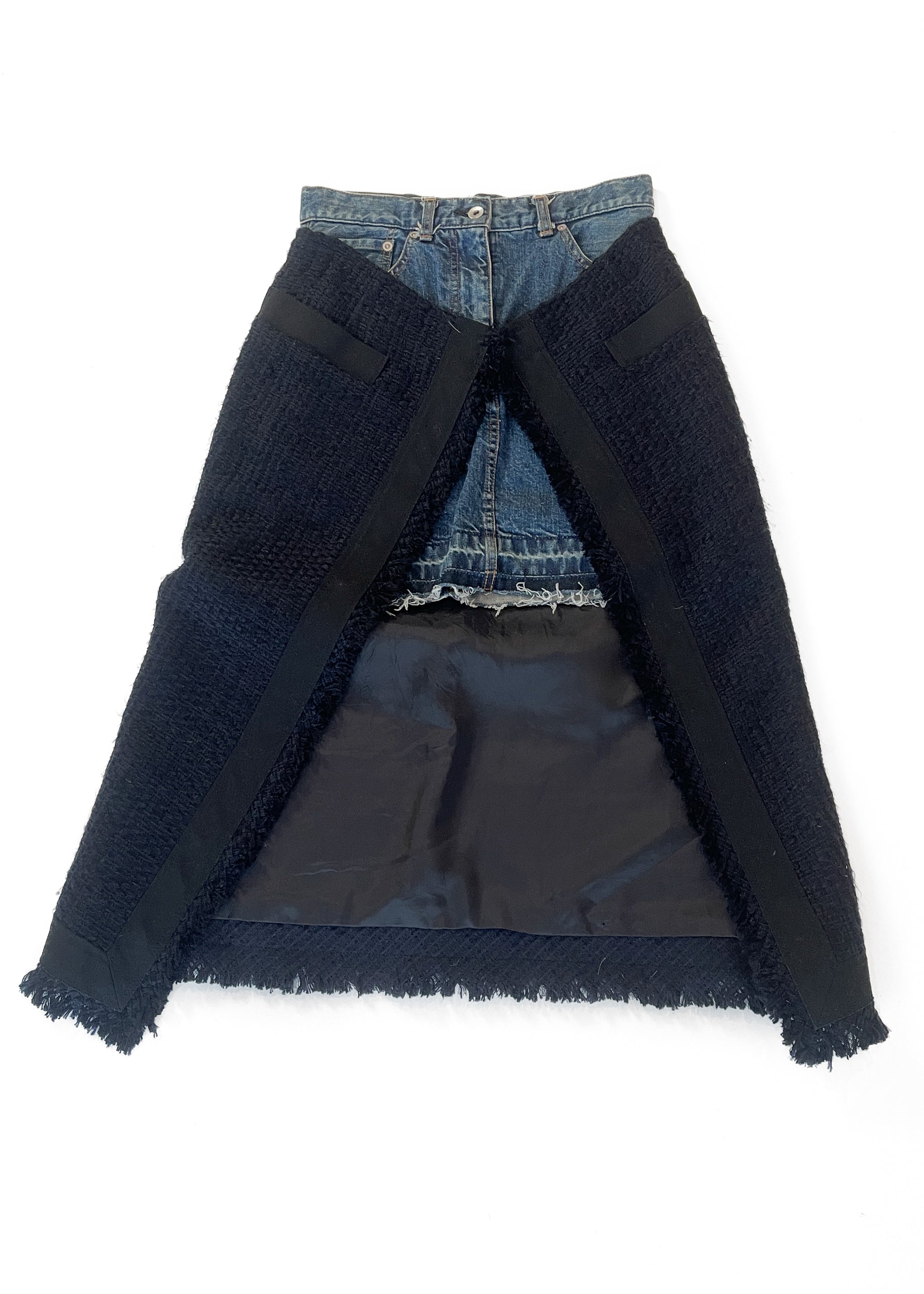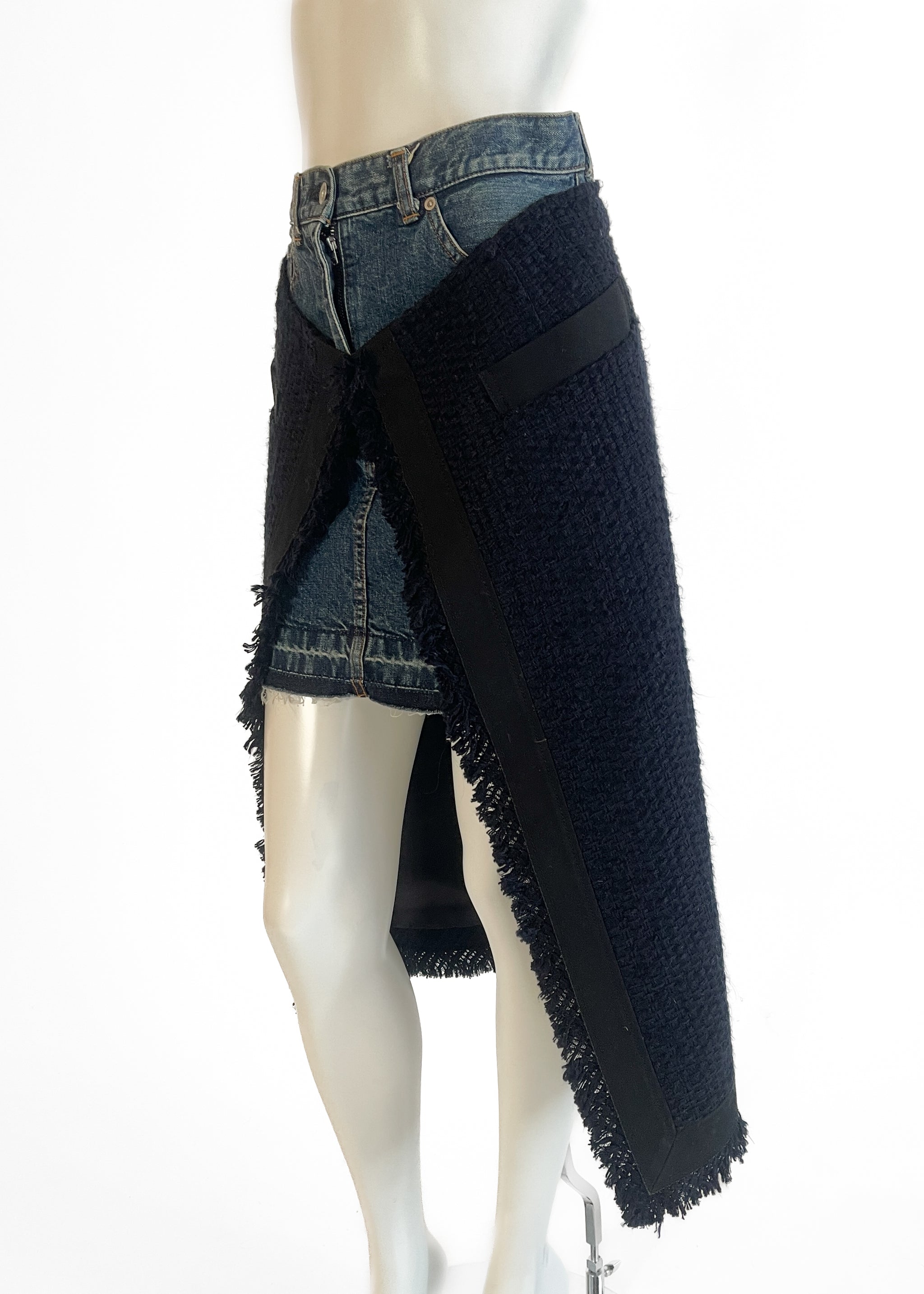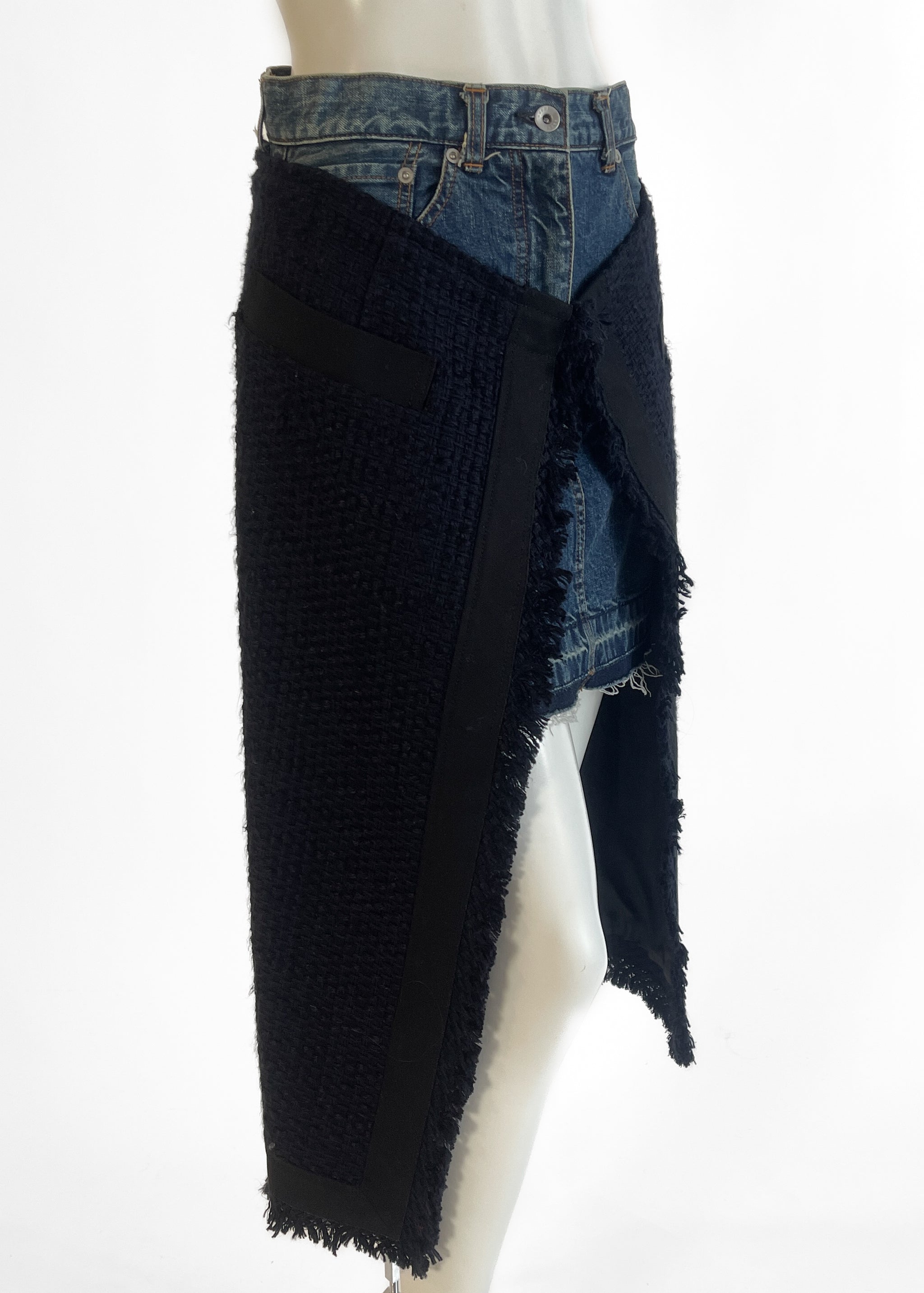 Slightly distressed denim mini skirt with a black wool tweed panel overskirt. Made in Japan. Original retail price $1075.DETAILSLabel: SacaiCirca: 2019Condition: Overall excellent. The skirt shows light, normal wear with no issues to note. MEASUREMENTS: Waist: 28"Hips: 36"Length: 17" shortest ; 34 longestMarked size 1