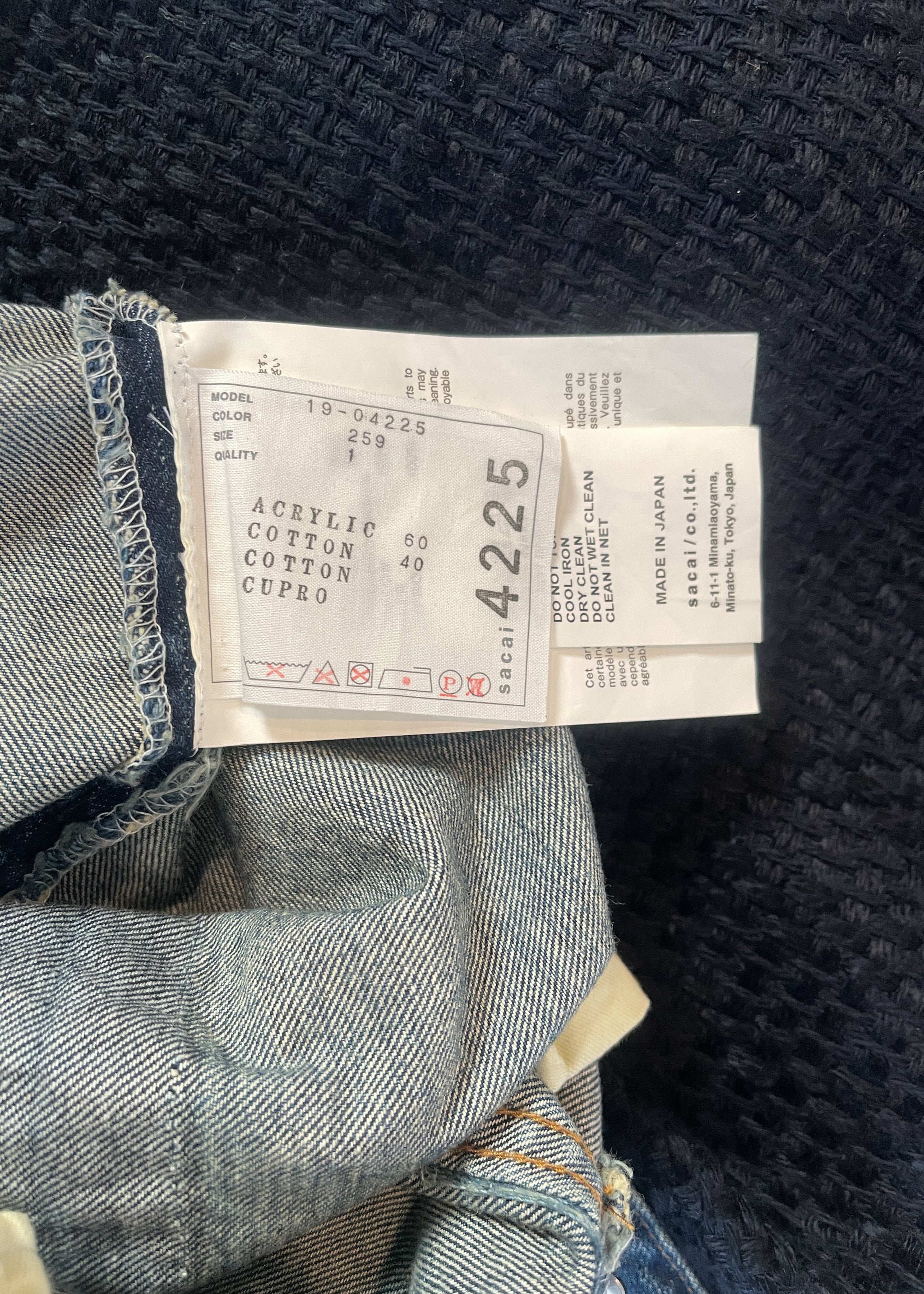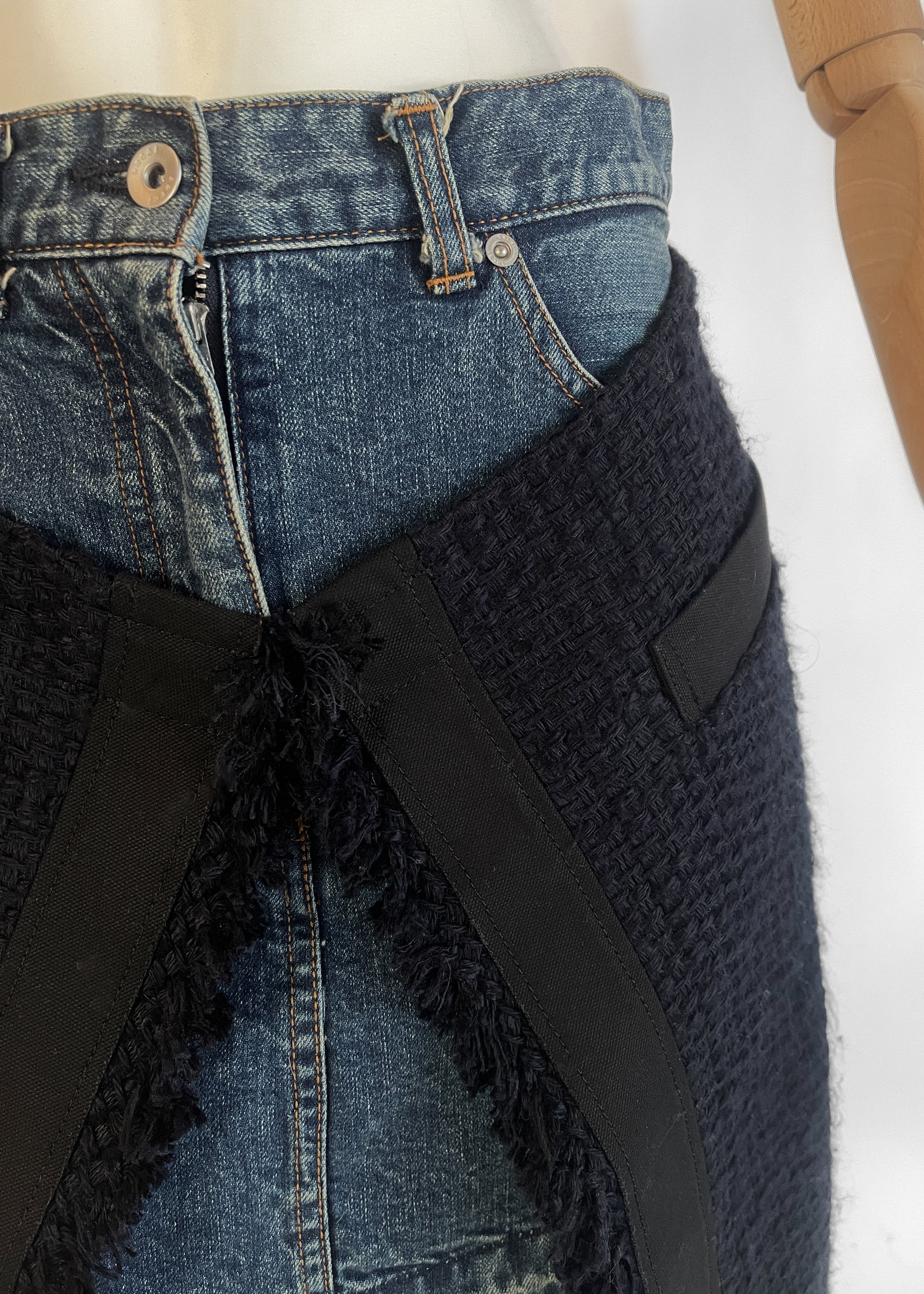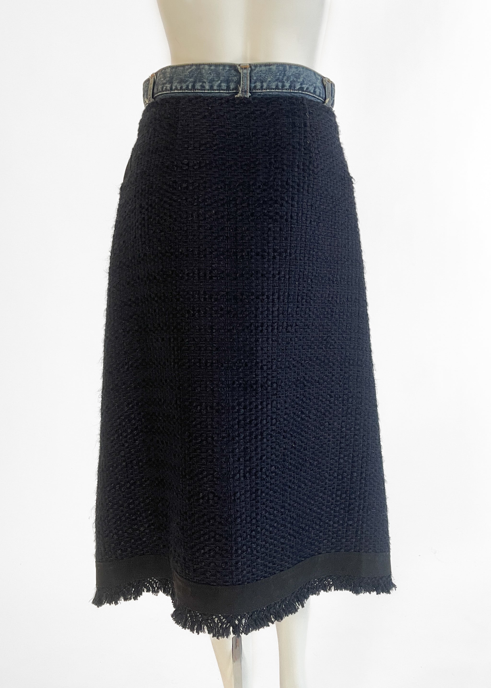 Slightly distressed denim mini skirt with a black wool tweed panel overskirt. Made in Japan. Original retail price $1075.DETAILSLabel: SacaiCirca: 2019Condition: Overall excellent. The skirt shows light, normal wear with no issues to note. MEASUREMENTS: Waist: 28"Hips: 36"Length: 17" shortest ; 34 longestMarked size 1
