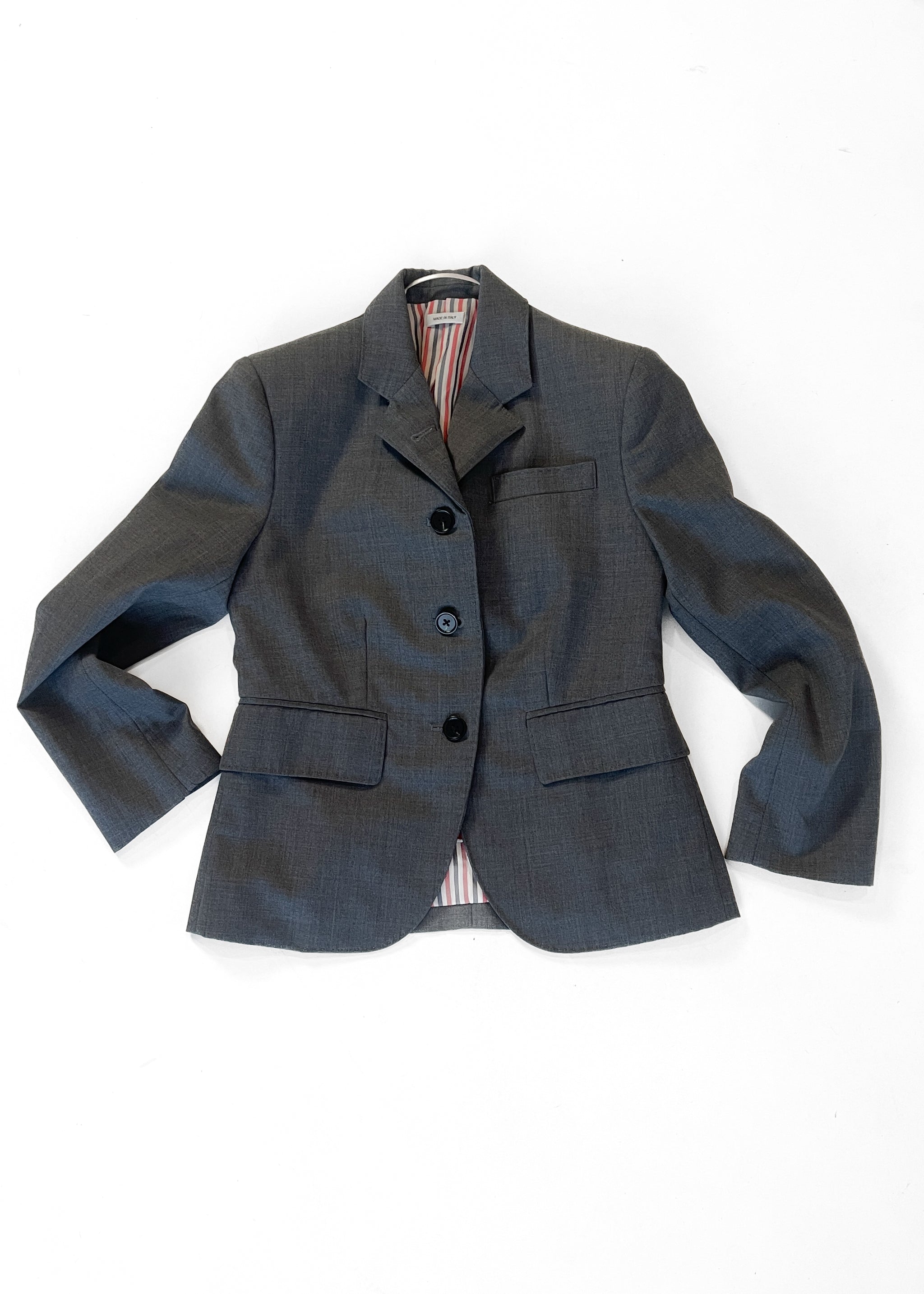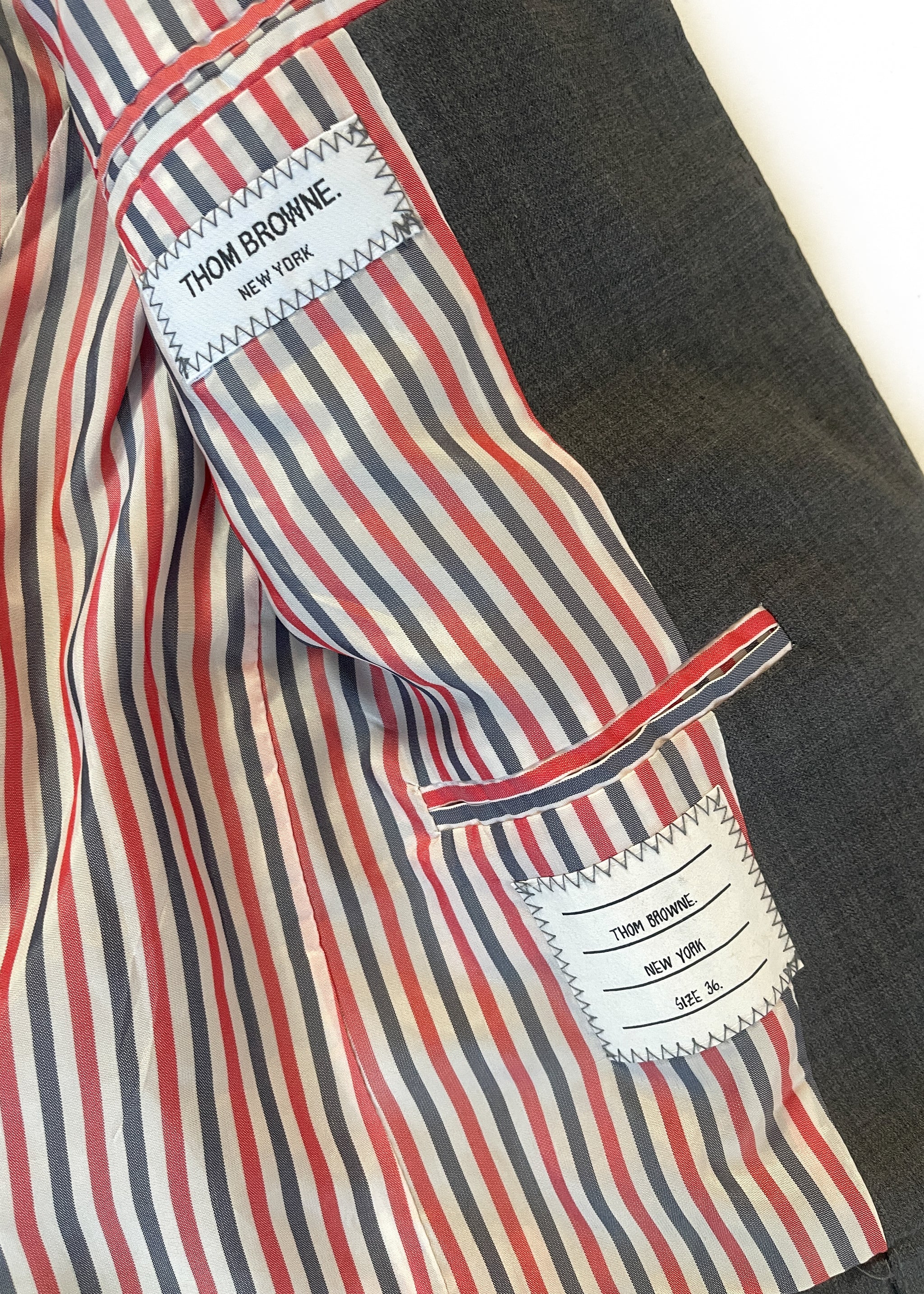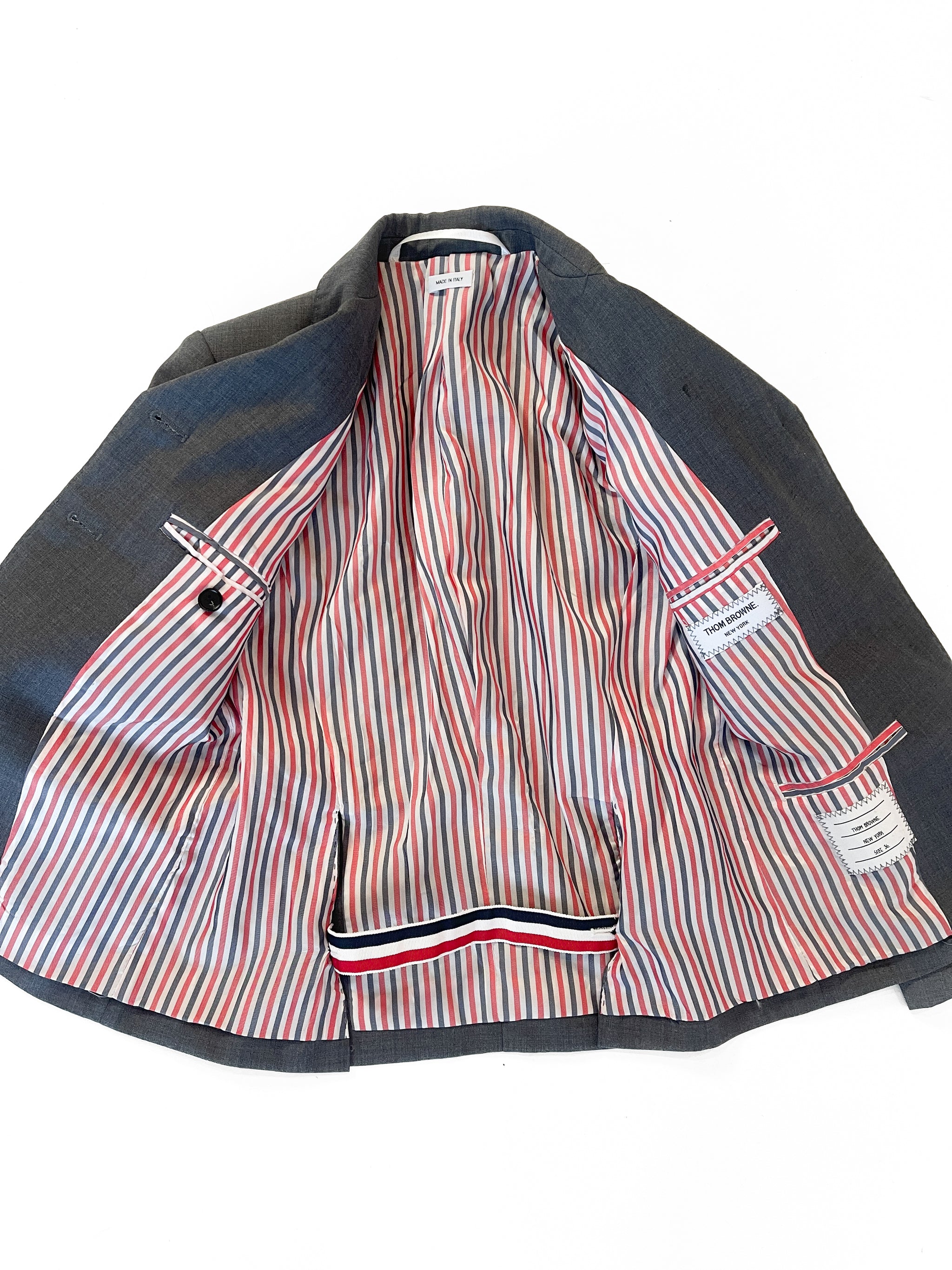 Lightweight, grey wool suiting twill.  Shrunken fit that is "taken from punk influences while remaining true to Thom Browne classic heritage" according to the company's website.  Button closure.  Striped lining.  Made in Italy.