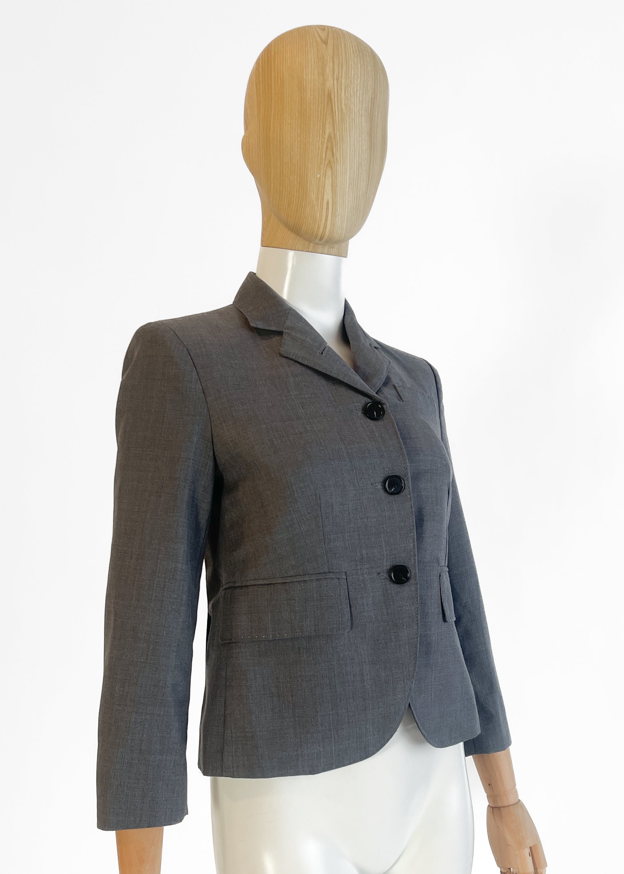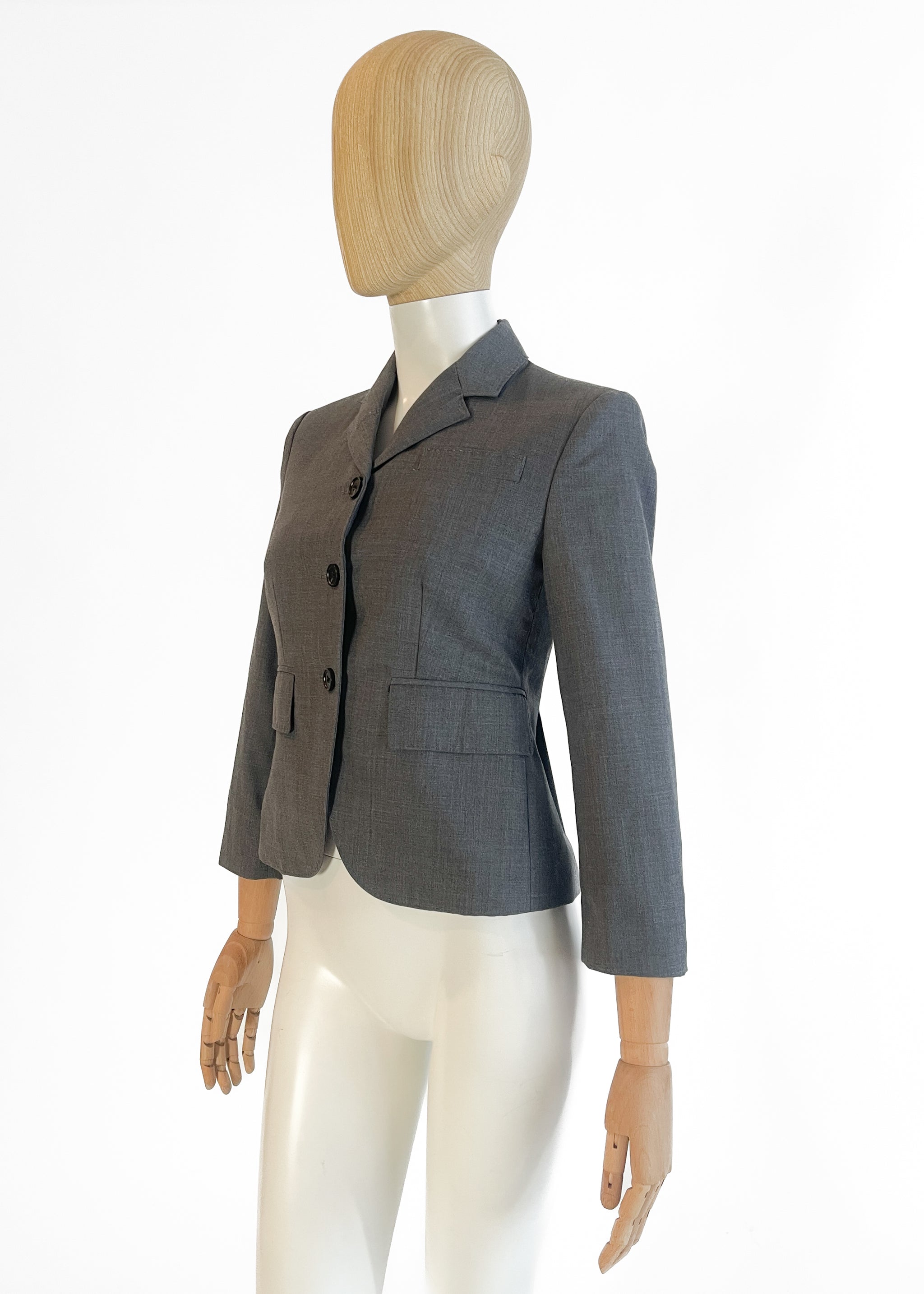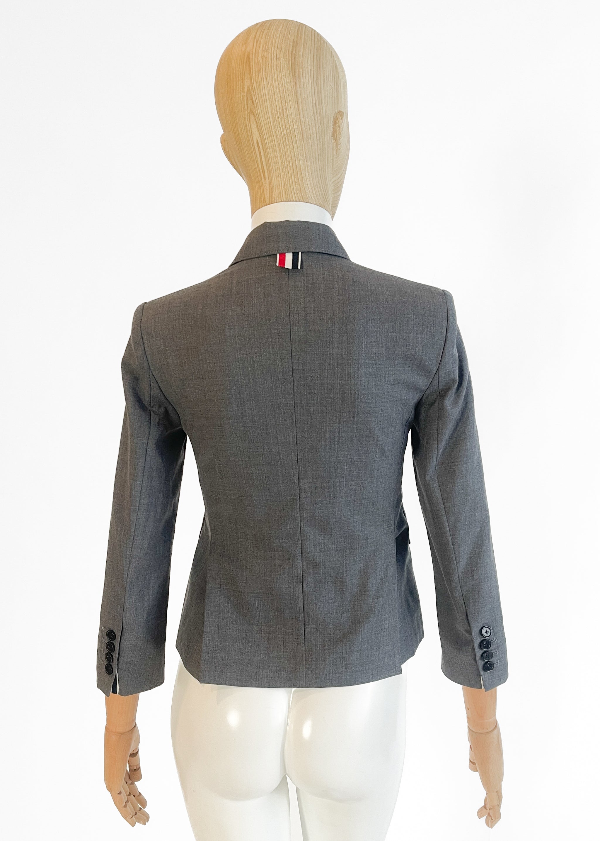 Lightweight, grey wool suiting twill.  Shrunken fit that is "taken from punk influences while remaining true to Thom Browne classic heritage" according to the company's website.  Button closure.  Striped lining.  Made in Italy.