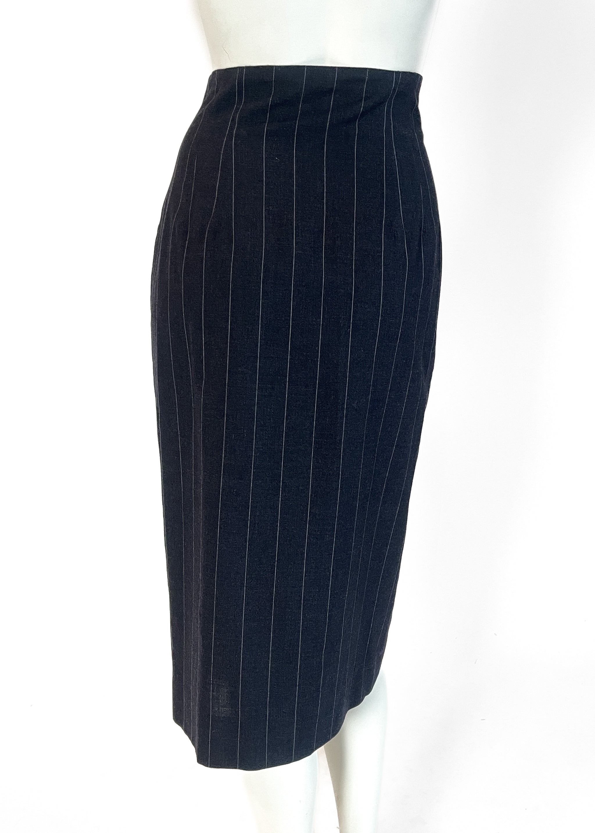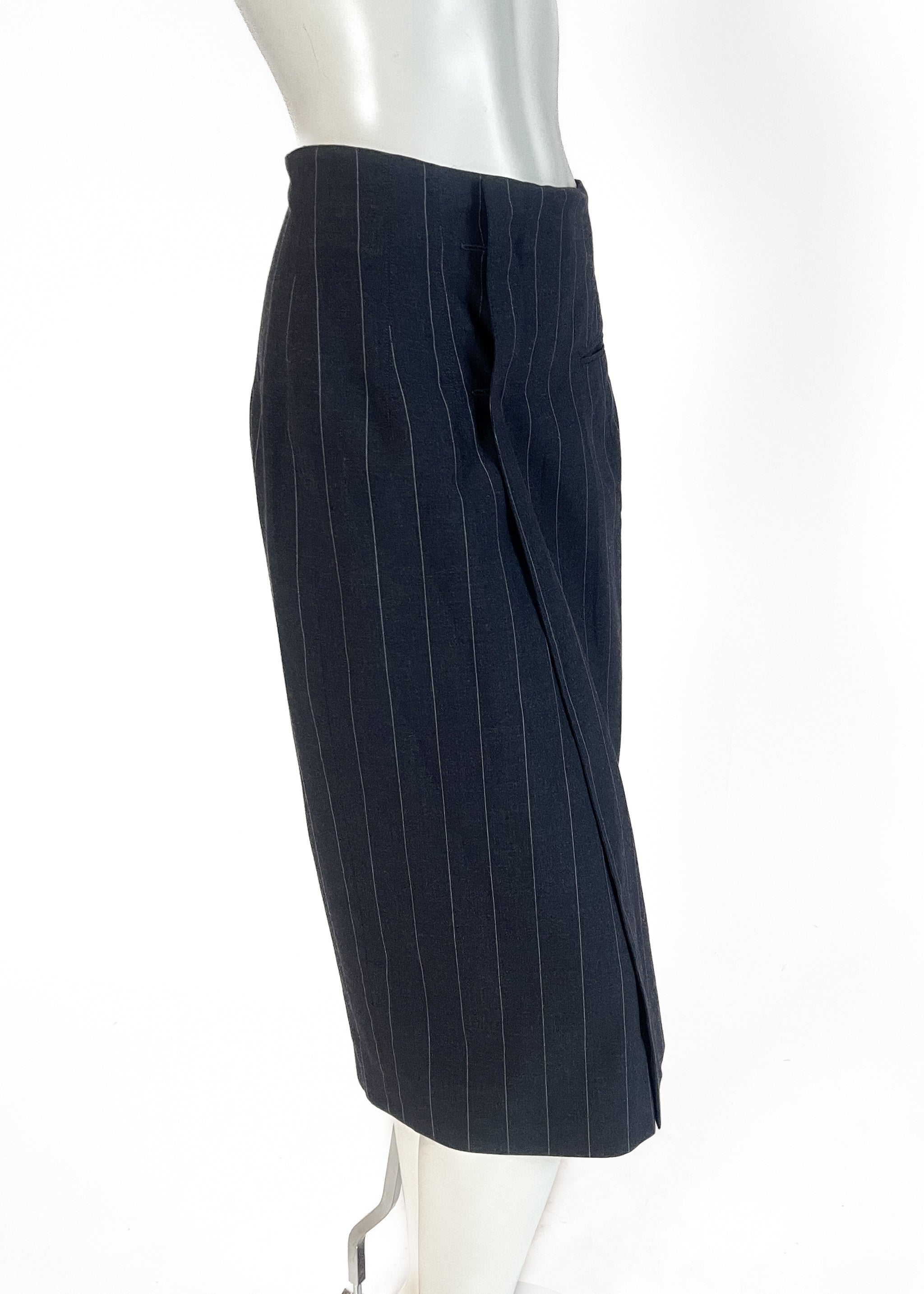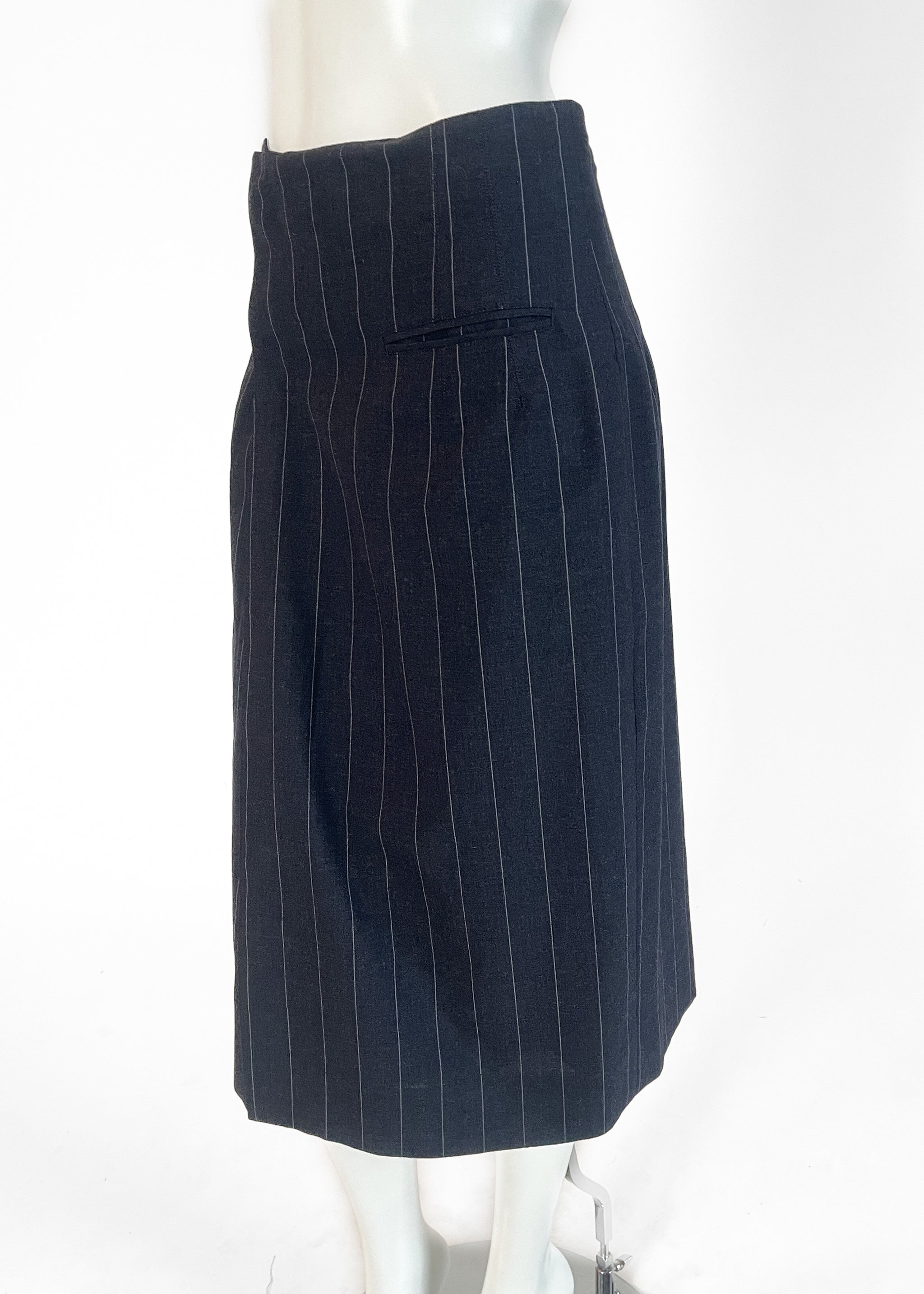 An early example of JPG's interest in classic suiting-made-modern. Dark charcoal grey pinstripe suiting. Wrap skirt with a button closure. Slit pocket. Lined. Made in Italy. Designed by John Paul Gaultier. The skirt can be worn with the pocket in the front or in the back...reversible.