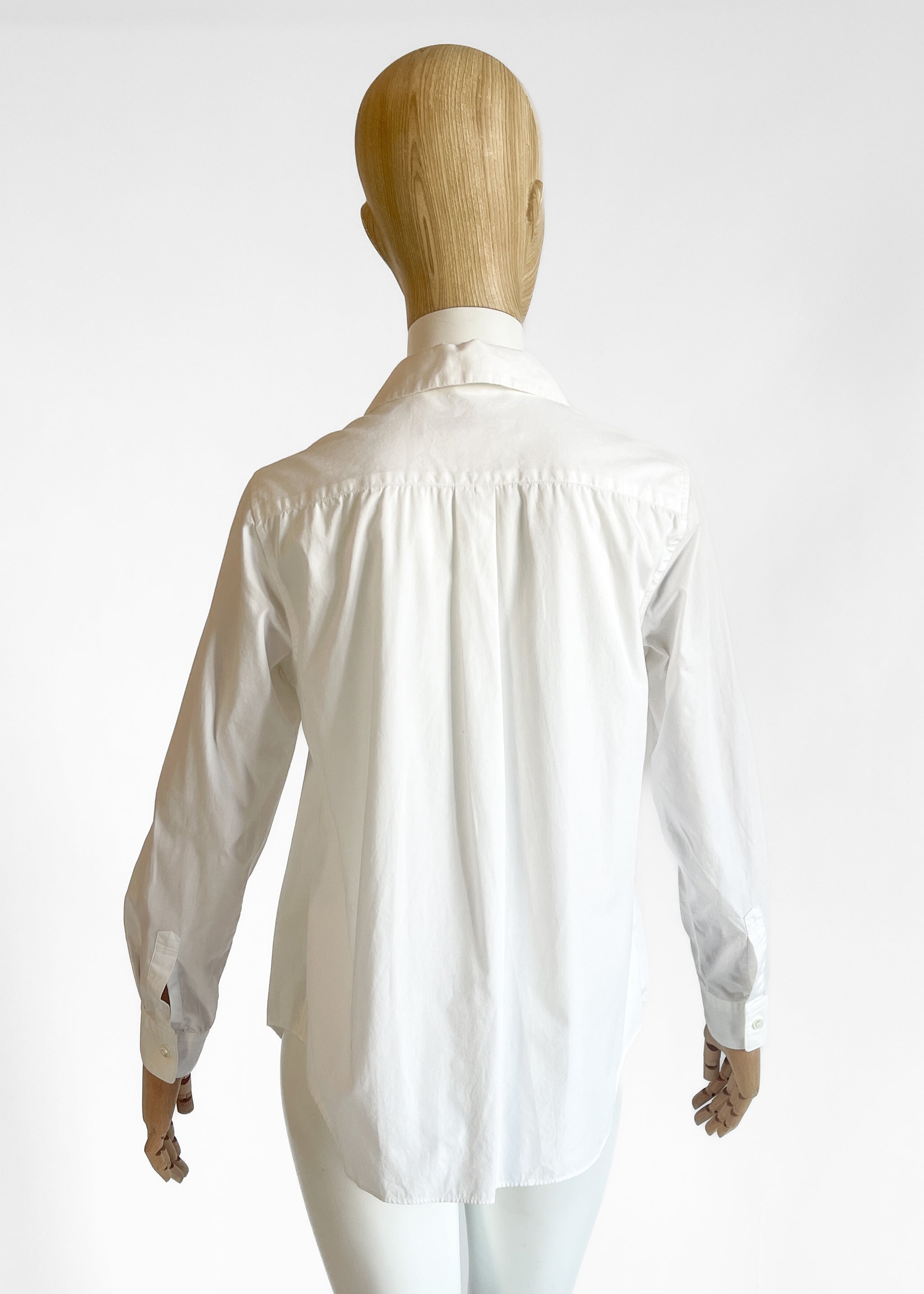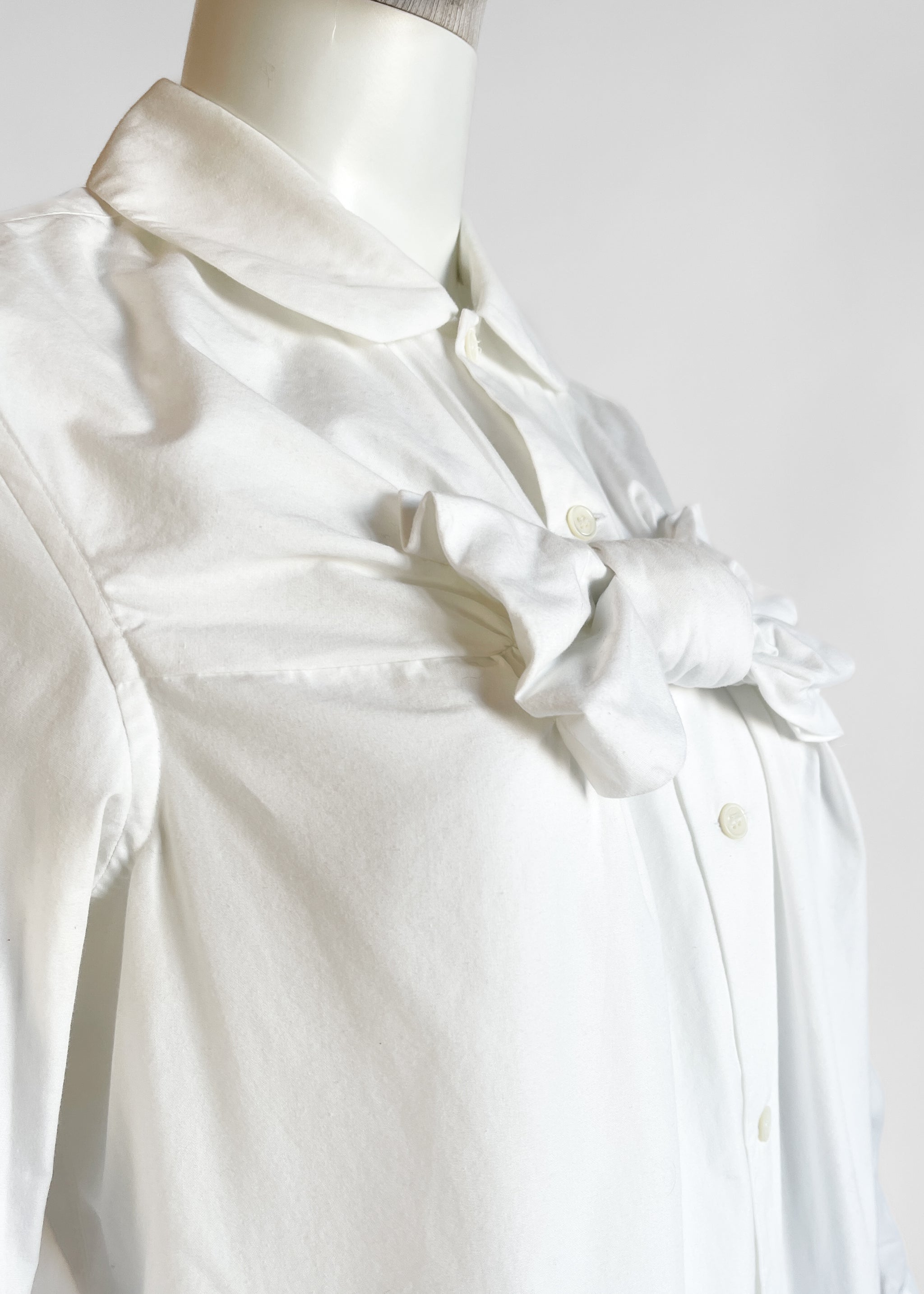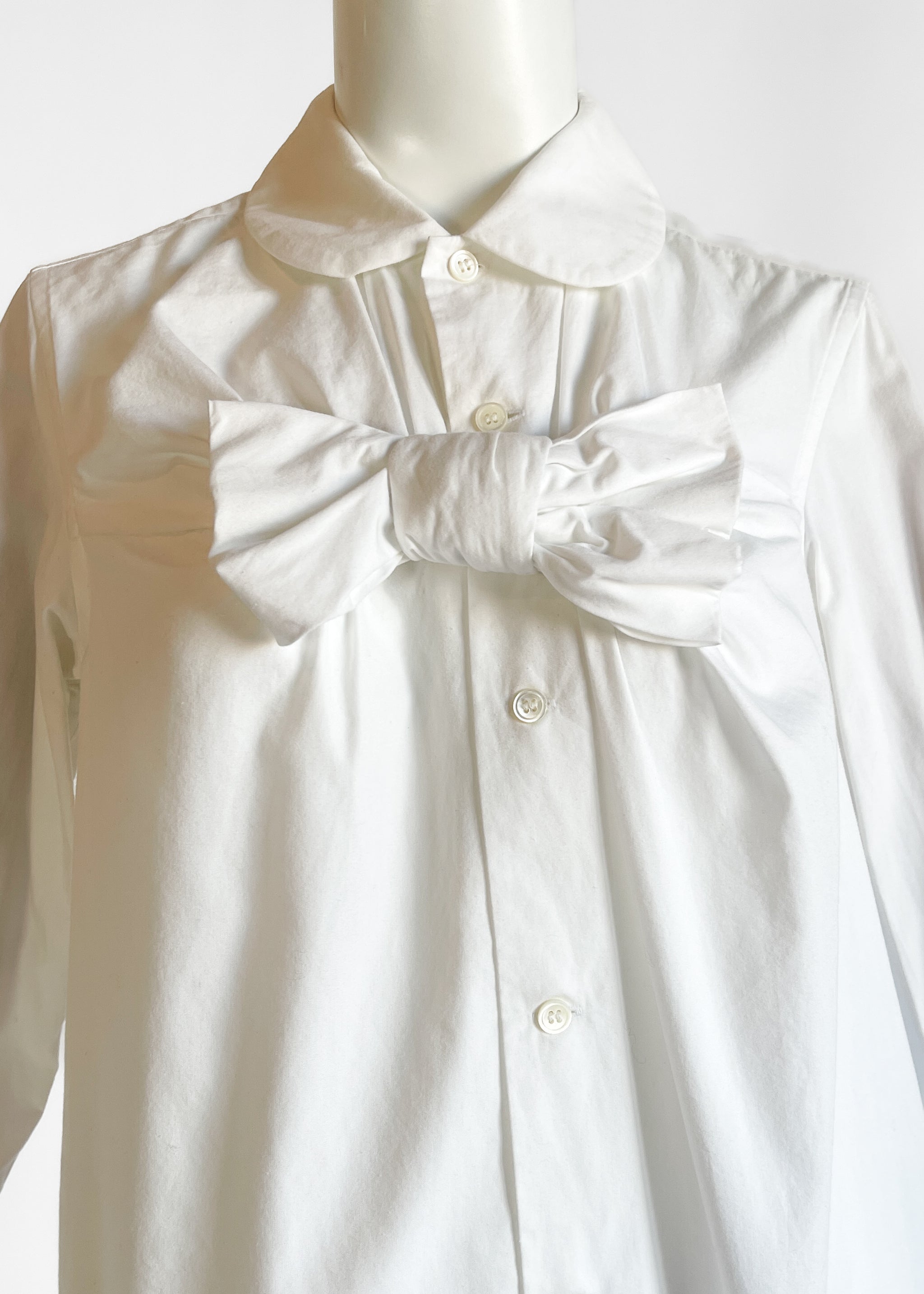 A sweet take on the classic white cotton buttondown shirt.  Peter Pan collar.  A permanently tied bow is attached to the front and pulls the shoulders and bust so it appears as a "shrunken" shirt.  The shirt slips on over the head because of the attached bow. Made in Japan.