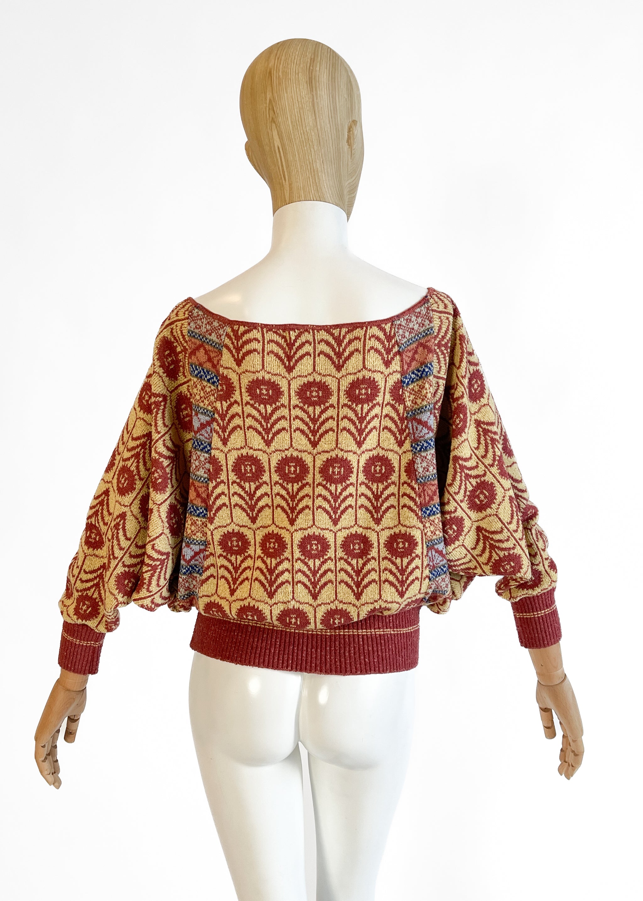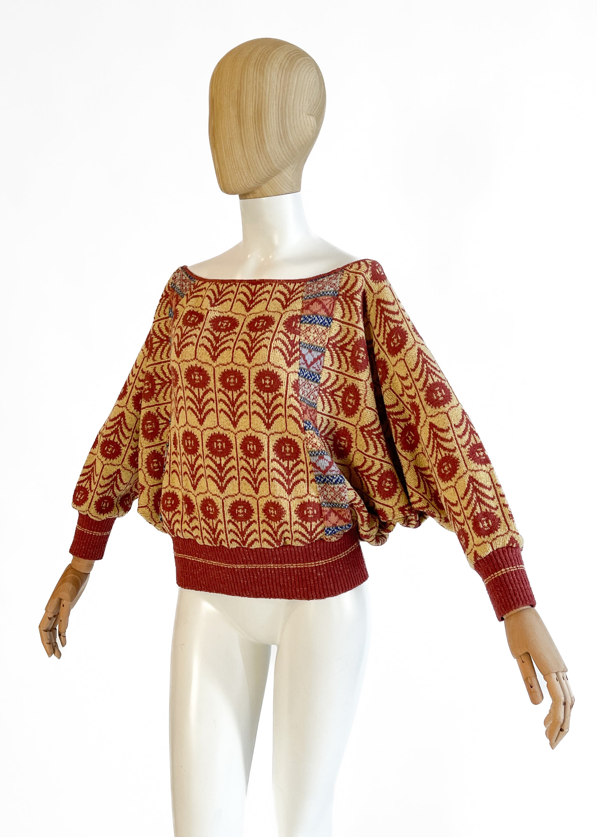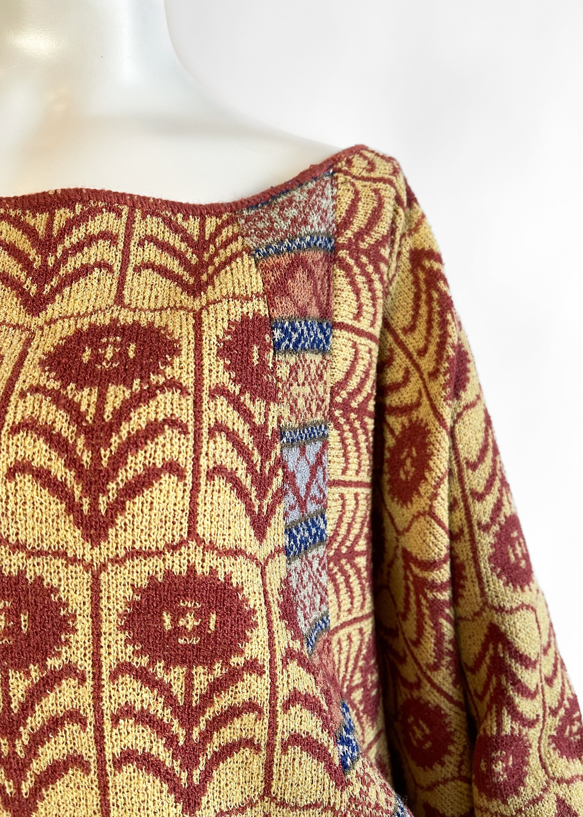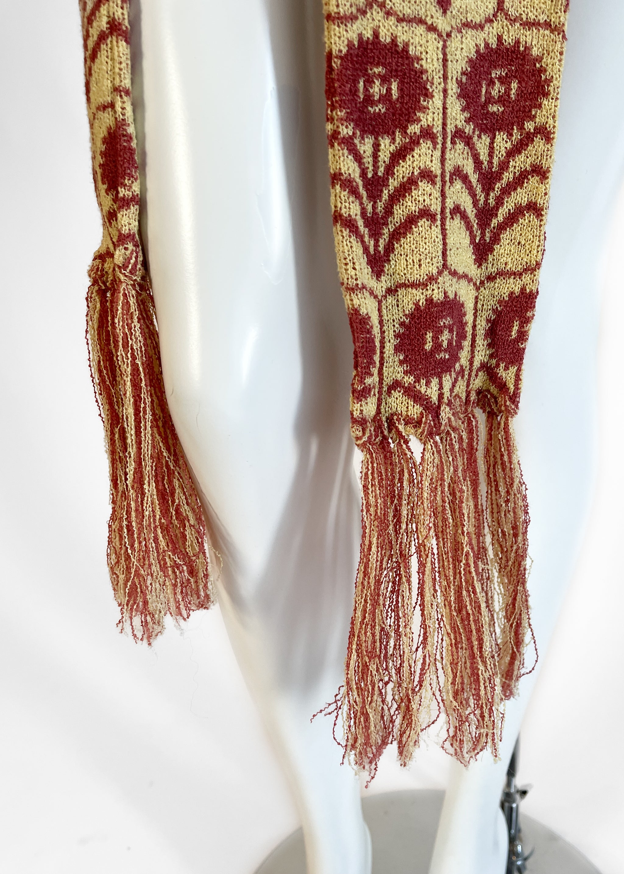 Lightweight acrylic knit with a fabulous stylized floral pattern. Extra-wide neck that can be worn off one shoulder. Matching extra-long scarf with fringe. Made in England. Sourced in Paris.