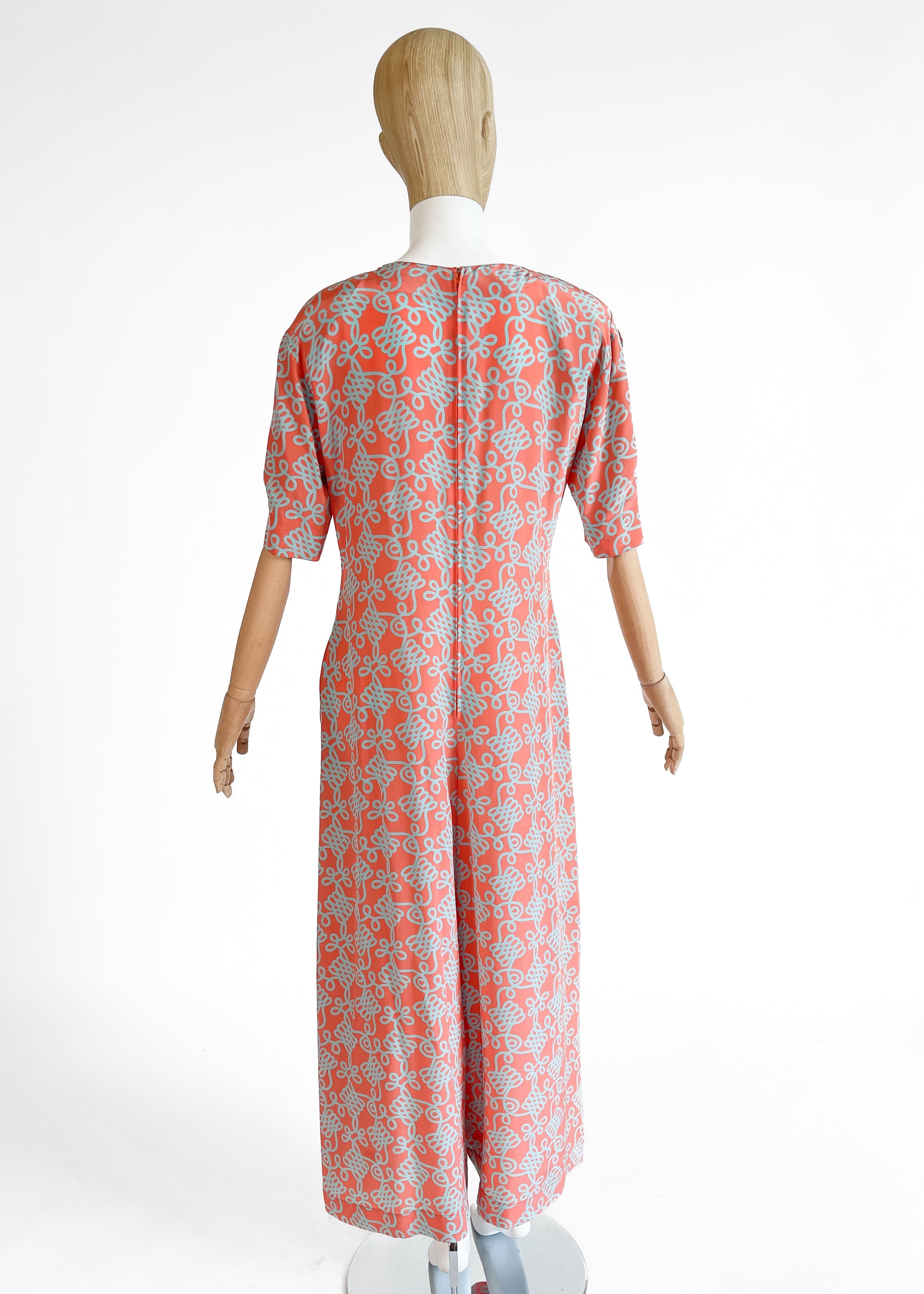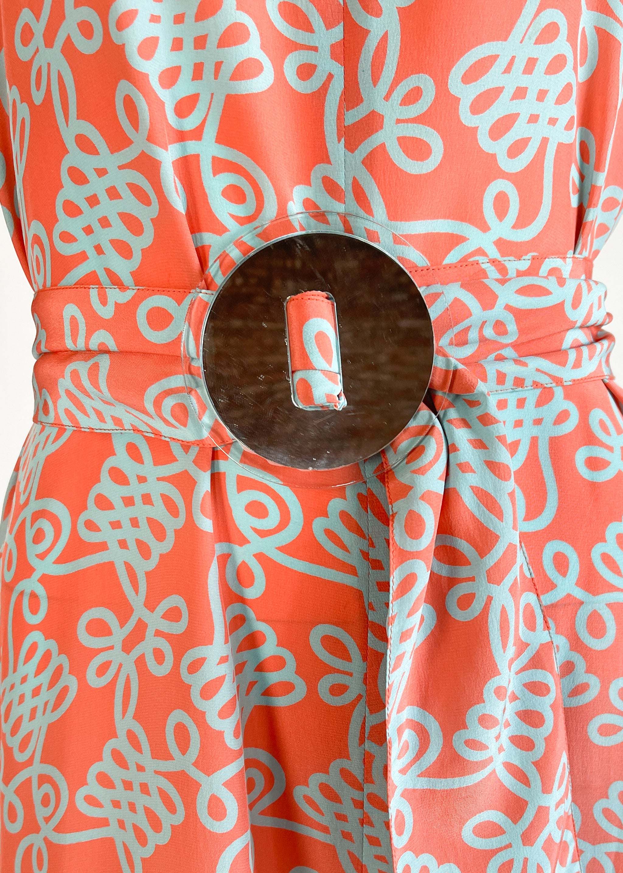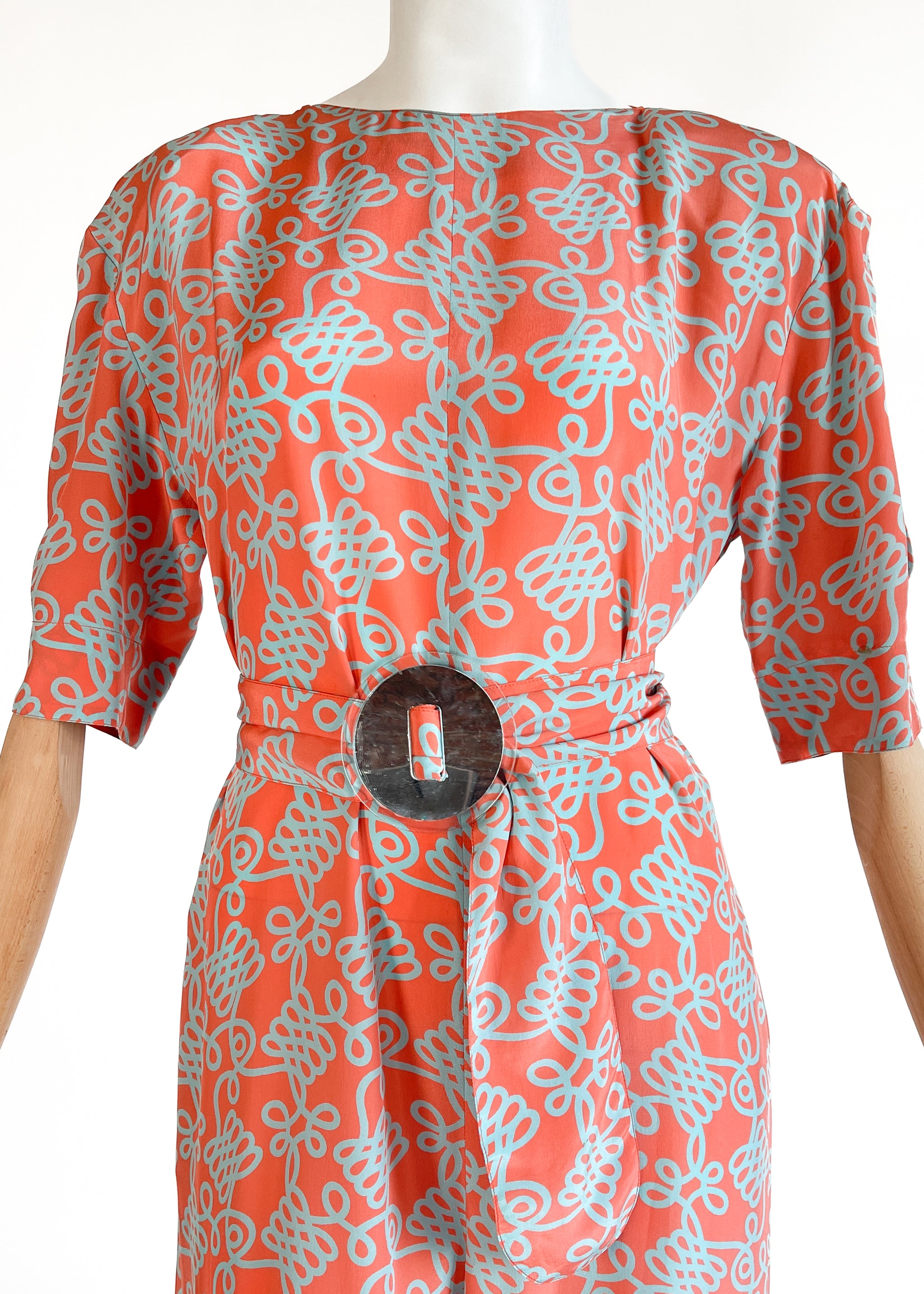 Peach silk with a grey geometric printed design.  Wide leg.  Has a detached belt with a large round mirrored buckle.  Shoulder pads. Back zipper.  Pockets. Made in England.