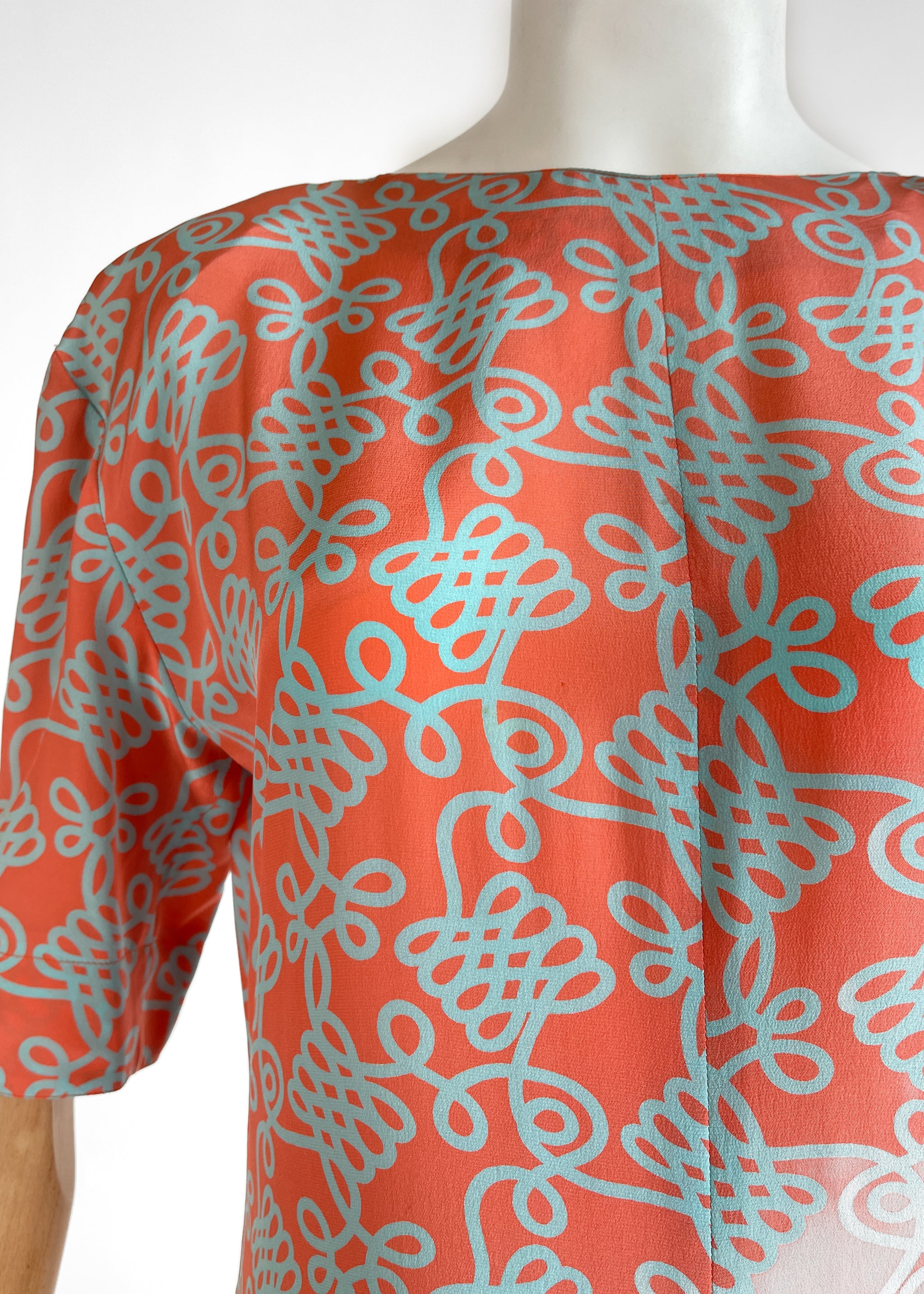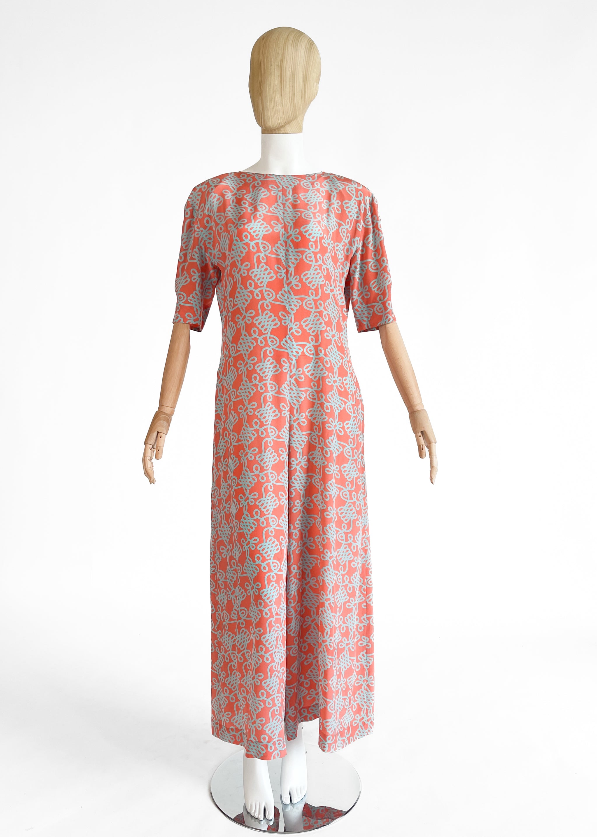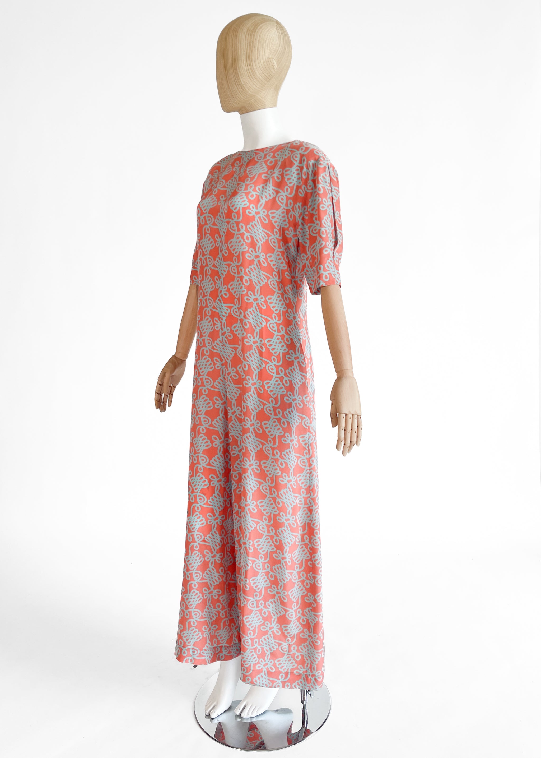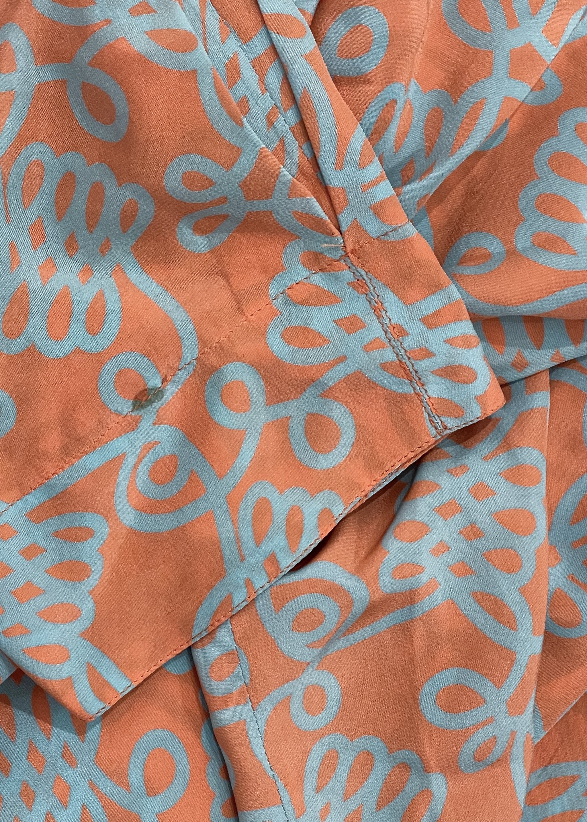 Peach silk with a grey geometric printed design.  Wide leg.  Has a detached belt with a large round mirrored buckle.  Shoulder pads. Back zipper.  Pockets. Made in England.