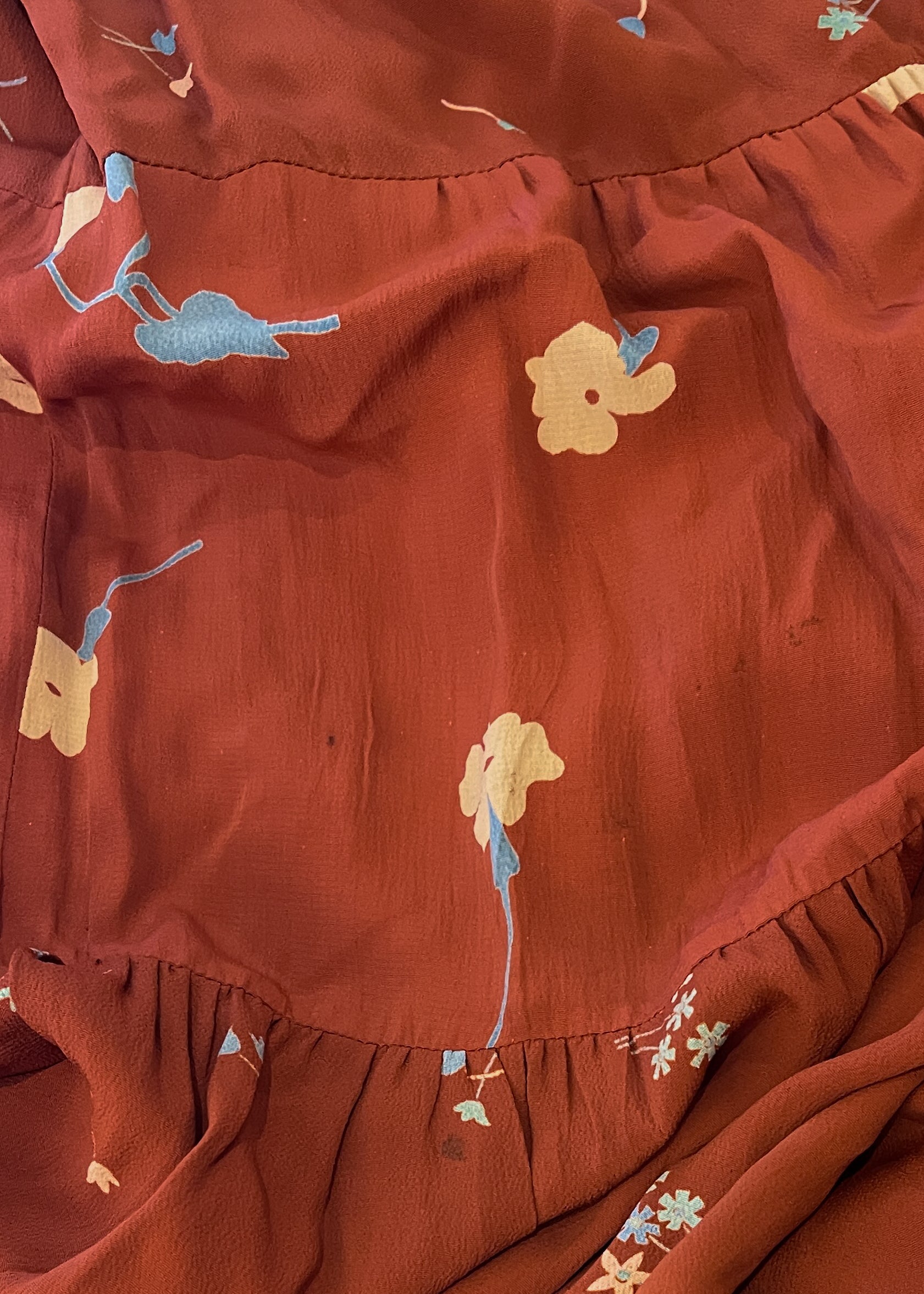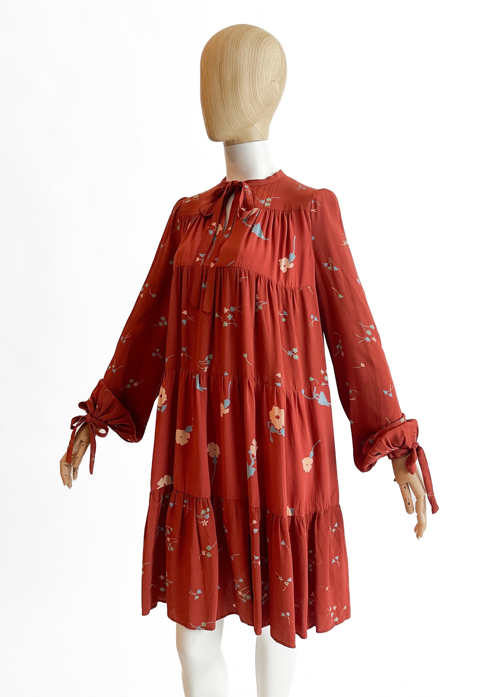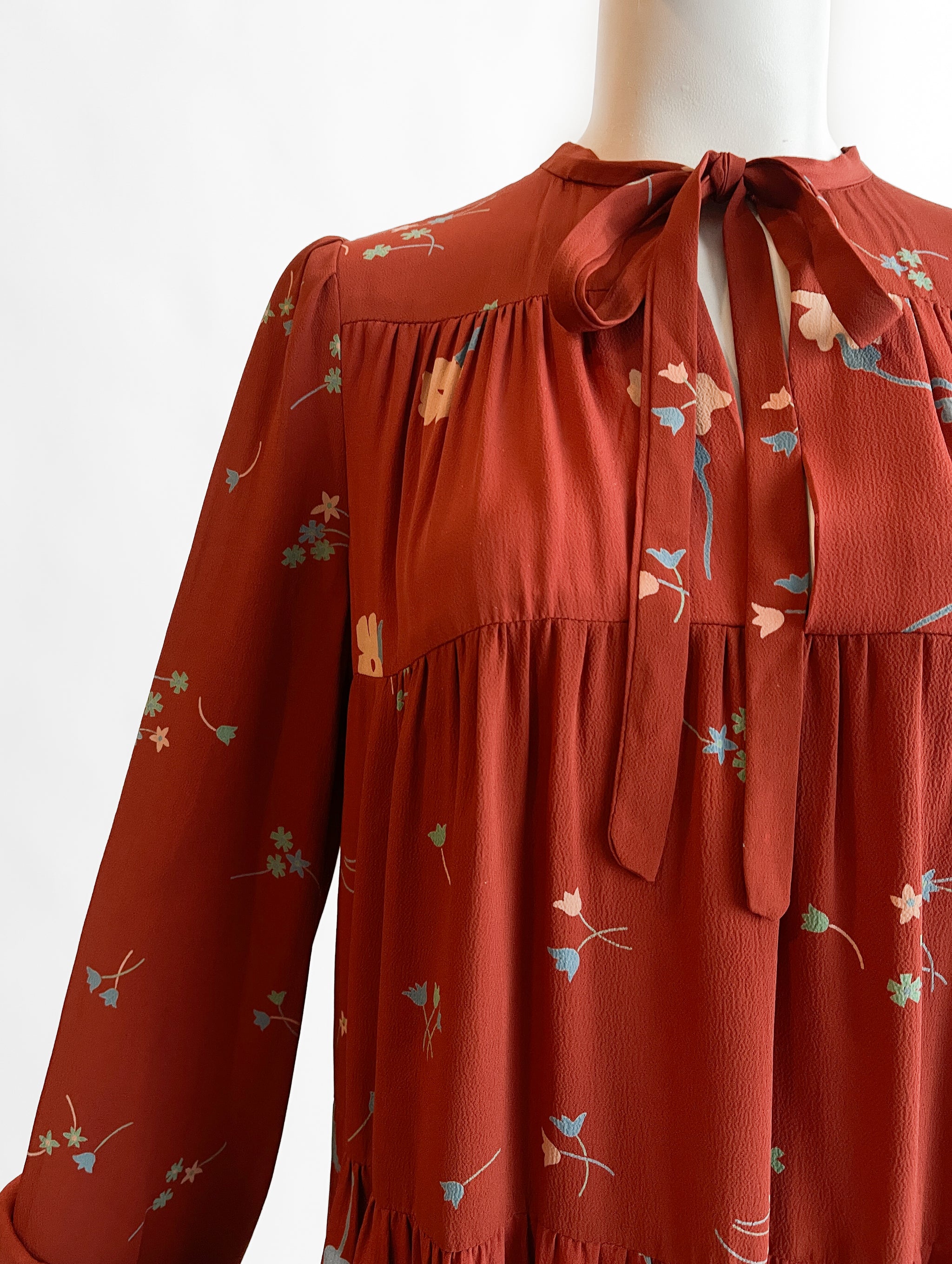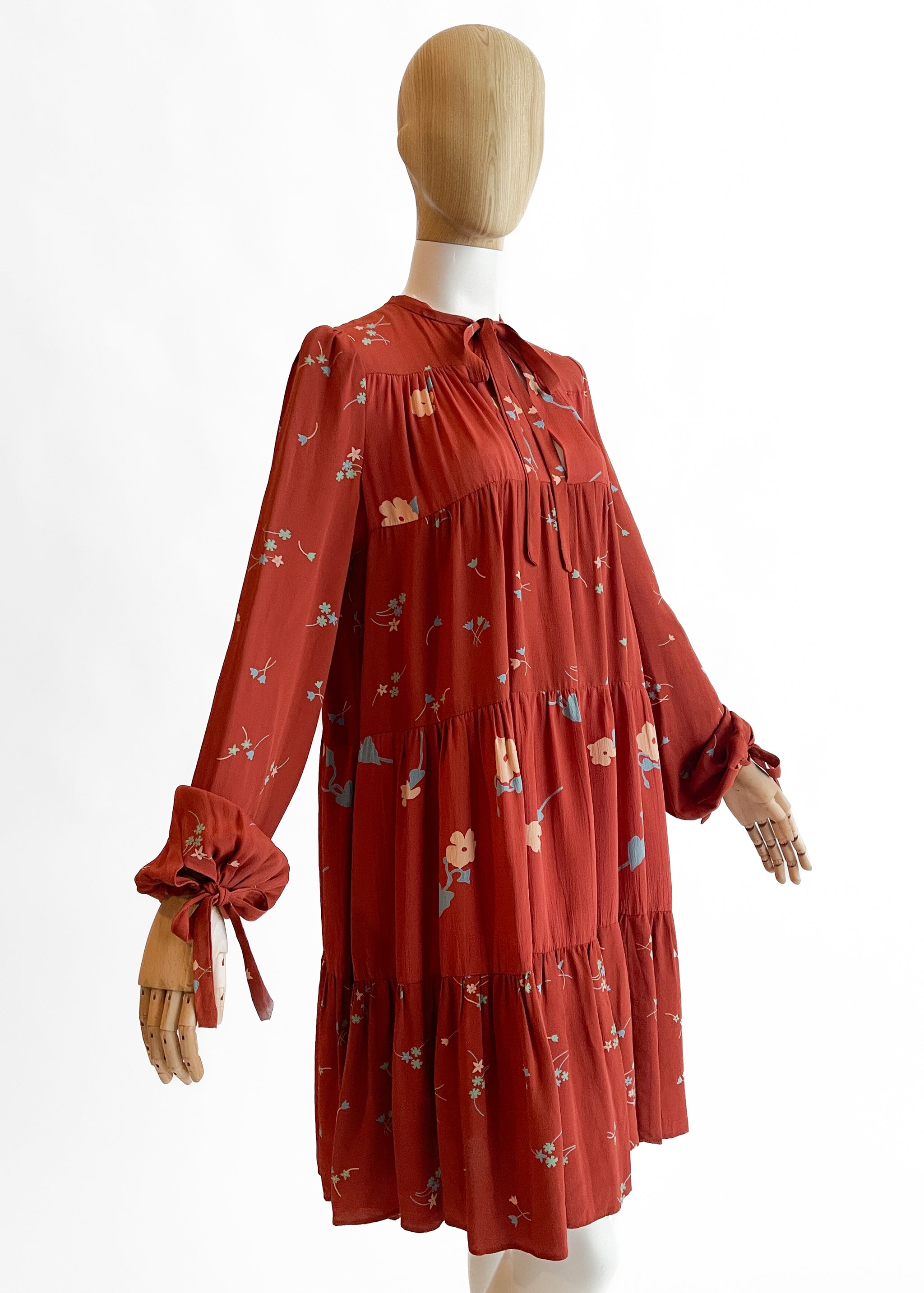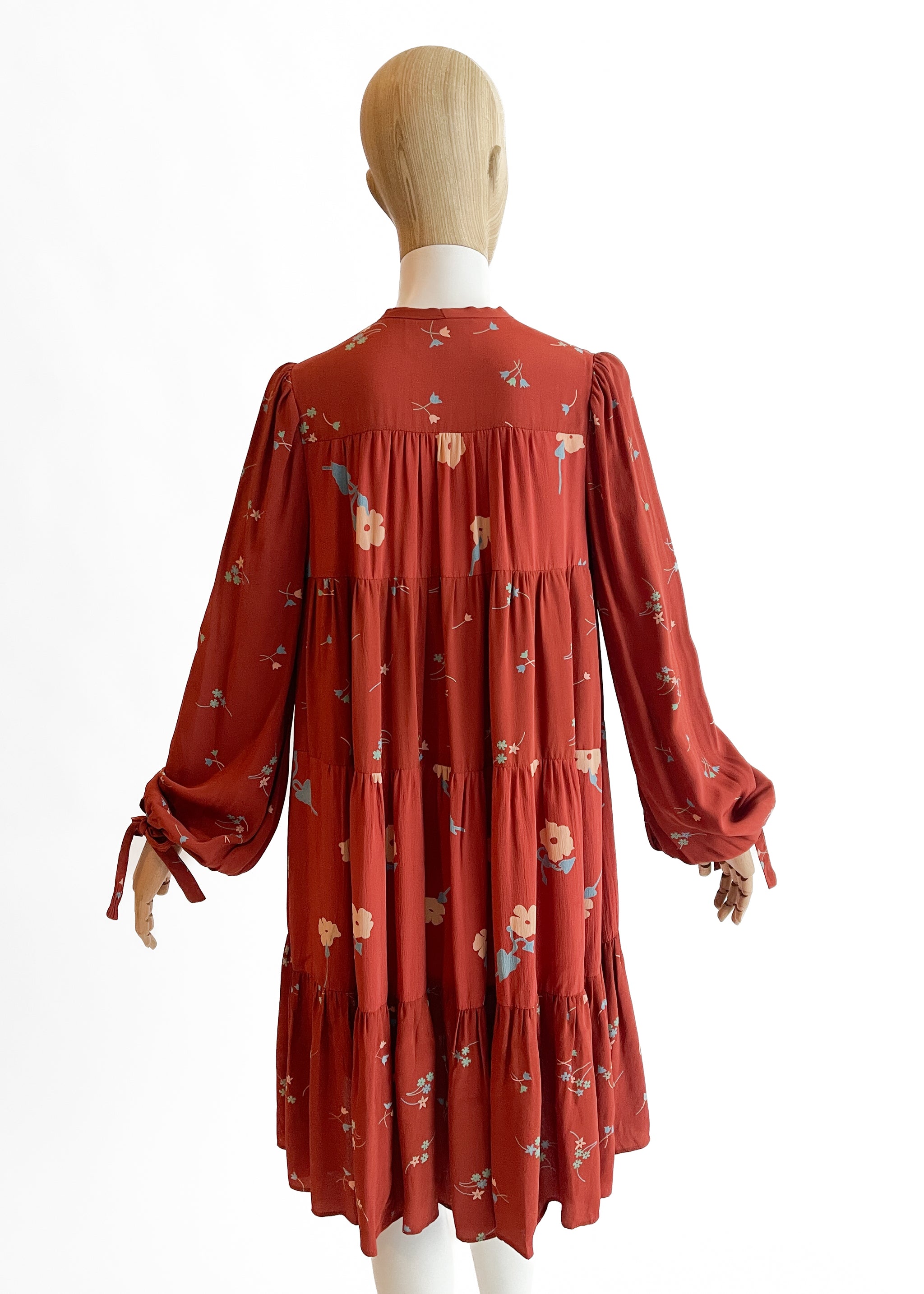 Beautiful shade of burnt orange (rust) with a petite floral print. Lightweight crepe (viscose or rayon). Tiered A-line trapeze silhouette. Long sleeves that balloon at the tie hem. Key hole neck with tie. Print designed by Celia Birtwell. Made in England. Sourced in London.