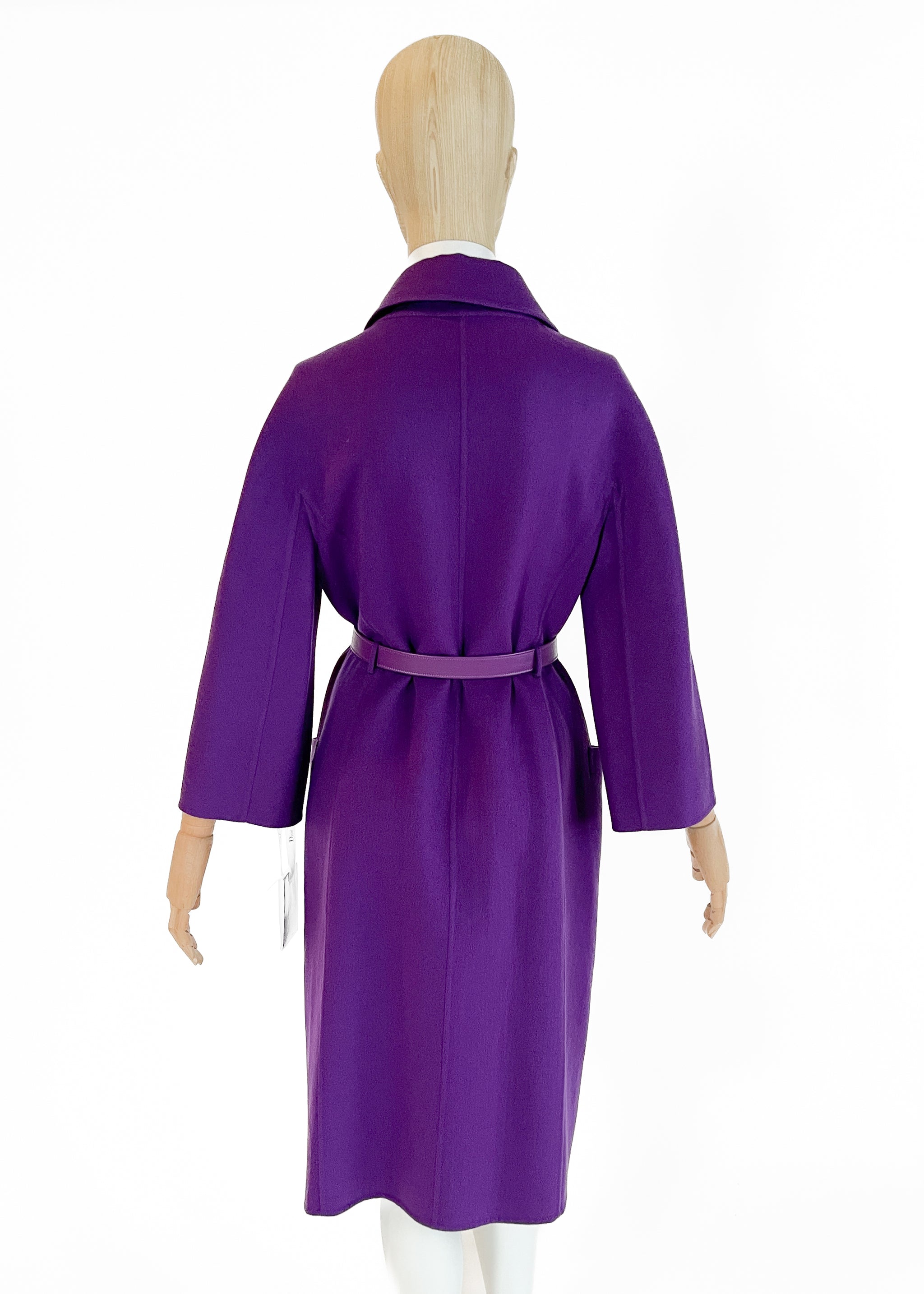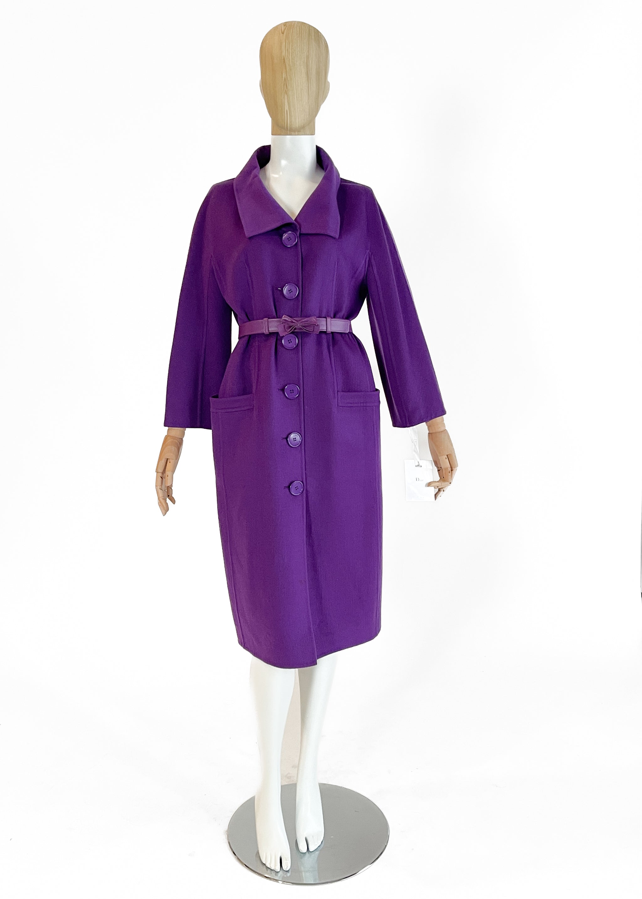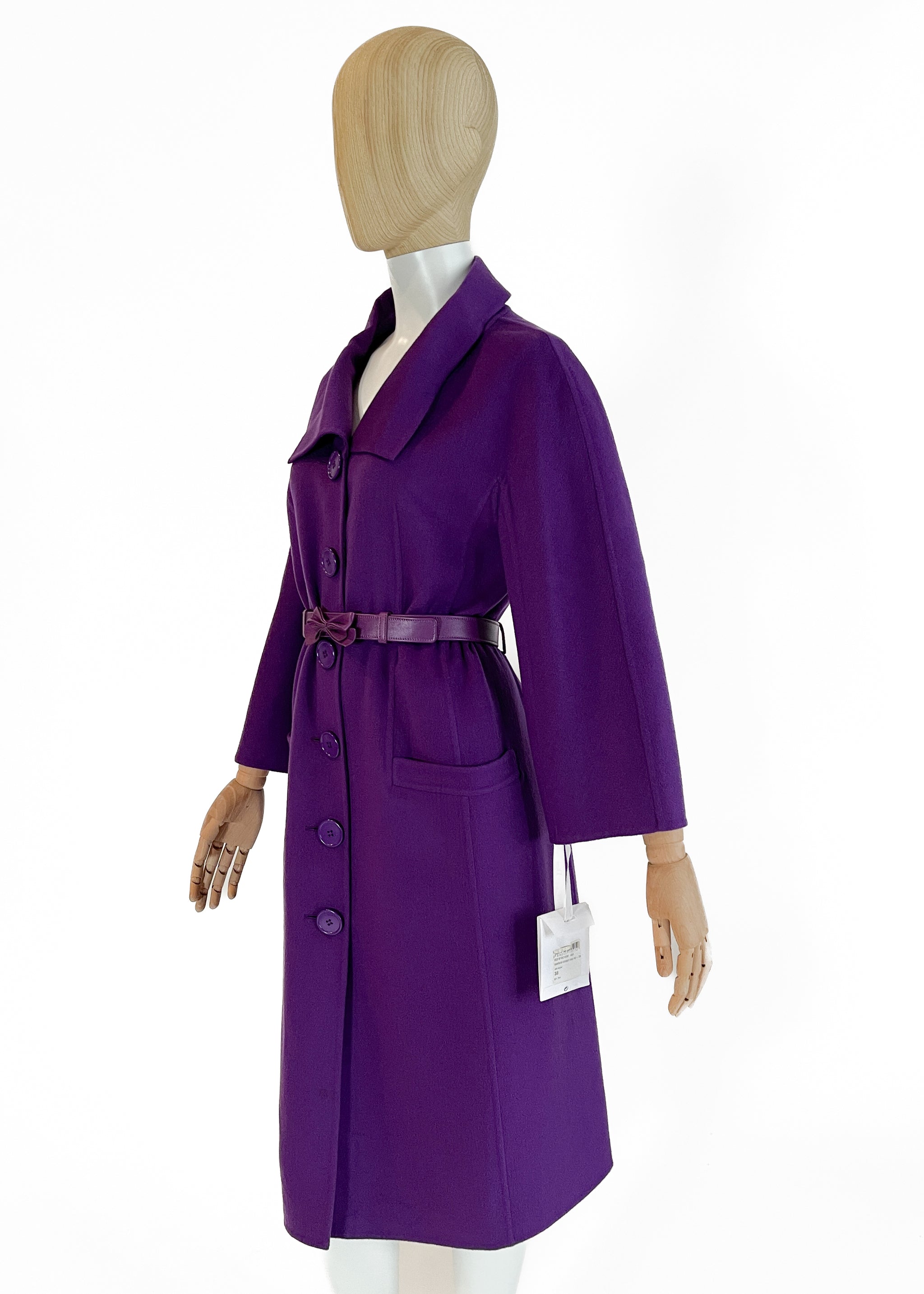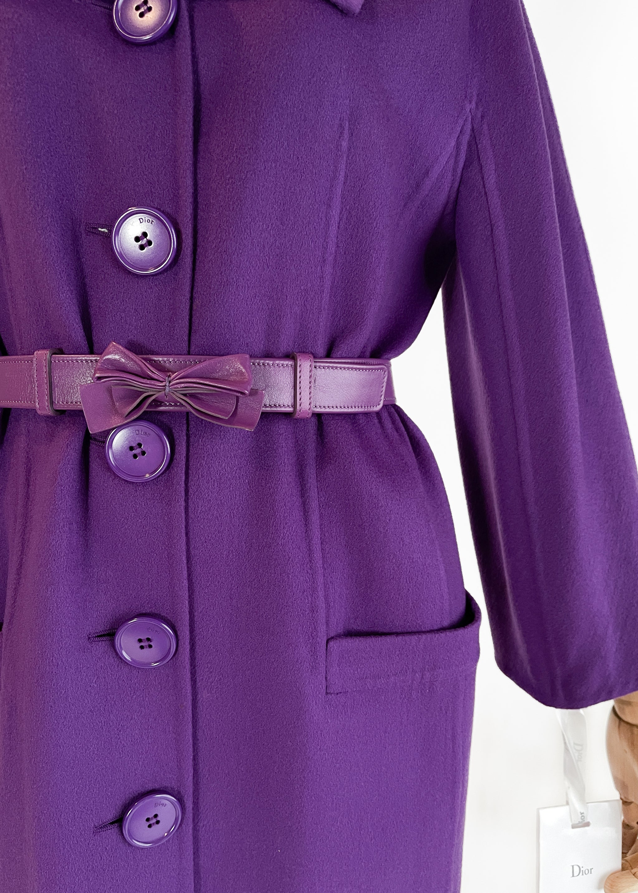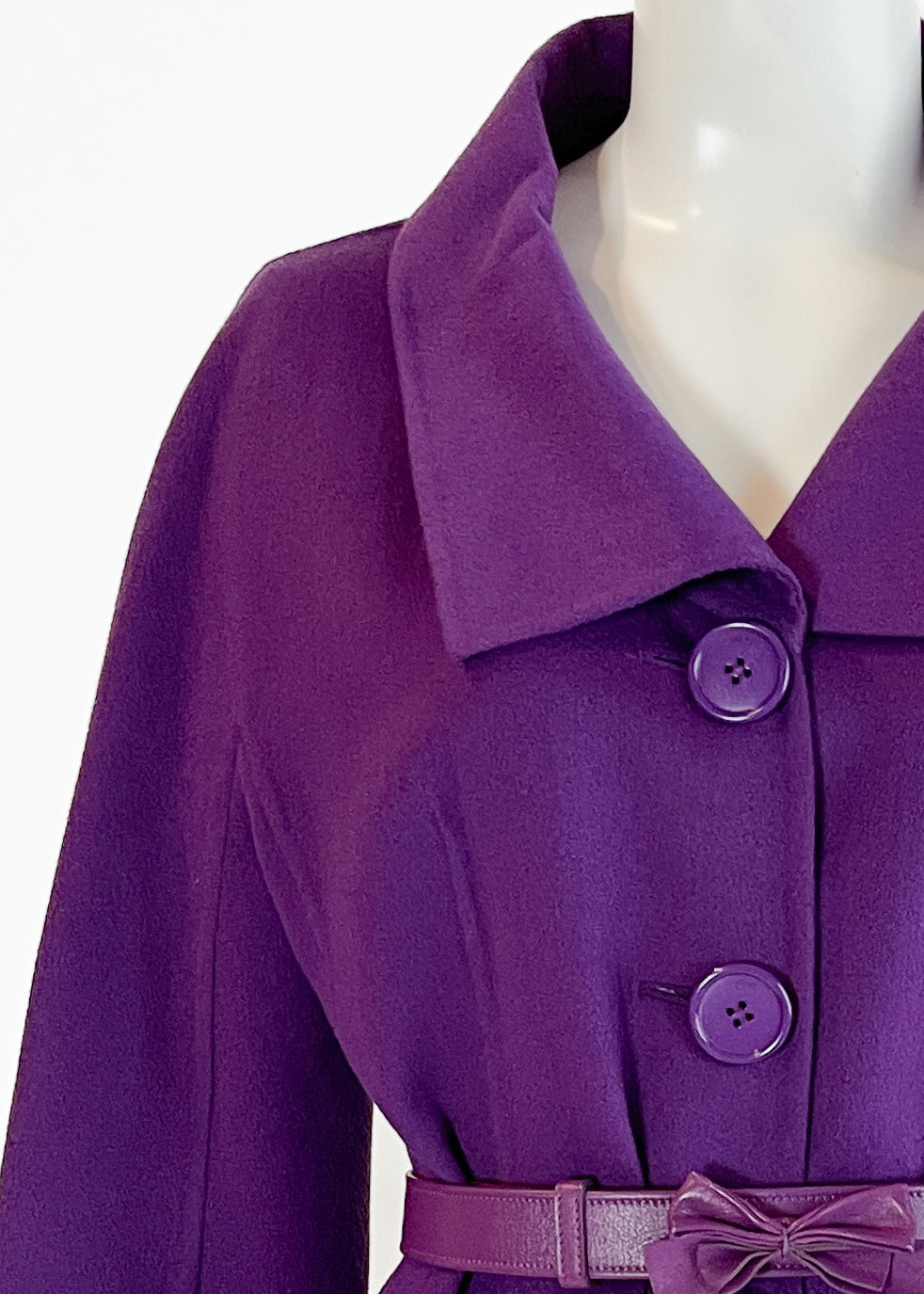 Lightweight, soft cashmere in the most beautiful shade of violet. Double faced Italian cashmere. 1960s styling with bracelet-length sleeves. Skinny bow leather belt included. Two front pockets. Unlined. Made in Italy.
