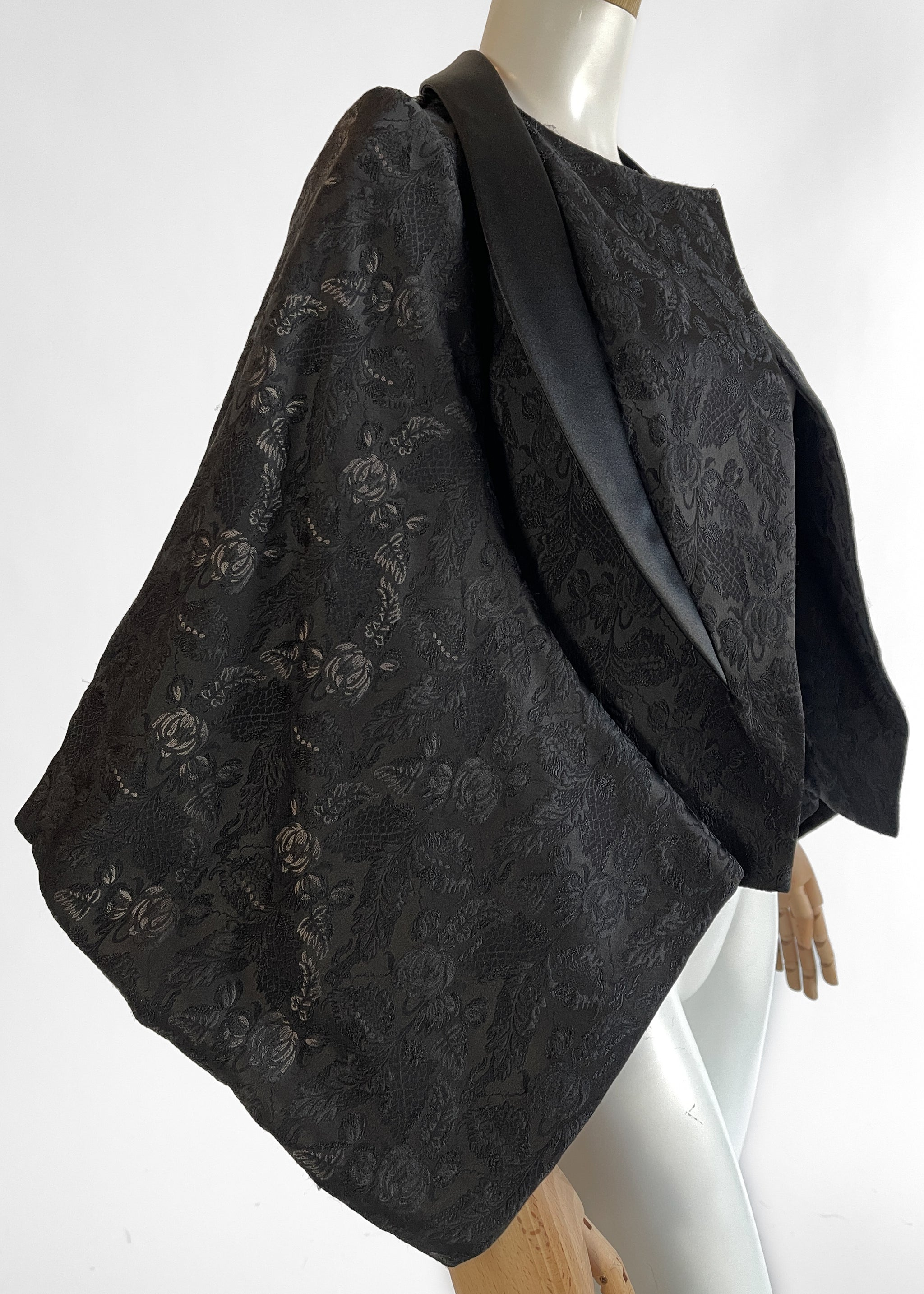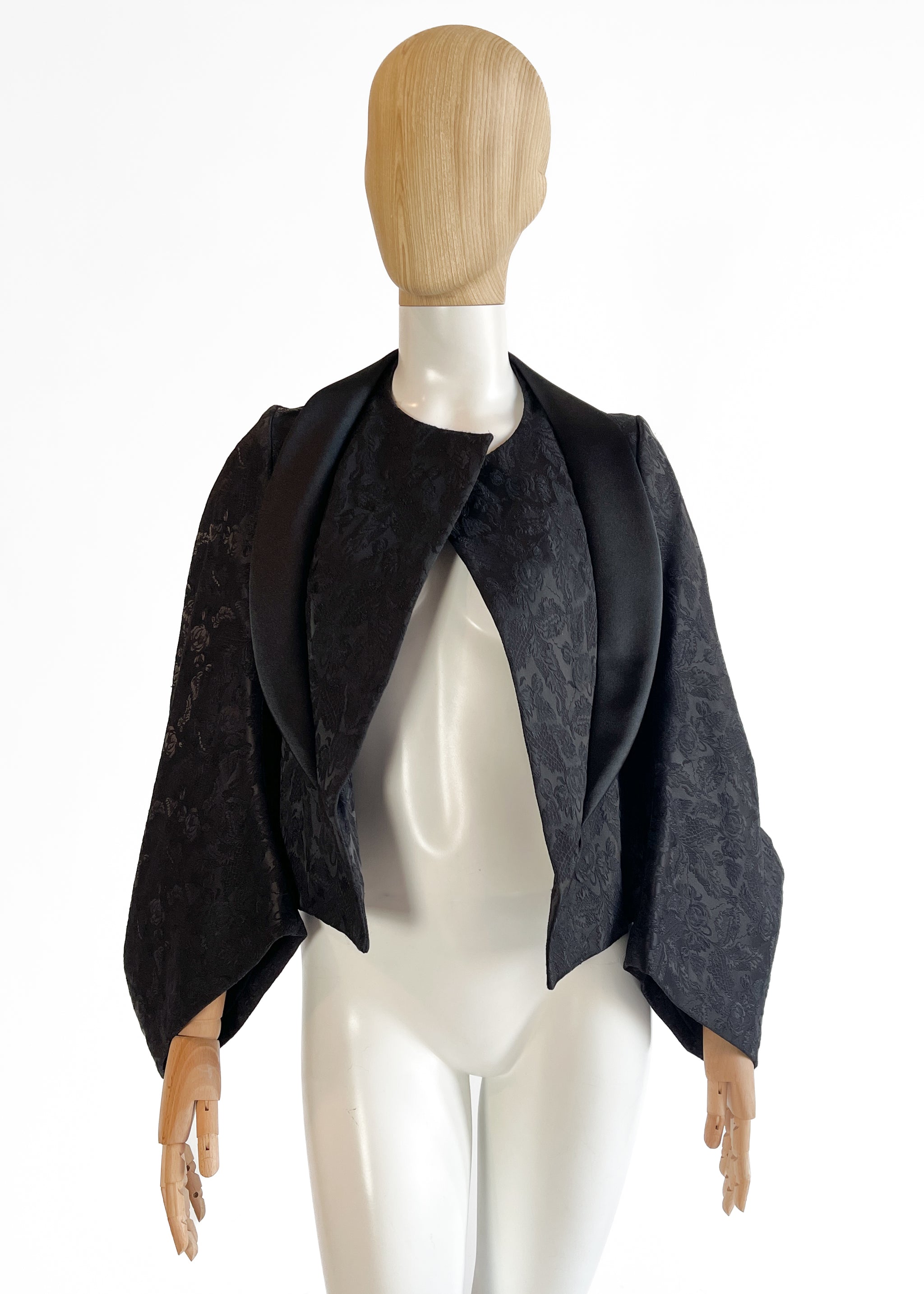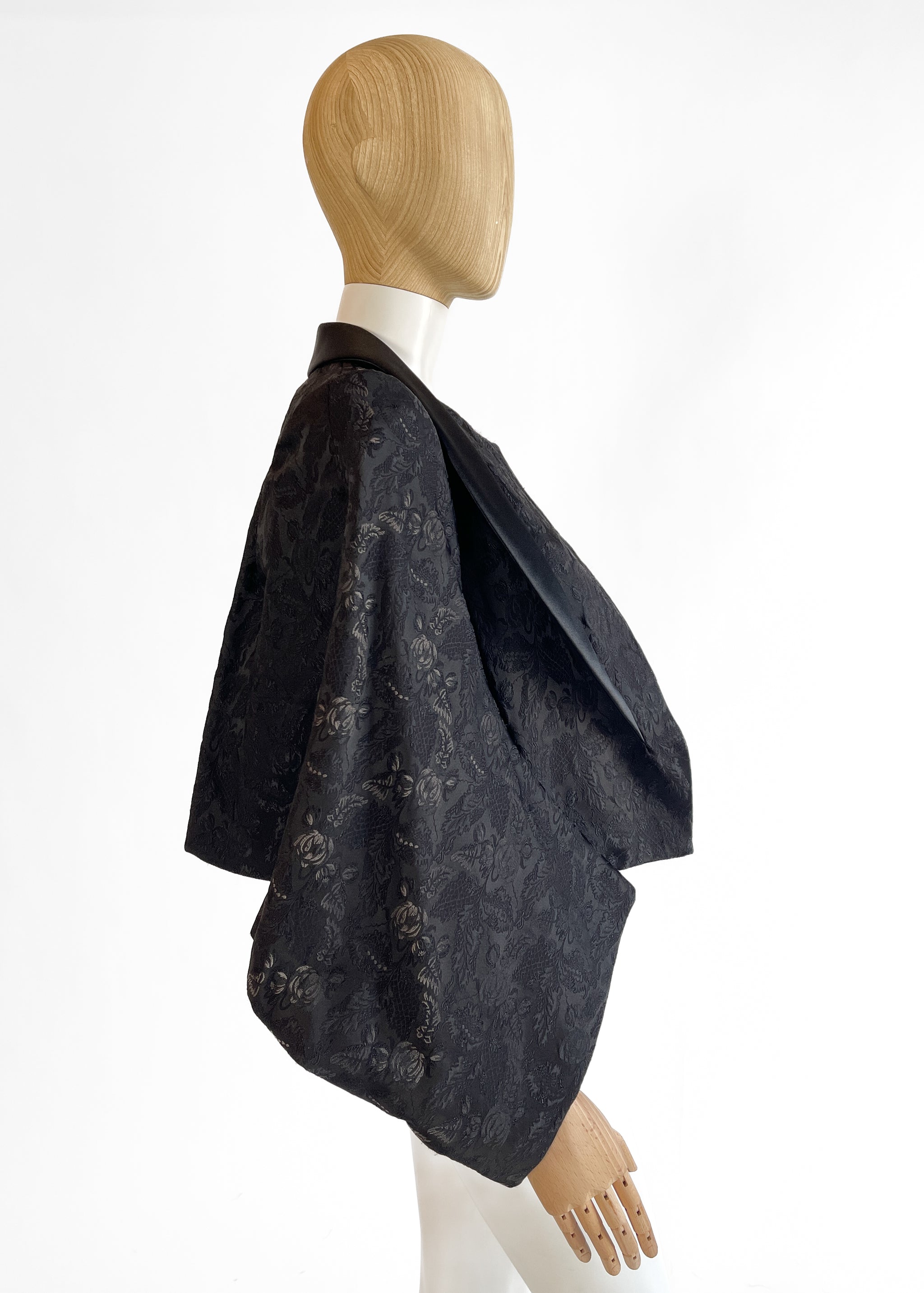 The design is inspired by Victorian mantel coats. Black textured brocade fabric. Sleeves that blend with the body of the coat. Satin labels. Open front. Made in Japan. Designed by Rei Kawakubo. Original tags attached. Original retail price $1175.
