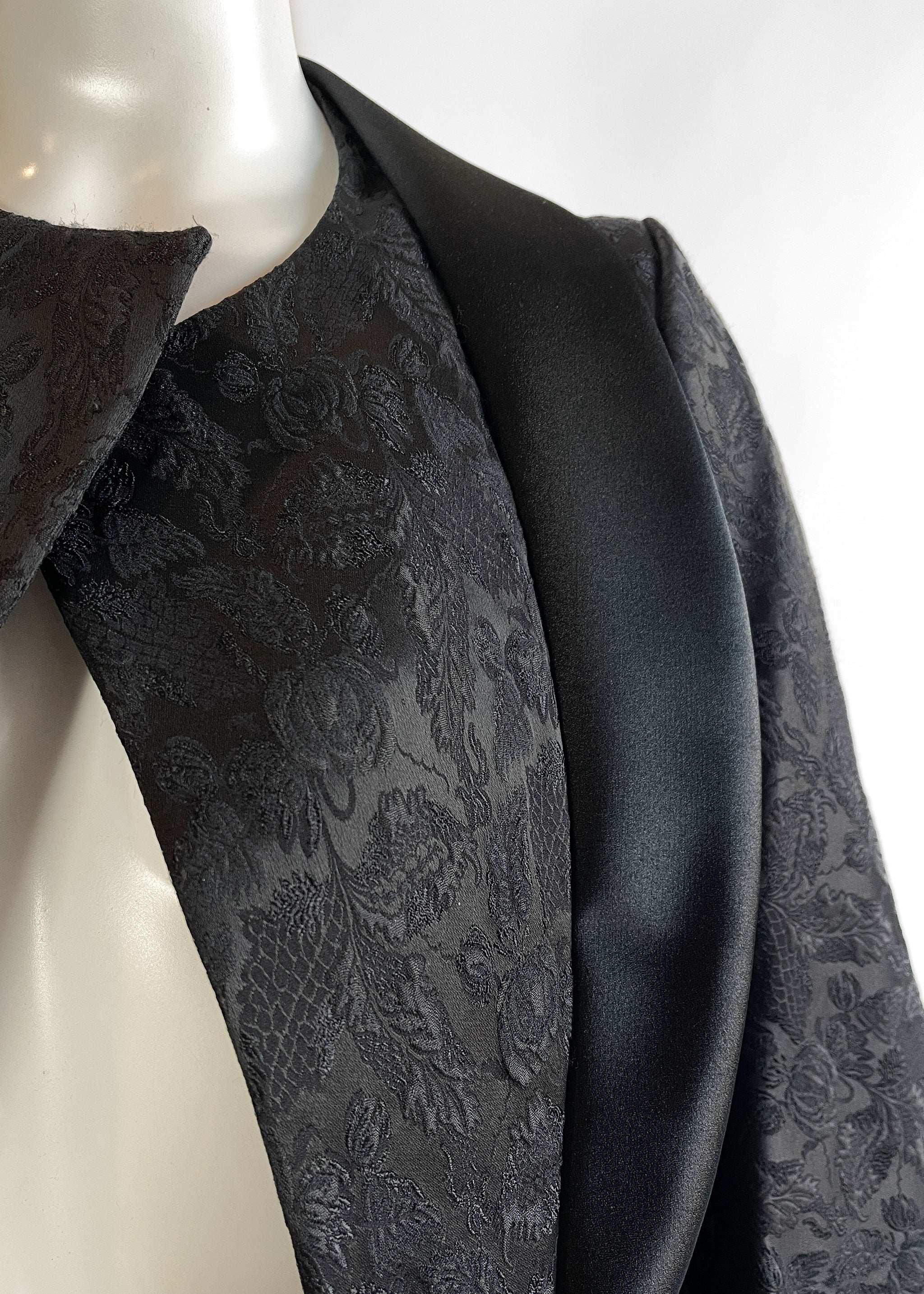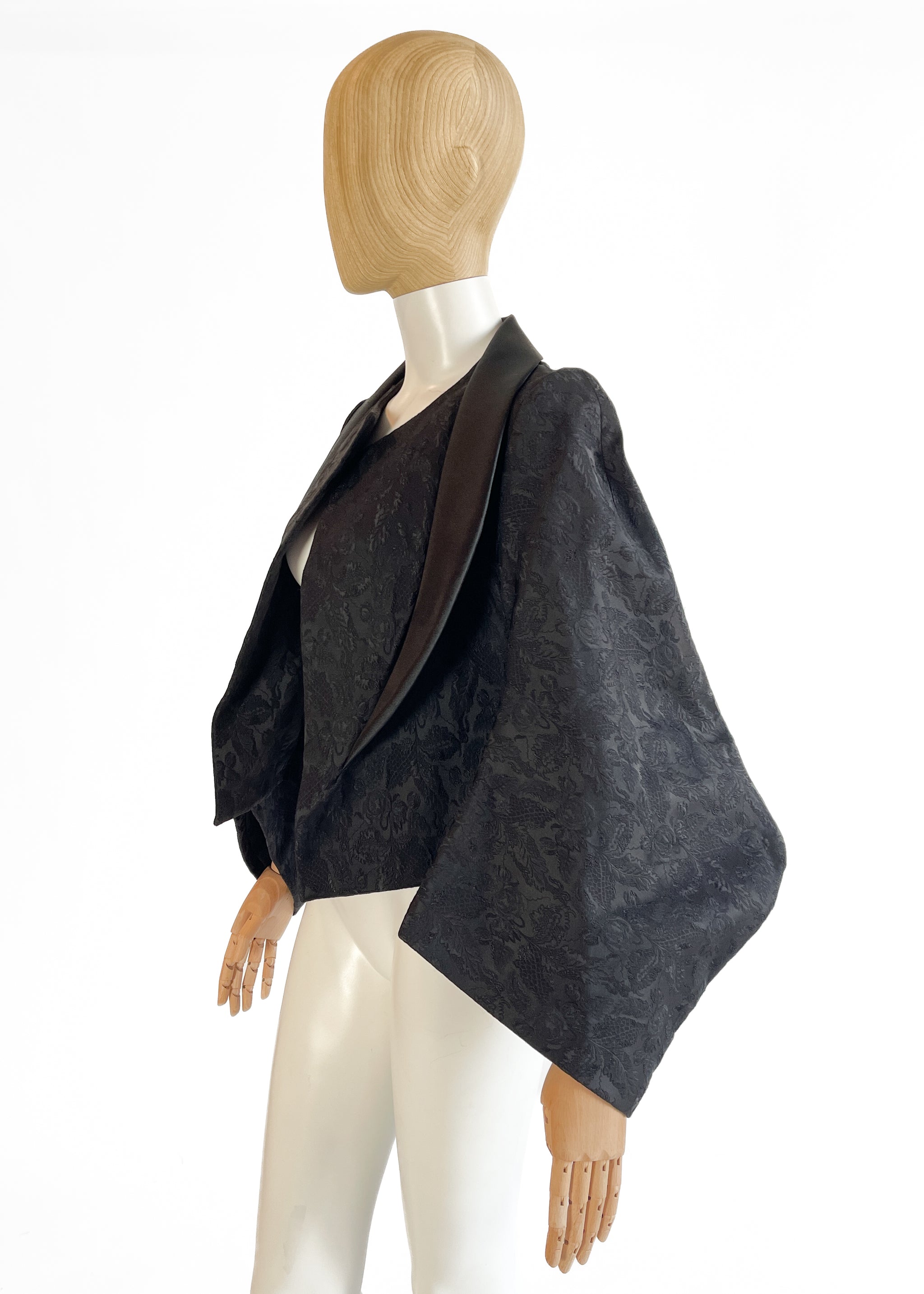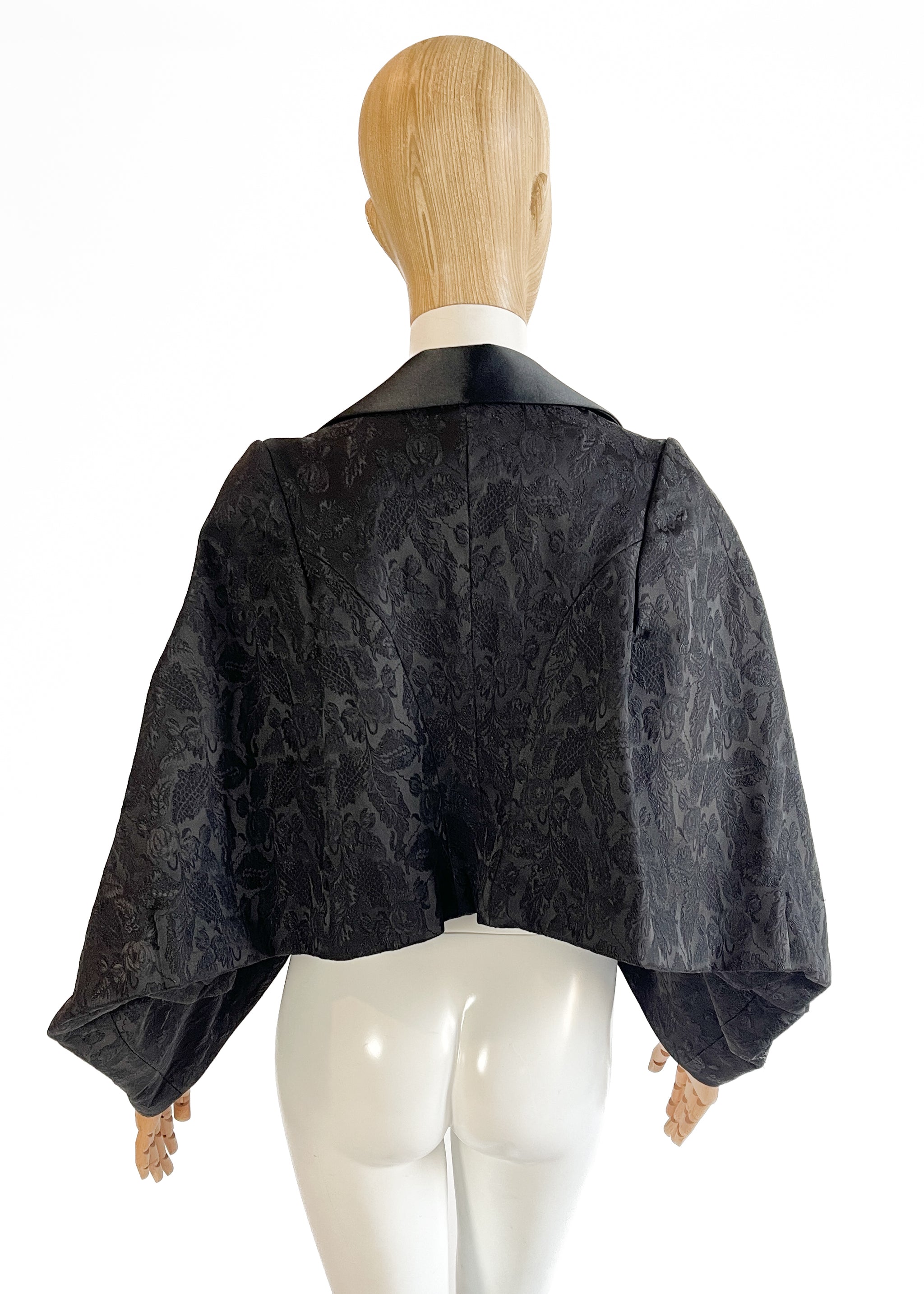 The design is inspired by Victorian mantel coats. Black textured brocade fabric. Sleeves that blend with the body of the coat. Satin labels. Open front. Made in Japan. Designed by Rei Kawakubo. Original tags attached. Original retail price $1175.