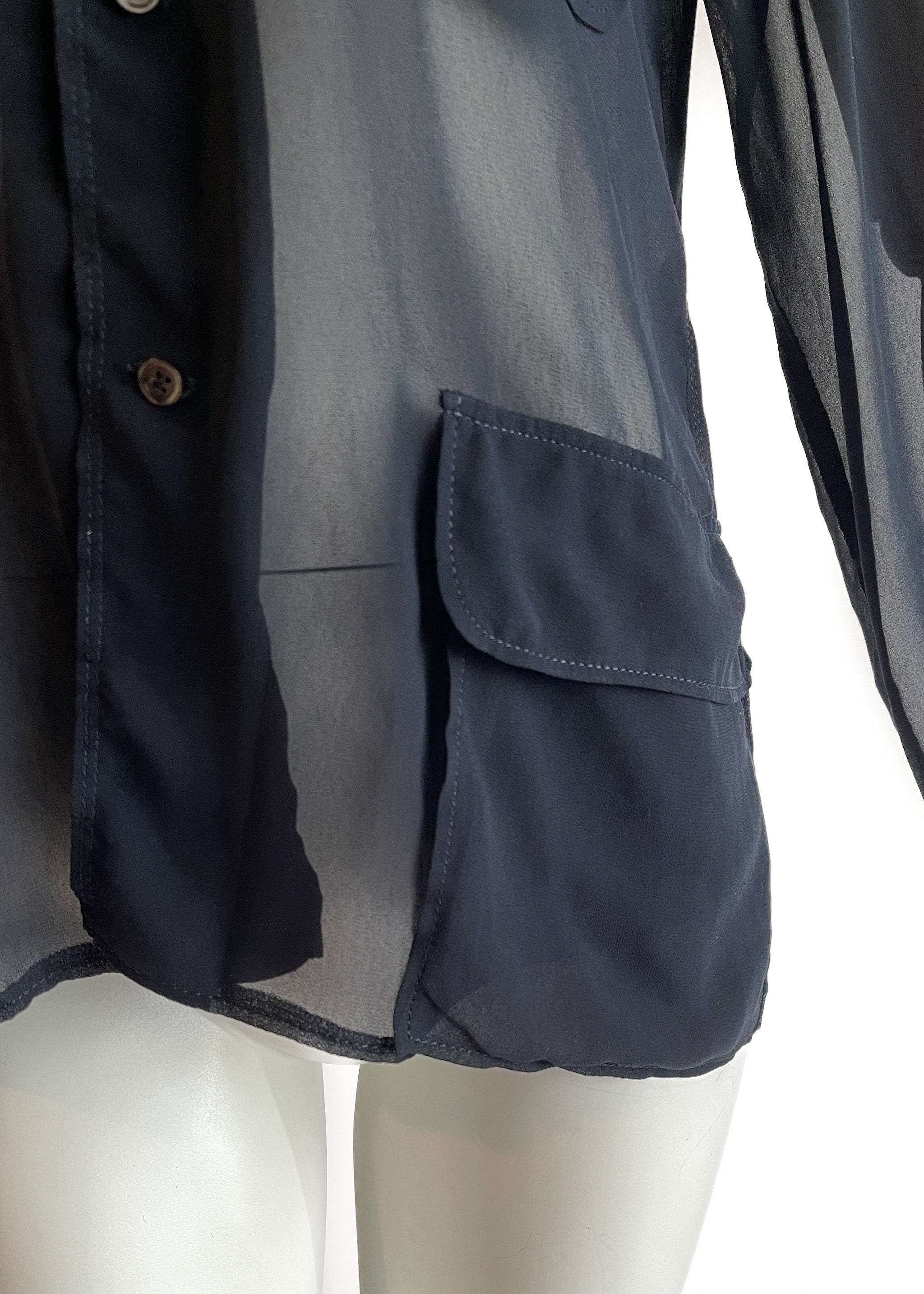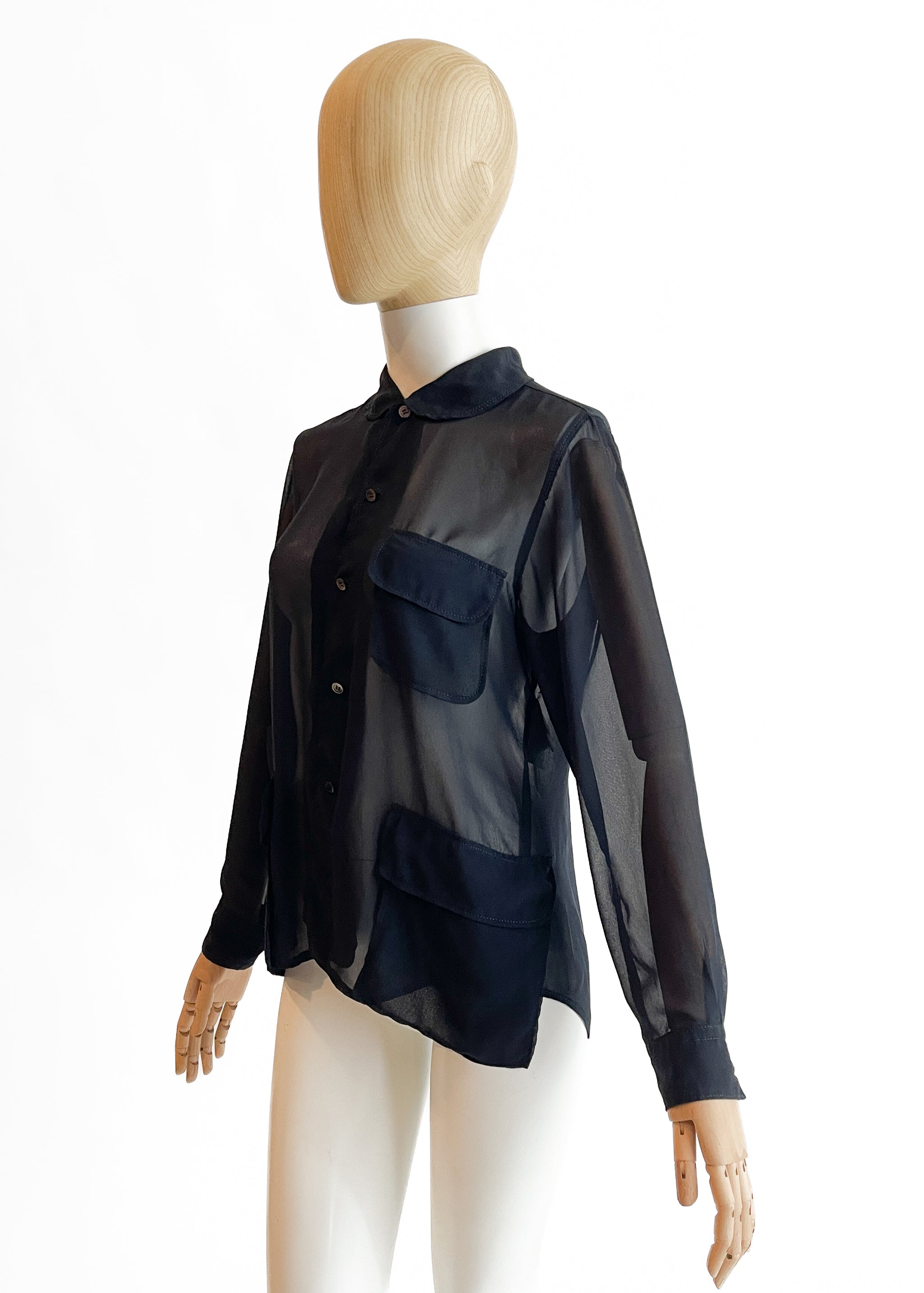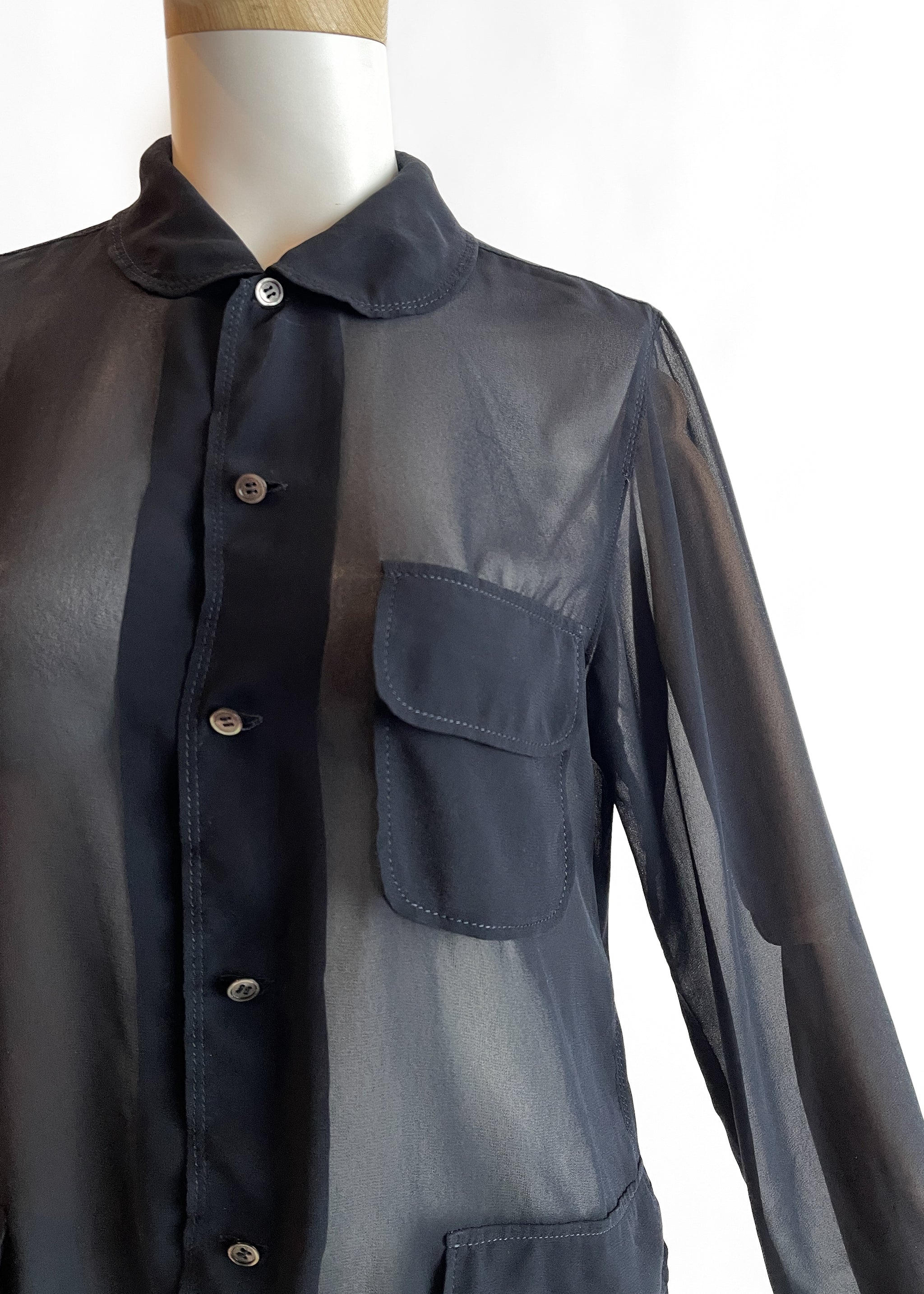 A beautiful layering piece. Sheer black polyester button-down shirt. PeterPan collar. Three front pockets. The two bottom, larger pockets are attached only at the top. Made in Japan.