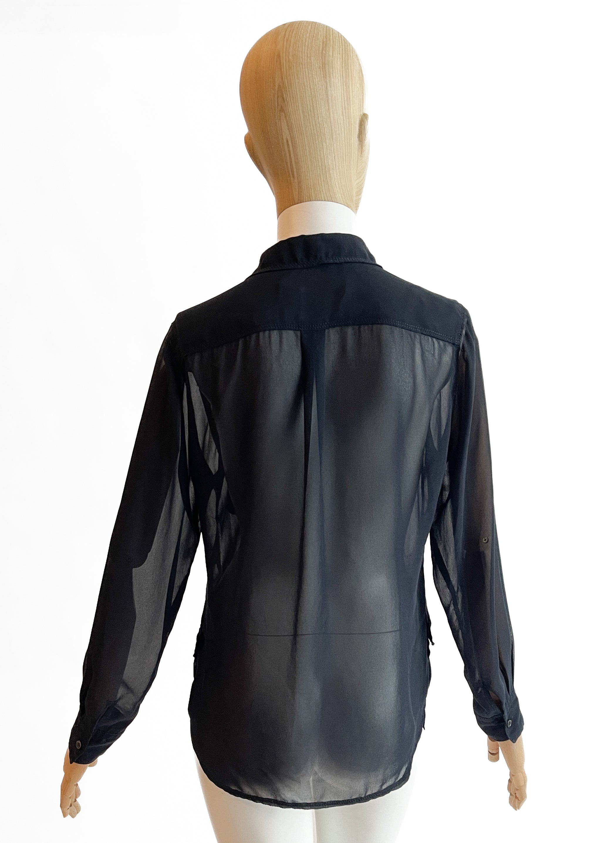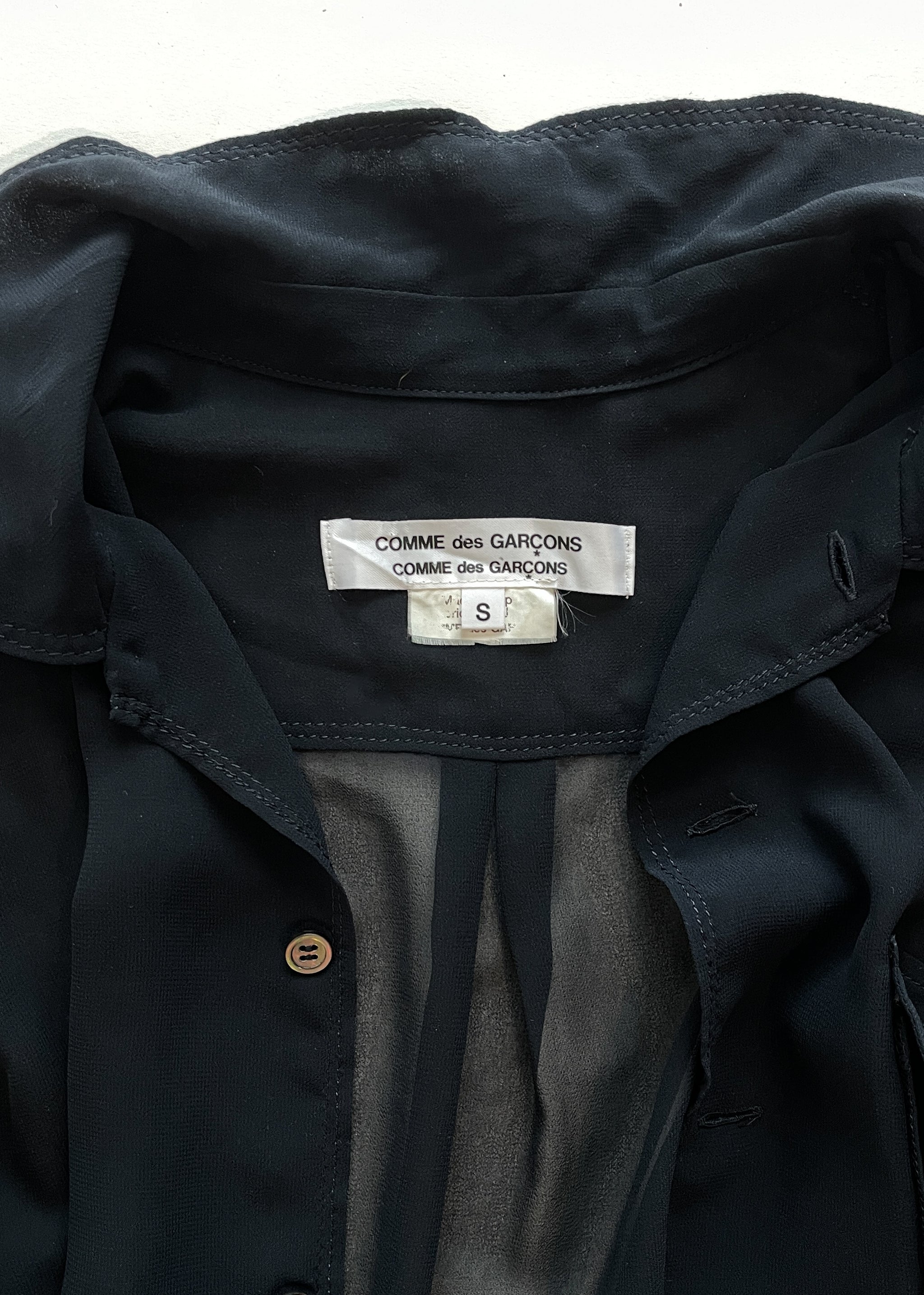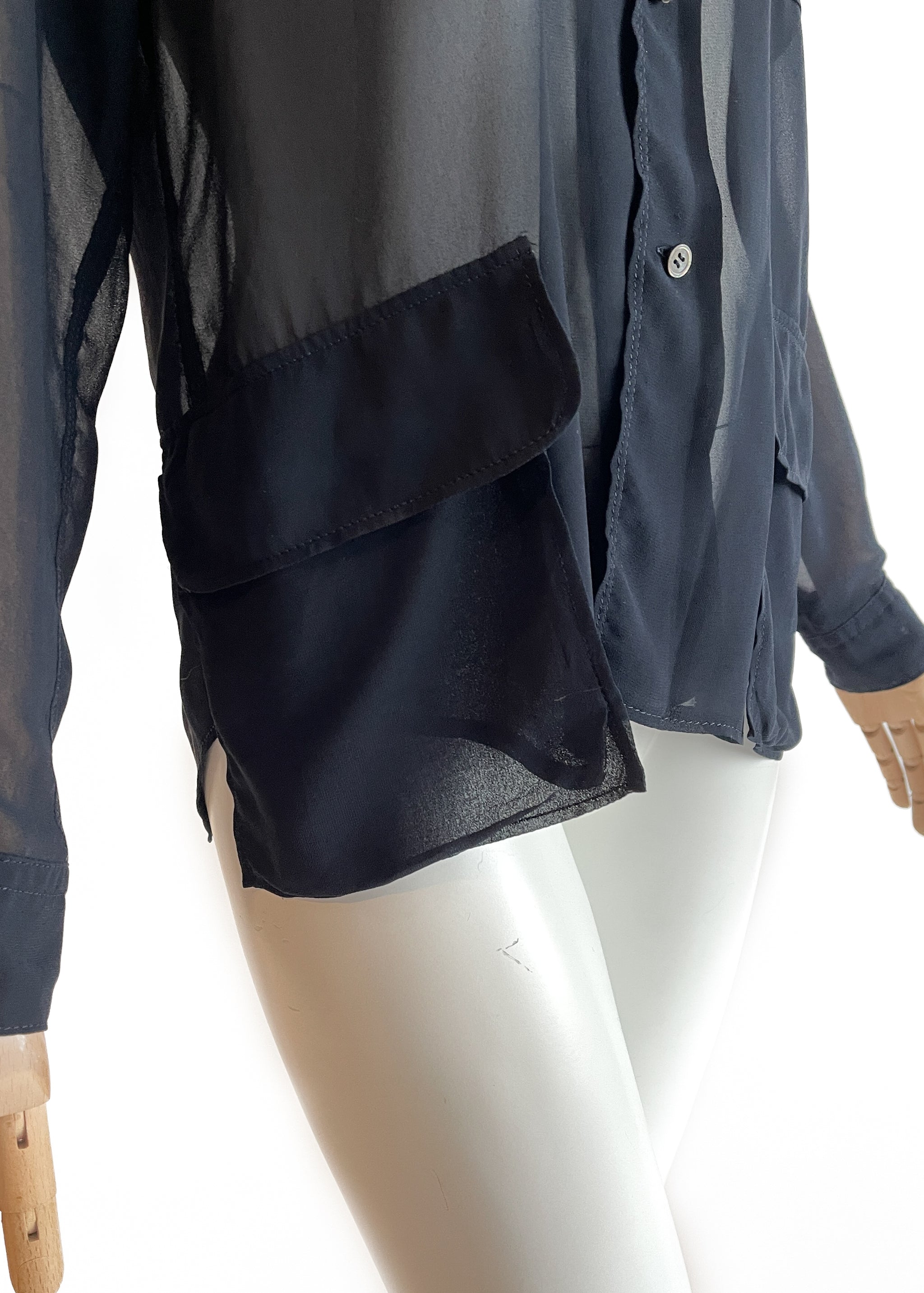 A beautiful layering piece. Sheer black polyester button-down shirt. PeterPan collar. Three front pockets. The two bottom, larger pockets are attached only at the top. Made in Japan.