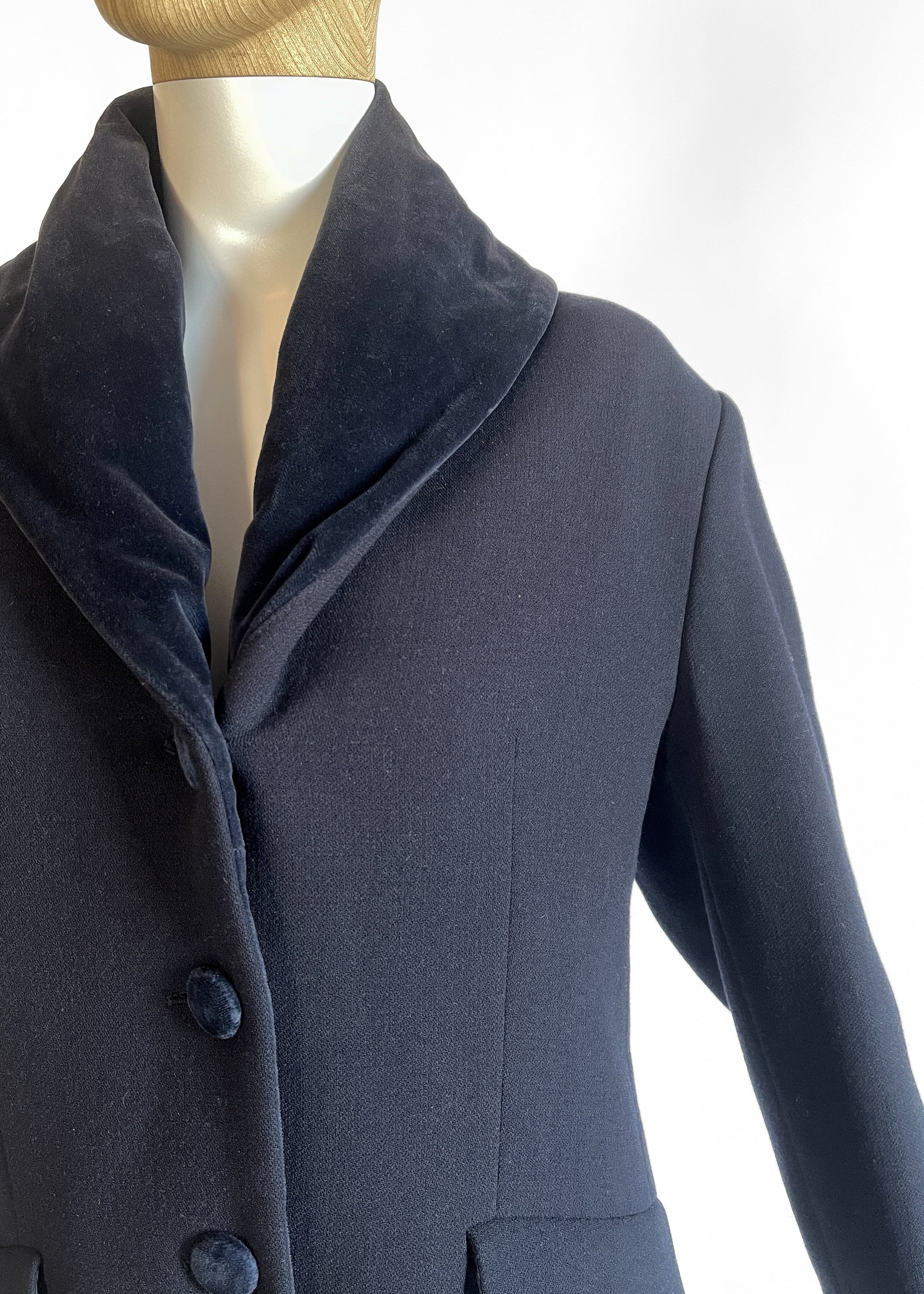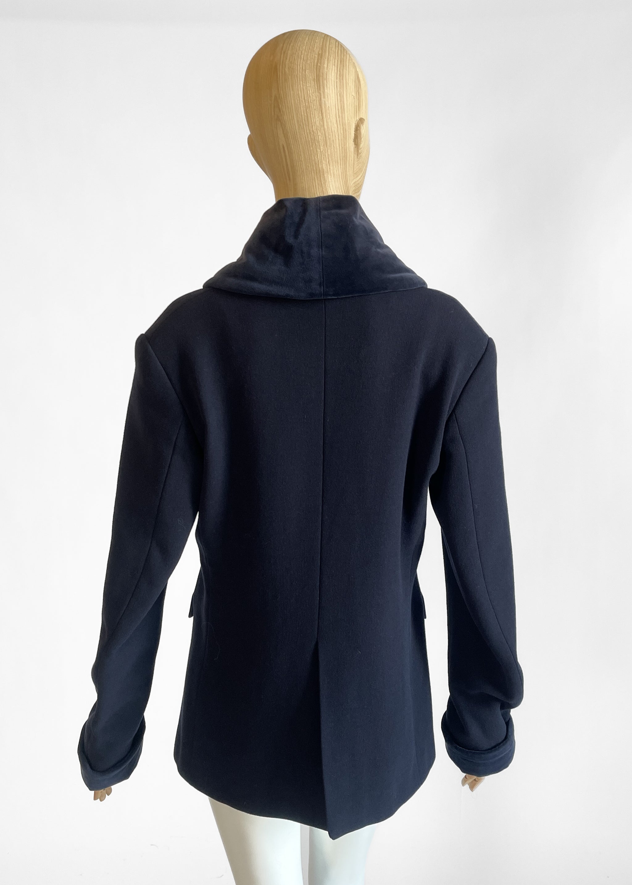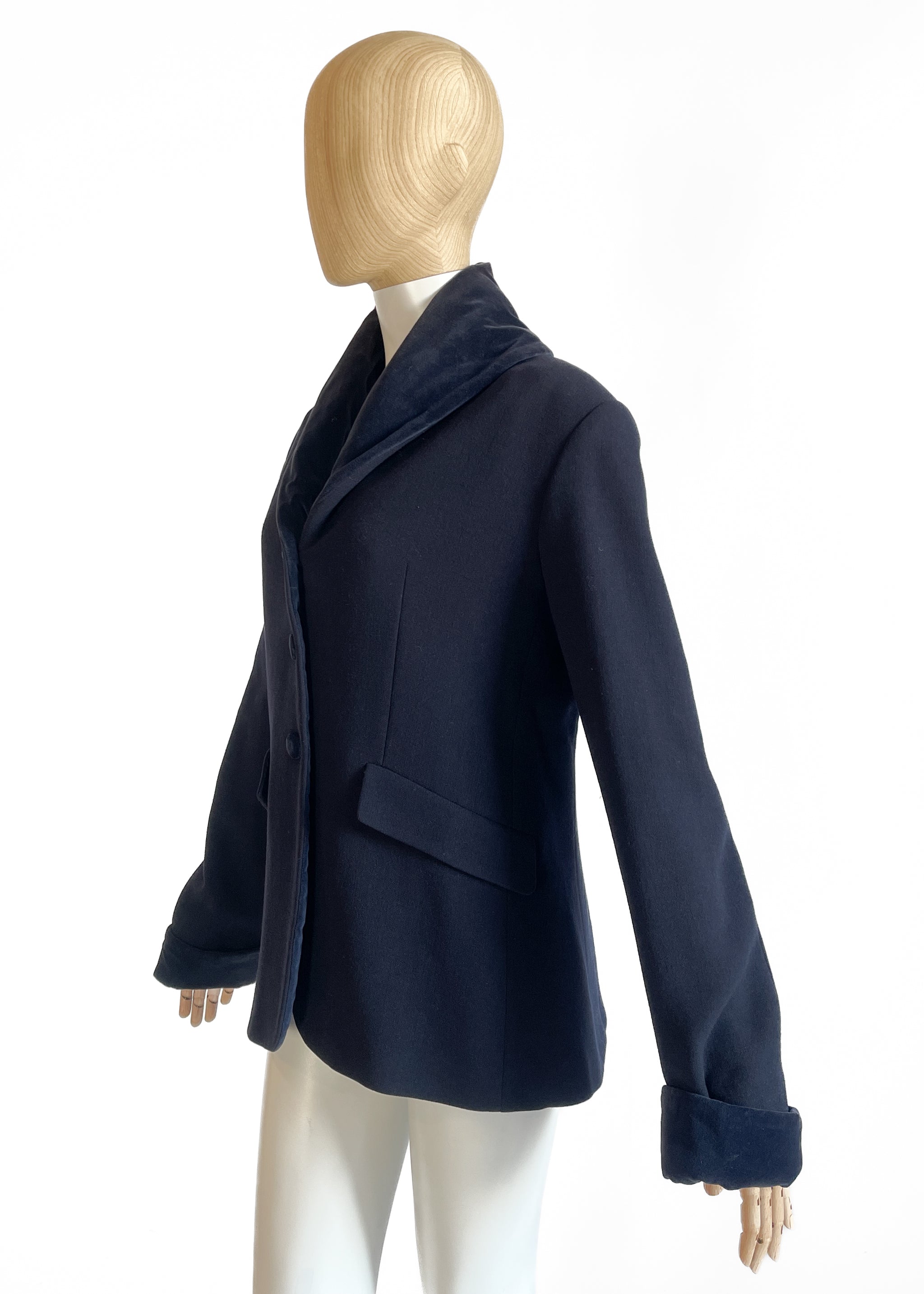 Medium-weight dark blue wool short coat (or blazer) with a velvet shawl collar and cuffs. Three button closure. Lined. Made in Italy. Designed by Romeo Gigli.