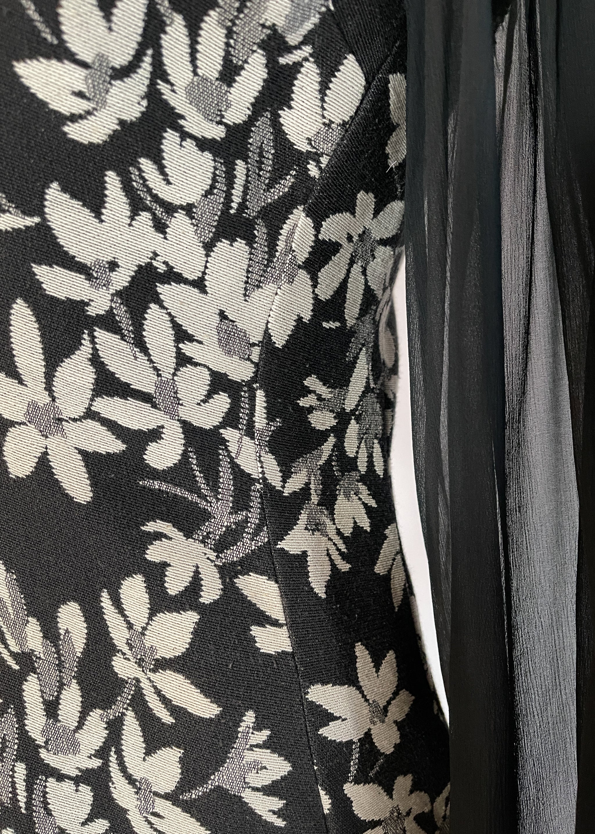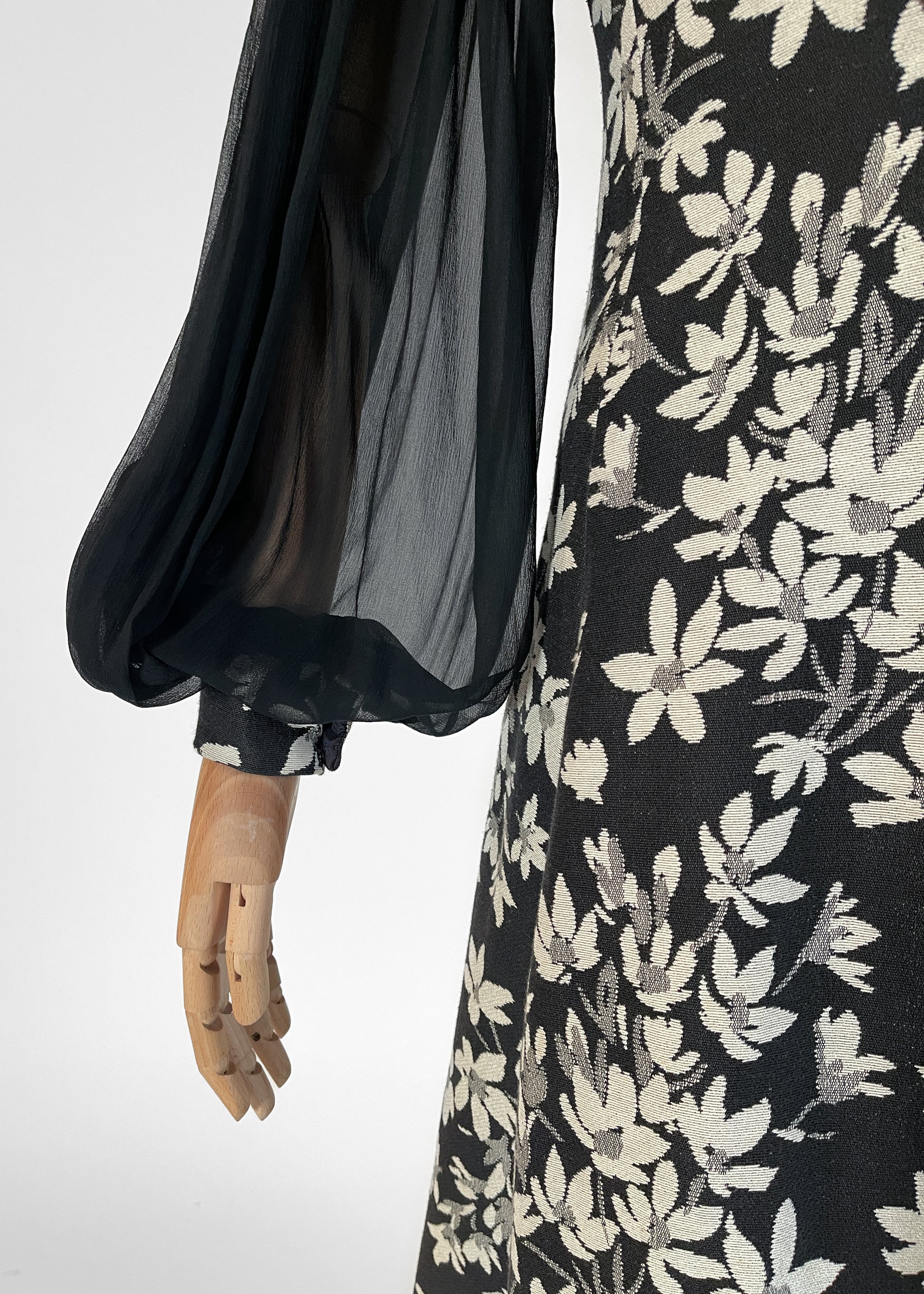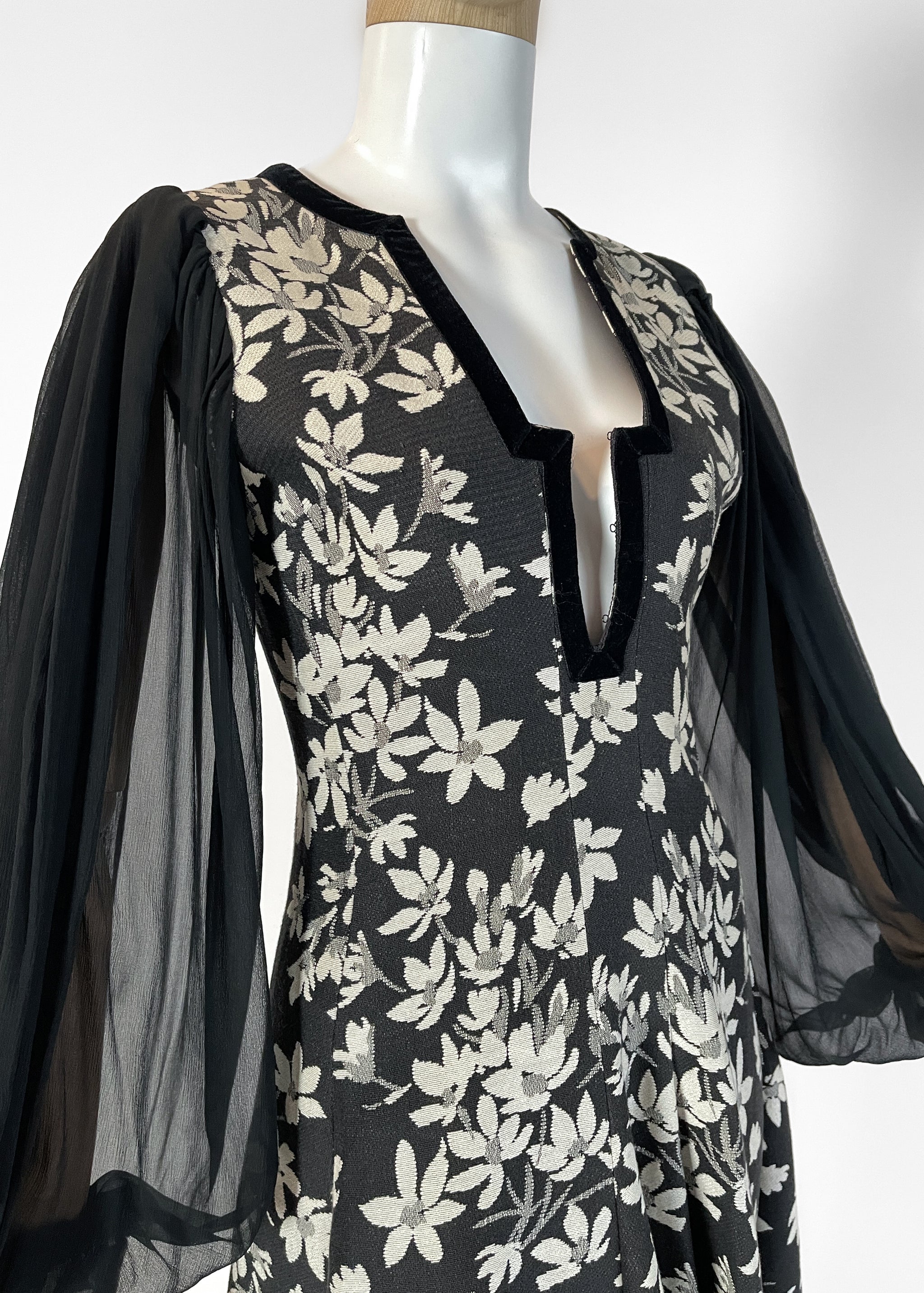 Iconic Thea Porter gypsy-style dress but with a floral tapestry fabric. Medium-weight off-white and black fabric. Velvet trim at the neckline. Sheer black silk sleeves. Fitted through the bodice and flares into a semi-full skirt. Unlined. Back zipper. Made in Great Britain. A fabulous wintery version of her famous gypsy dress.