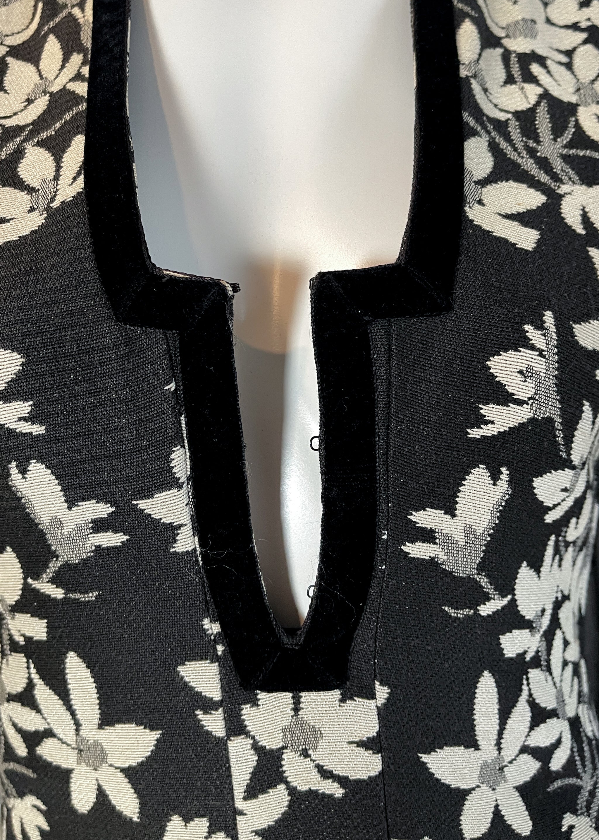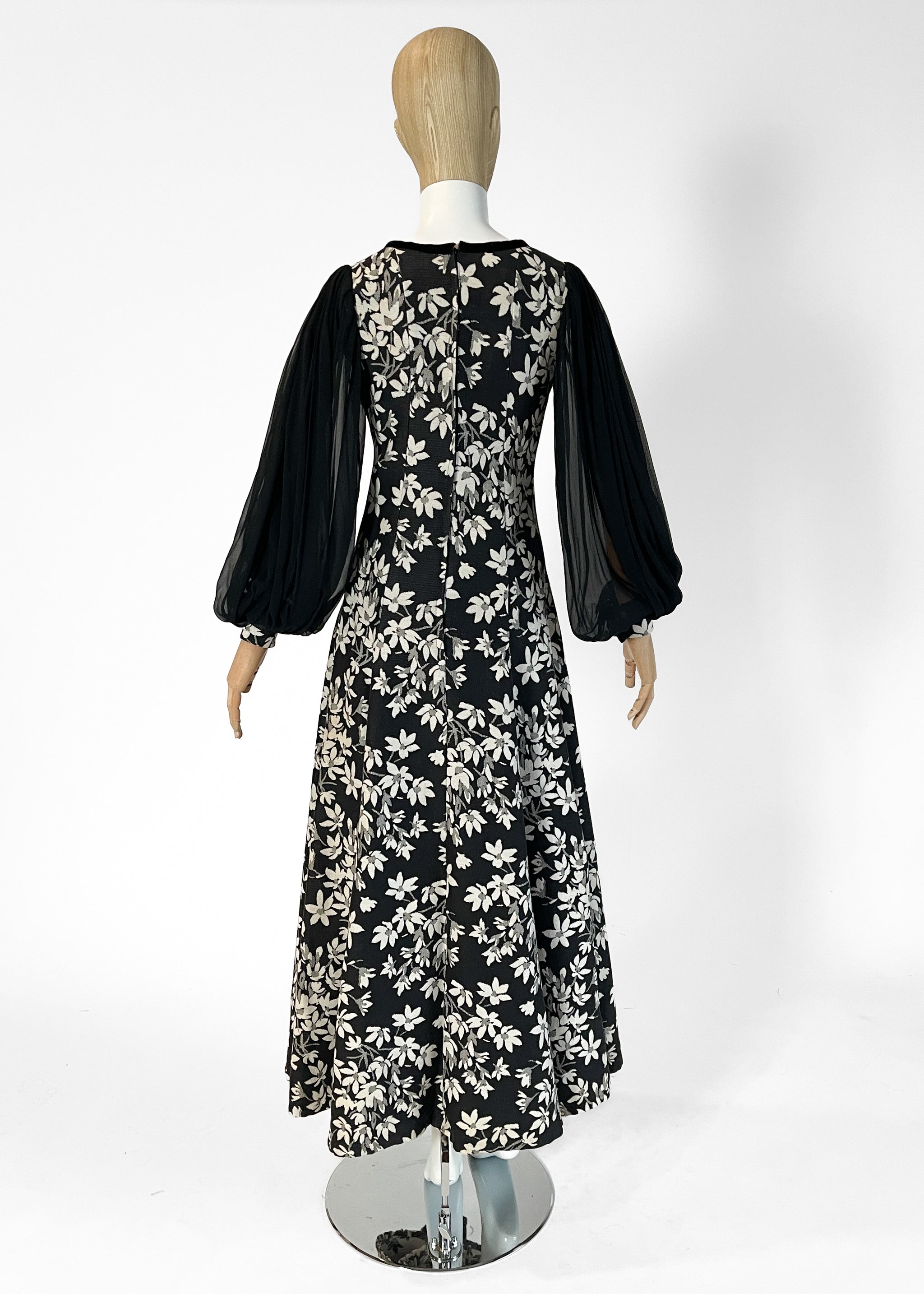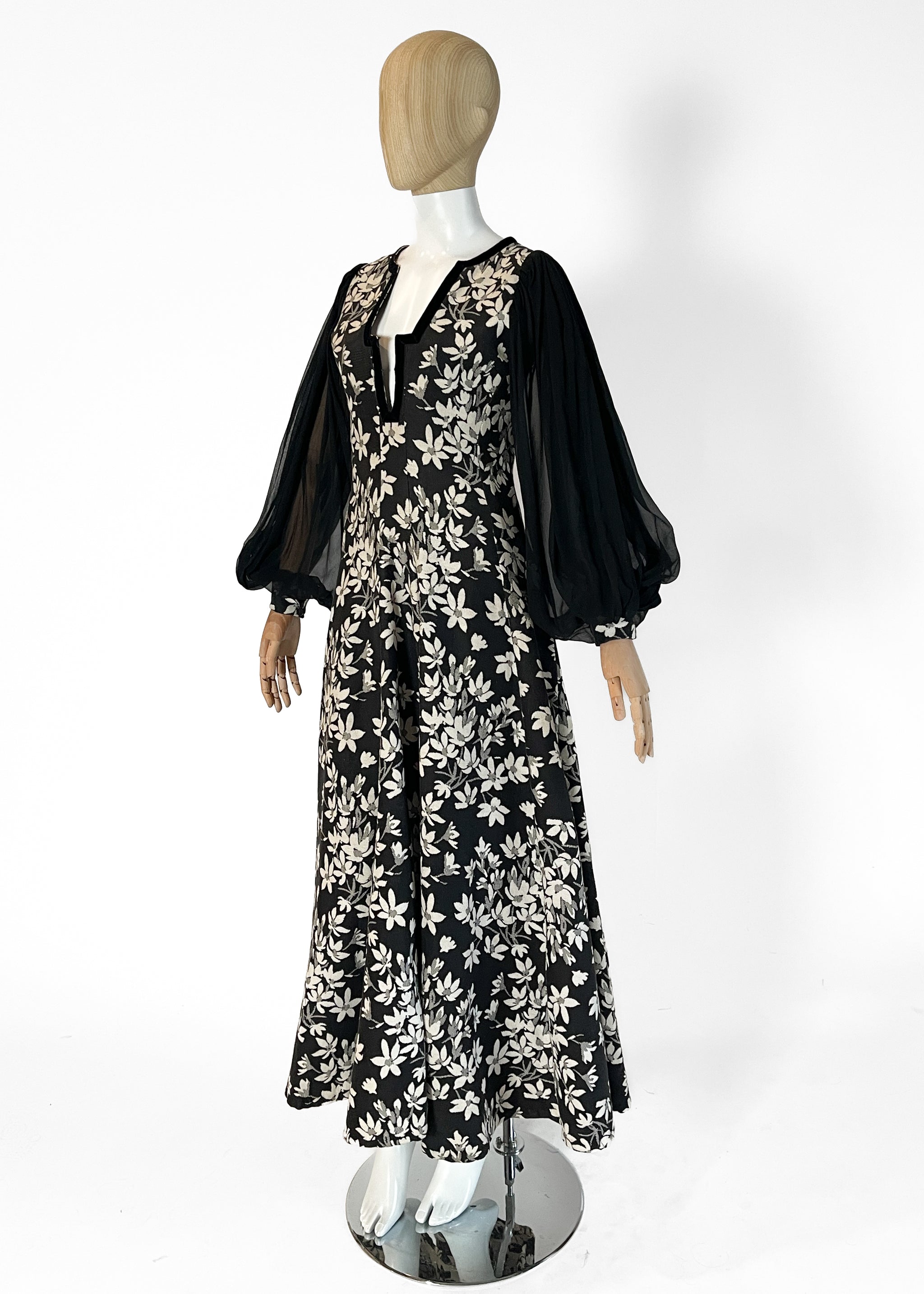Iconic Thea Porter gypsy-style dress but with a floral tapestry fabric. Medium-weight off-white and black fabric. Velvet trim at the neckline. Sheer black silk sleeves. Fitted through the bodice and flares into a semi-full skirt. Unlined. Back zipper. Made in Great Britain. A fabulous wintery version of her famous gypsy dress.
