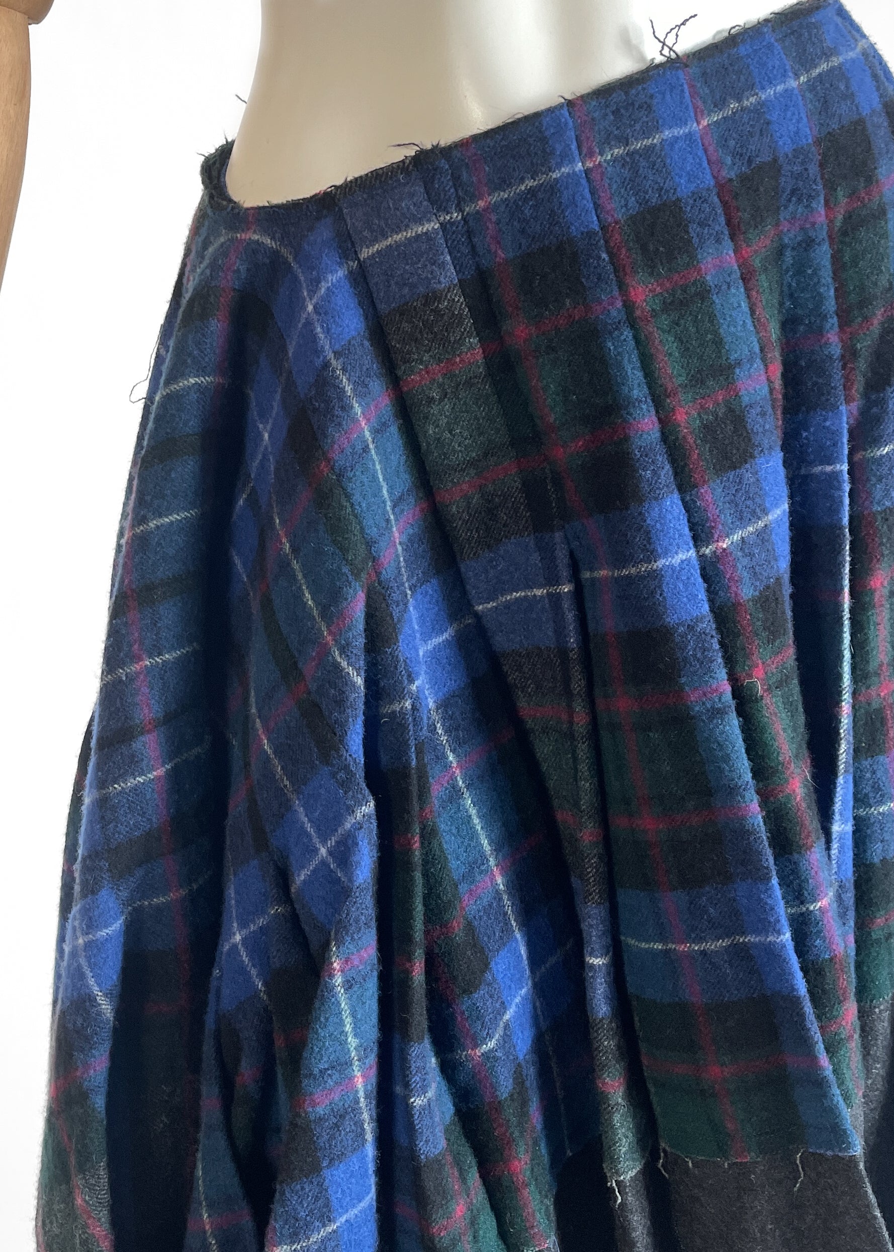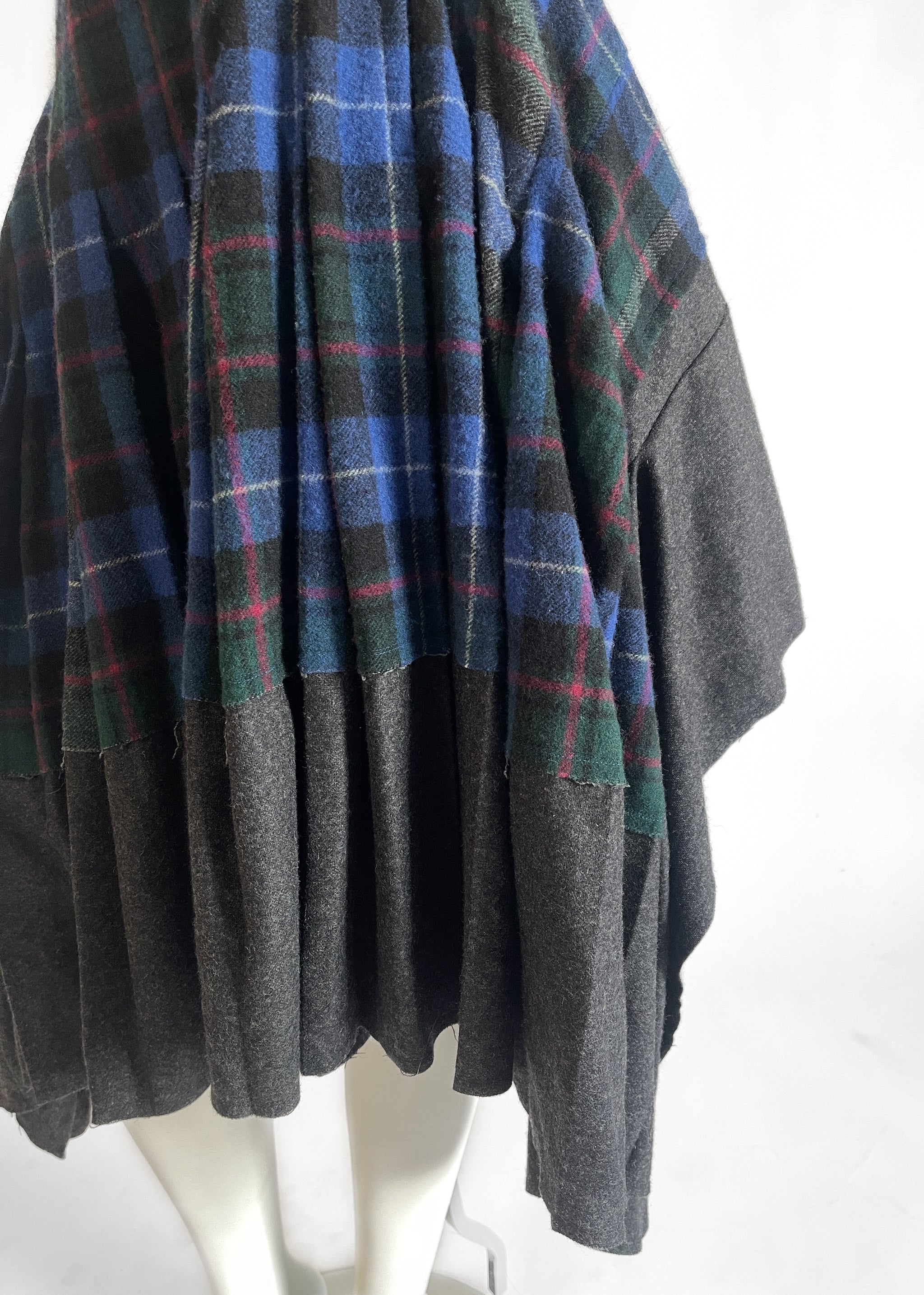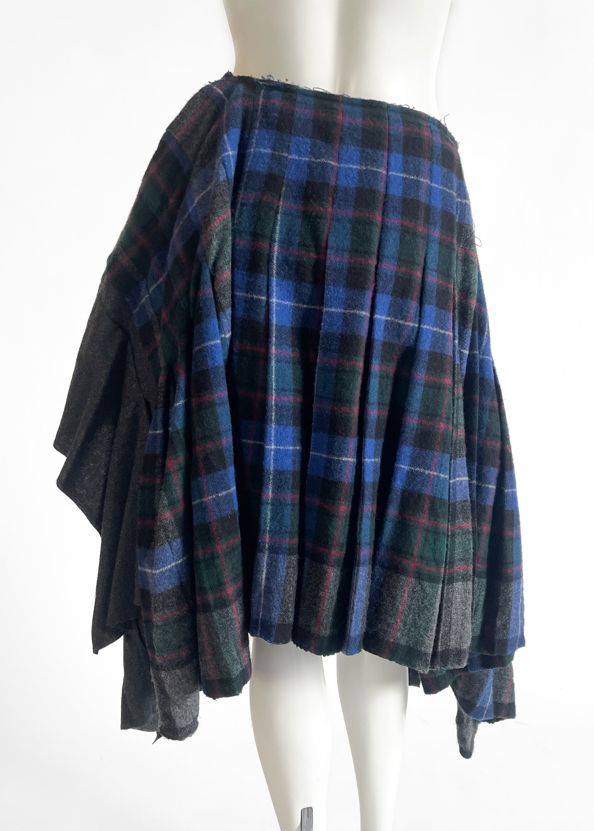 Lightweight wool in a beautiful plaid in blue, red, and grey. The skirt is actually a rectangle so the side drape with extra fabric. Pleated. Kilt-inspired. Asymmetrical waist. Raw hems and seams. Side zipper. Unlined. Made in Japan. Original tags attached. Original retail price $1250.
