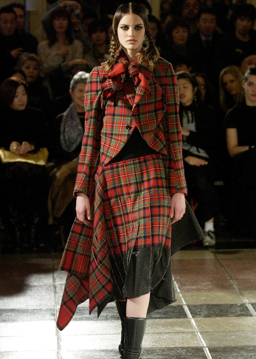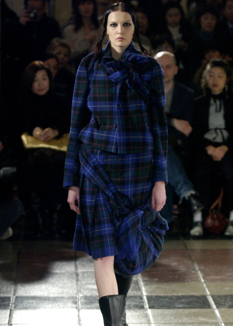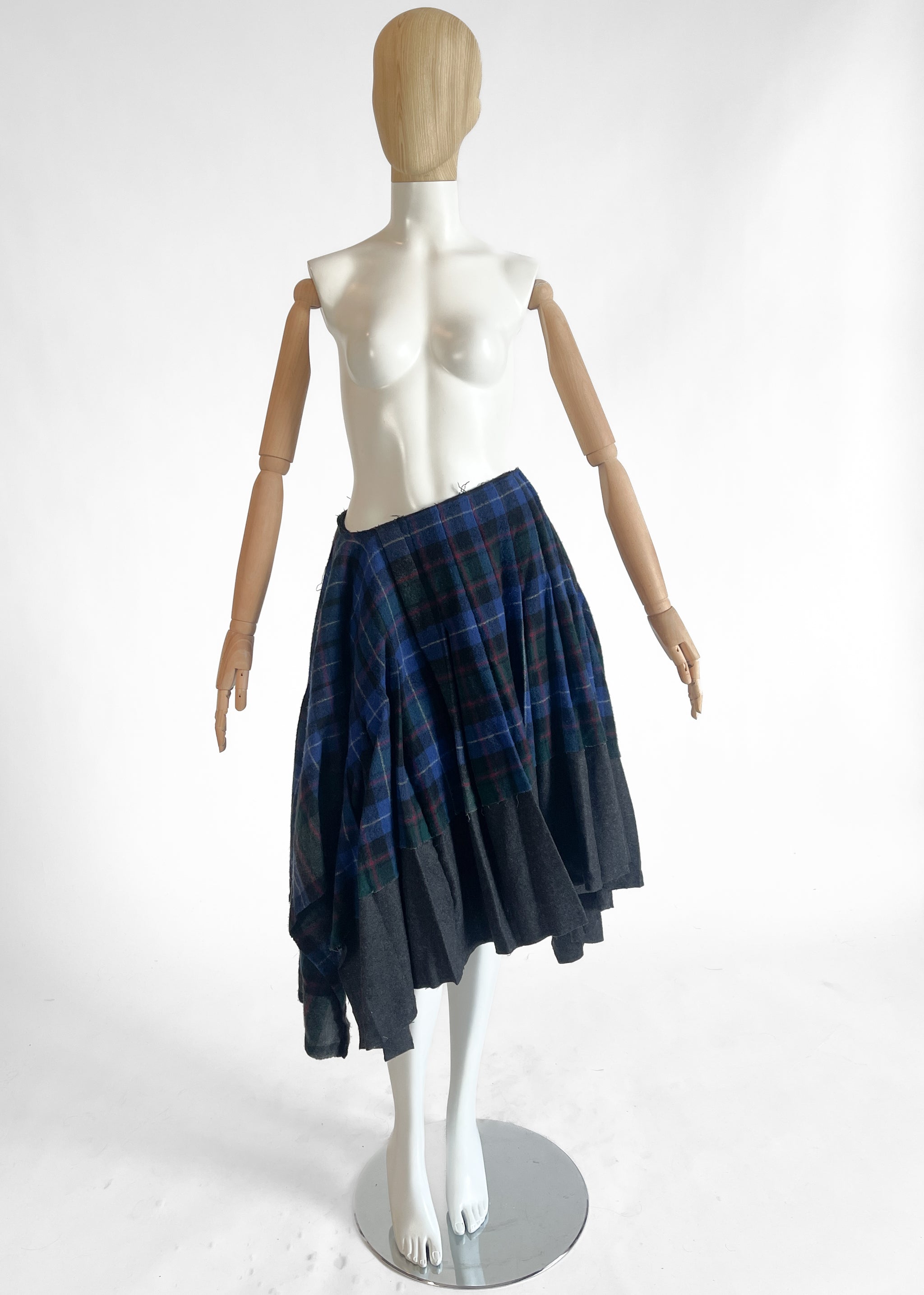 Lightweight wool in a beautiful plaid in blue, red, and grey. The skirt is actually a rectangle so the side drape with extra fabric. Pleated. Kilt-inspired. Asymmetrical waist. Raw hems and seams. Side zipper. Unlined. Made in Japan. Original tags attached. Original retail price $1250.