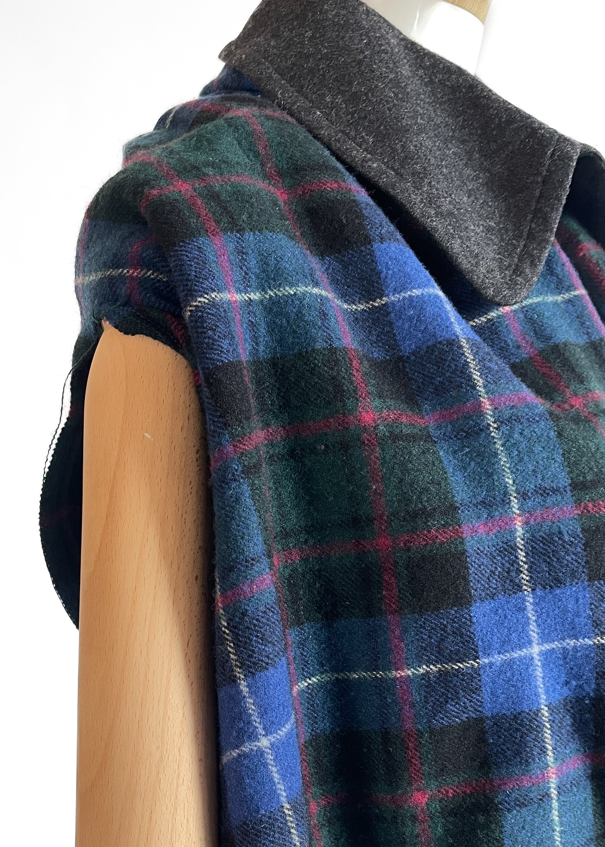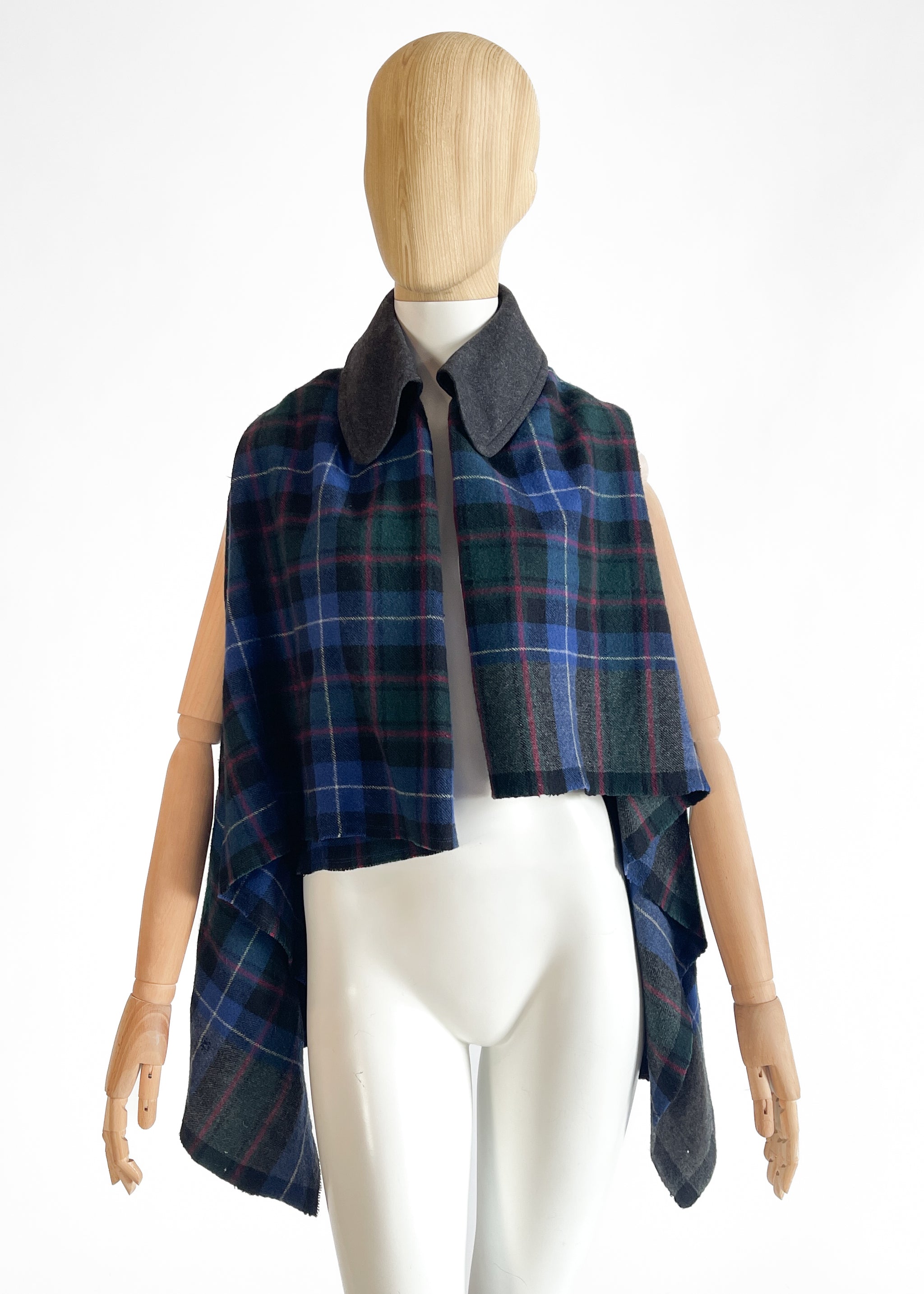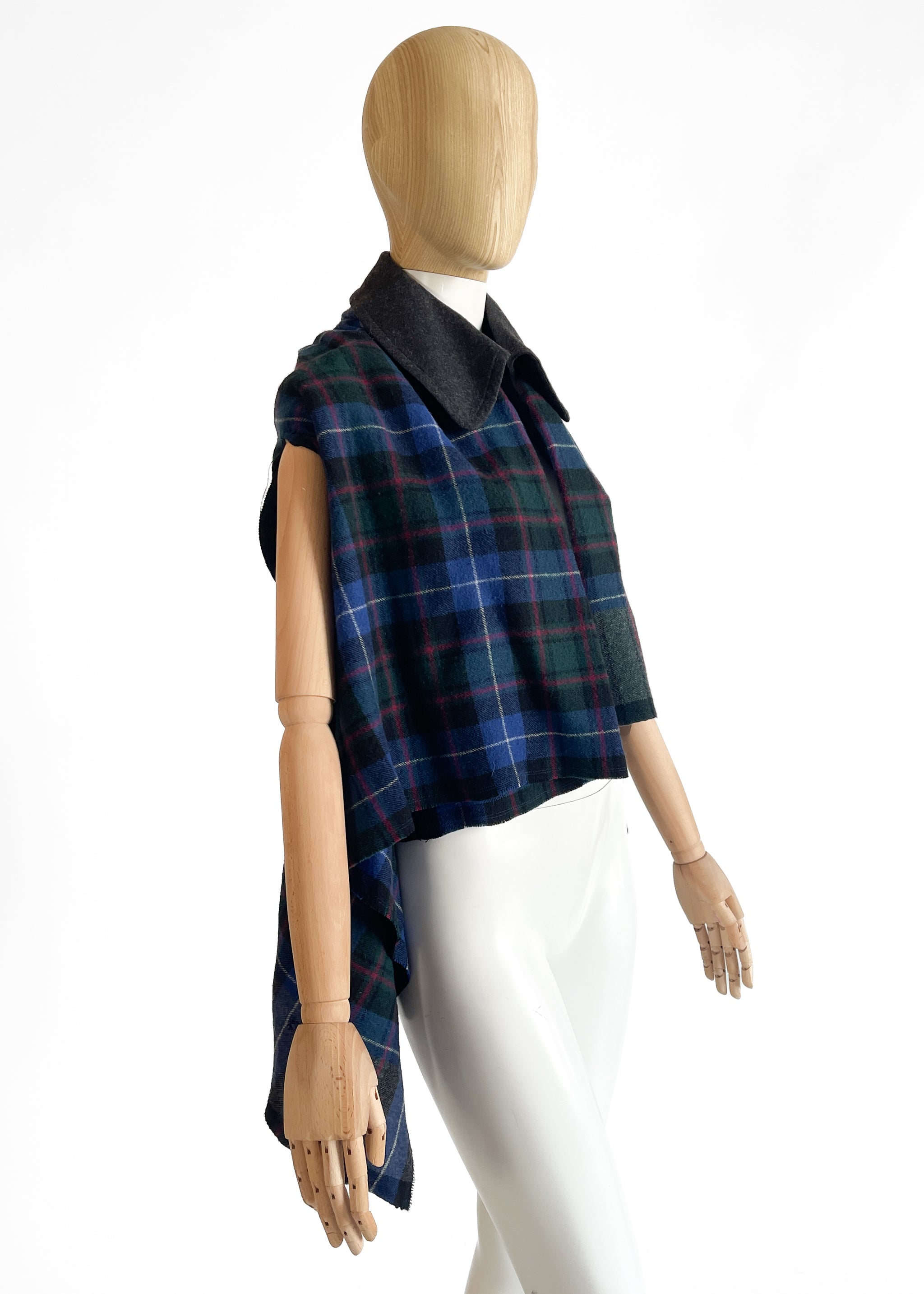 Lightweight wool in a blue plaid draping vest. Can be wrapped, belted, and tied in various ways. Raw hems. Unlined. Open front. Made in Japan.